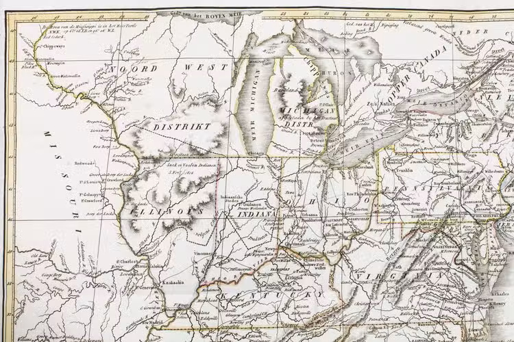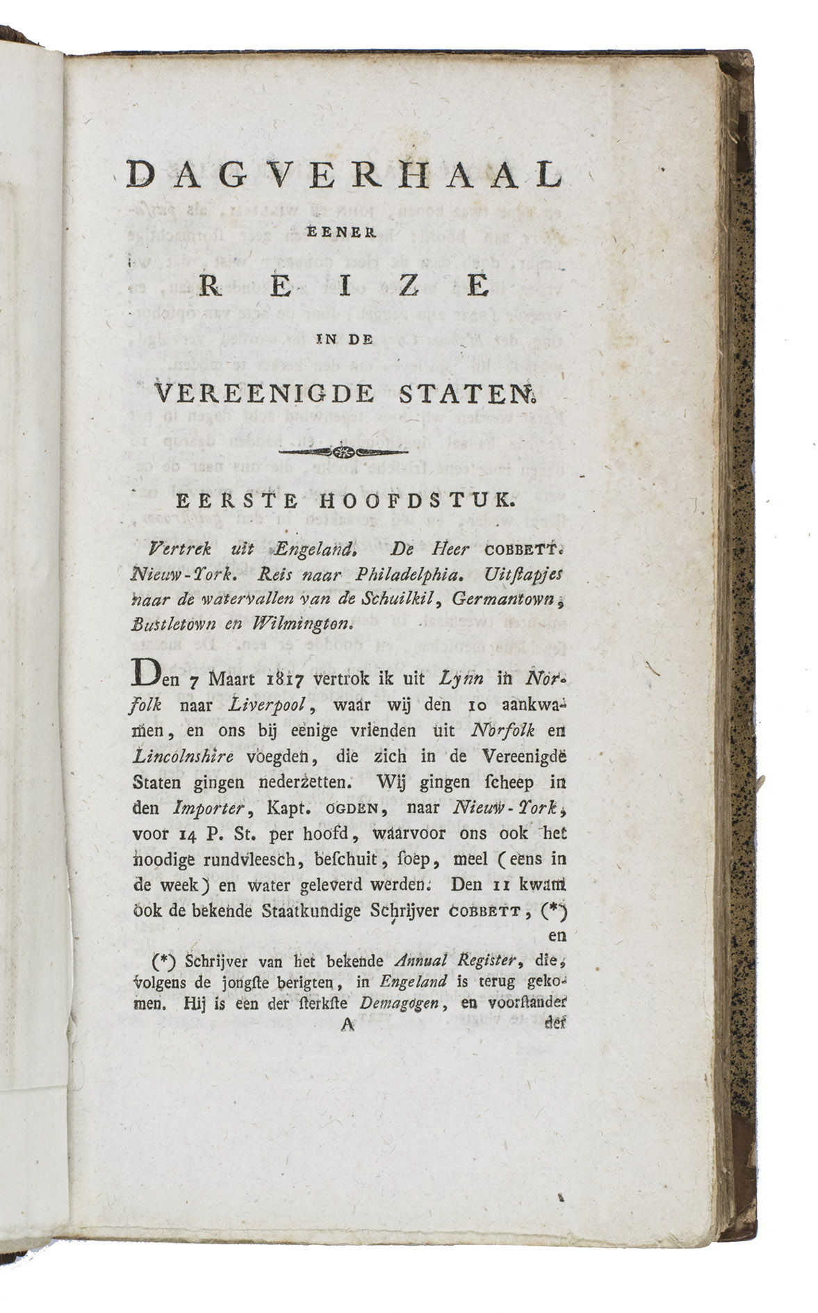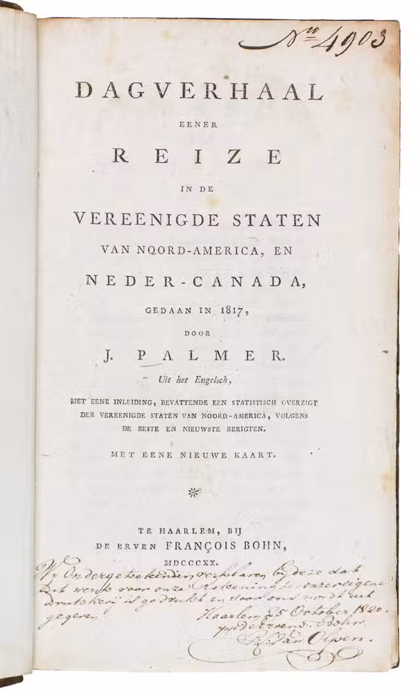 First and only edition of the Dutch translation of a journal of a journey through North America and southern Canada by John Palmer, illustrated with an engraved map of North America, hand-coloured in outline. The extensive introduction gives a short statistical survey of North America. On 28 March 1817 Palmer set sail from Liverpool bound for the United States, together with William Cobbett. He visited New York, Washington, Pittsburgh, Cincinnati, Tennessee, Ohio, Kentucky, Virginia, Indiana, Missouri, Quebec and more. The journal is of special interest for the contemporary prices of land and provisions, the observations on the country and the people, and the descriptions of the trade and commerce of the principal towns. "Mr. Palmer travelled through ... the greater part of the country he describes; but he confesses that the outlines of his travels were filled up from other books. A plain man of good sense and slow judgment" (Sabin).