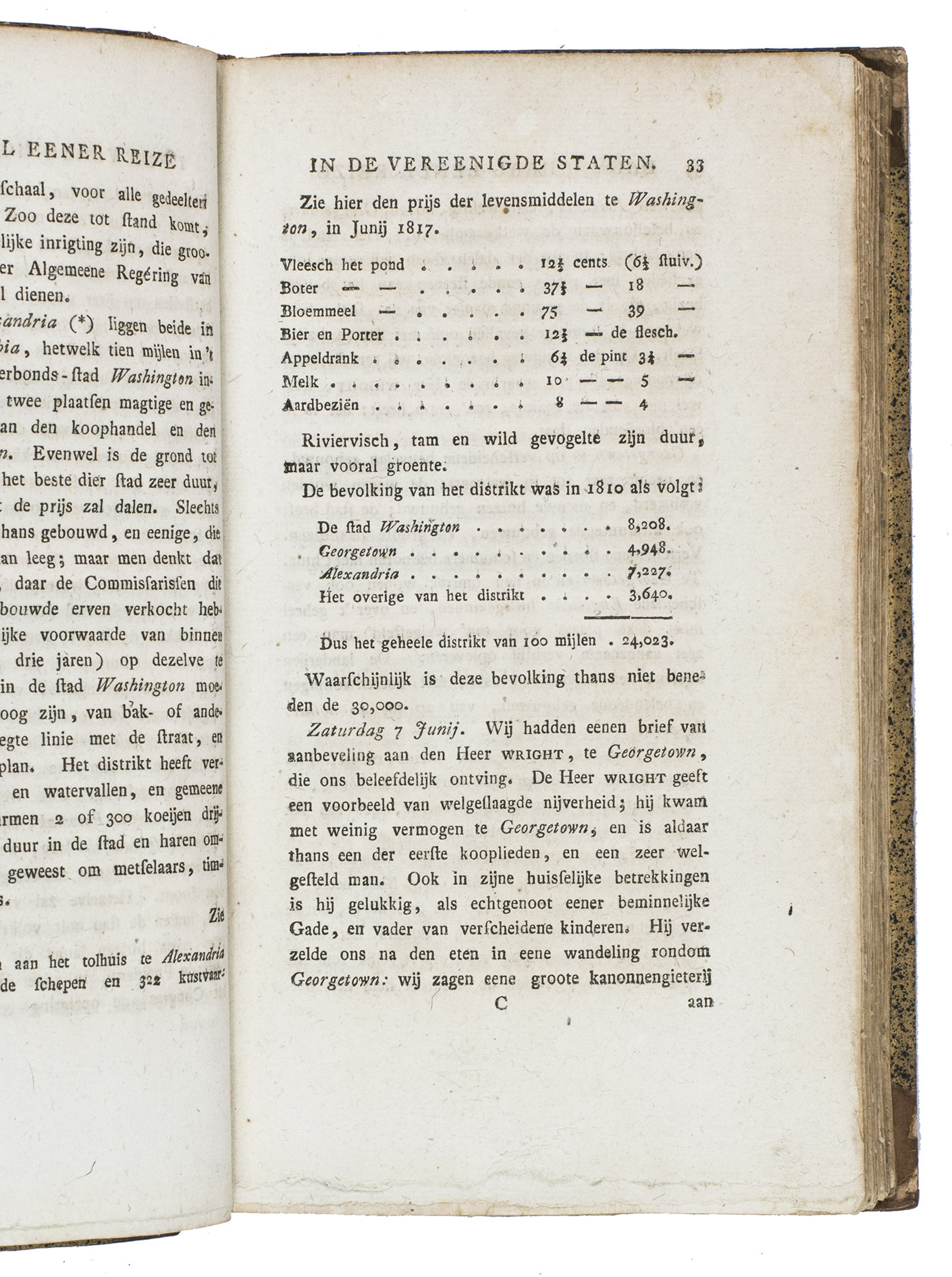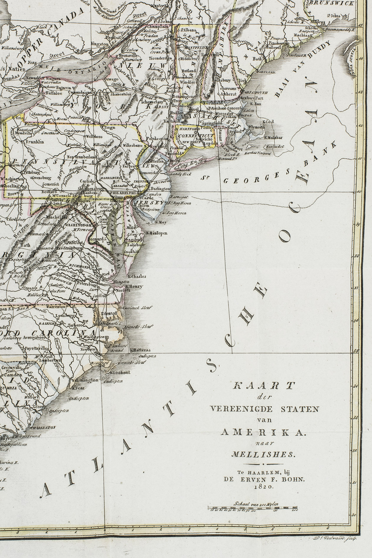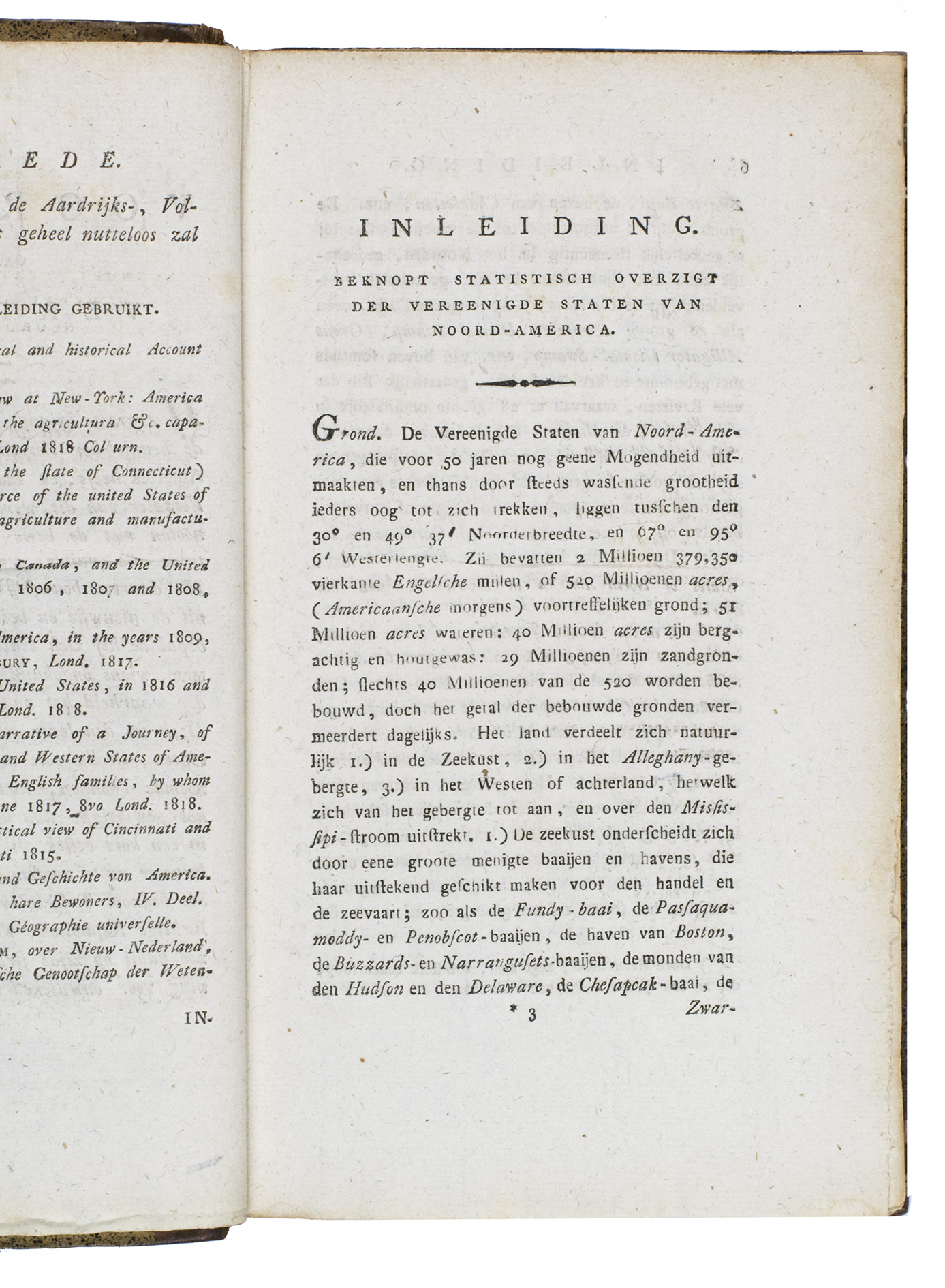 Haarlem, heirs of François Bohn, 1820. 8vo. With large folding map of America (34.5 x 44.5 cm), engraved by D. Veelwaard after John Melish, borders and outlines in contemporary hand-colouring. Contemporary half calf. 44, 318, [4] pp.