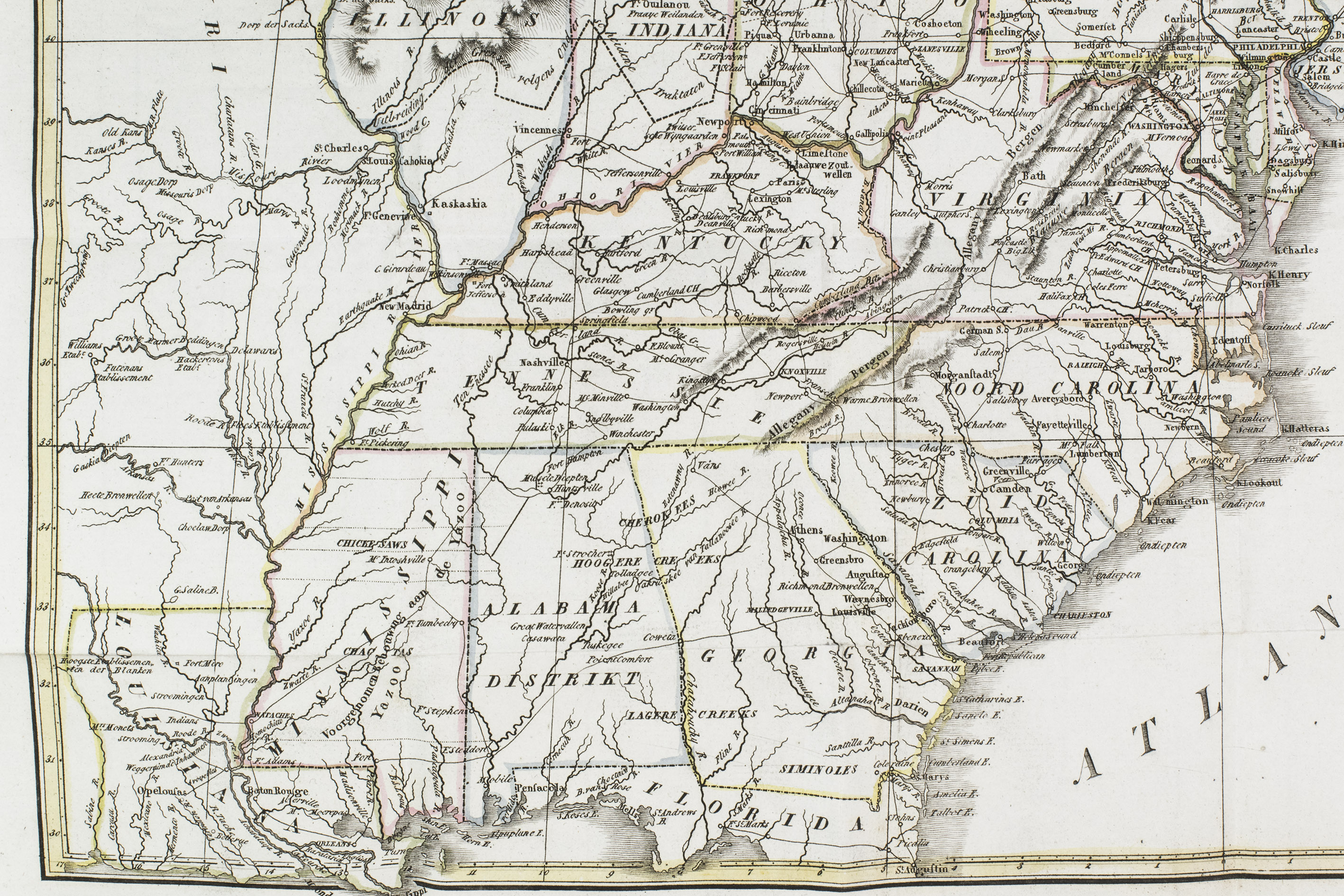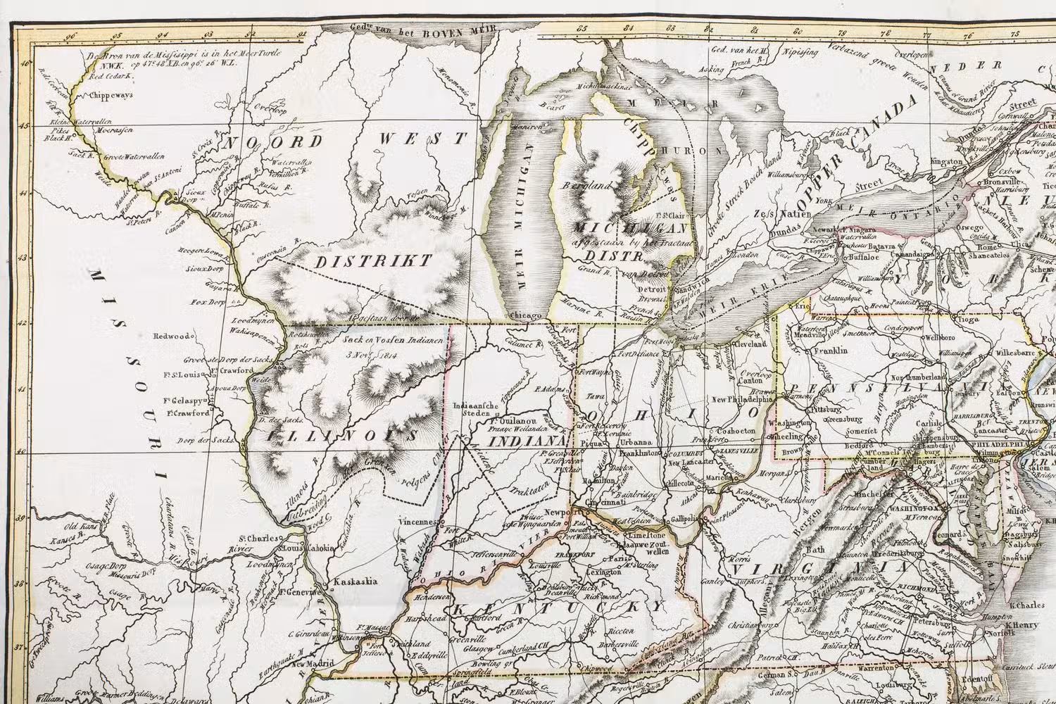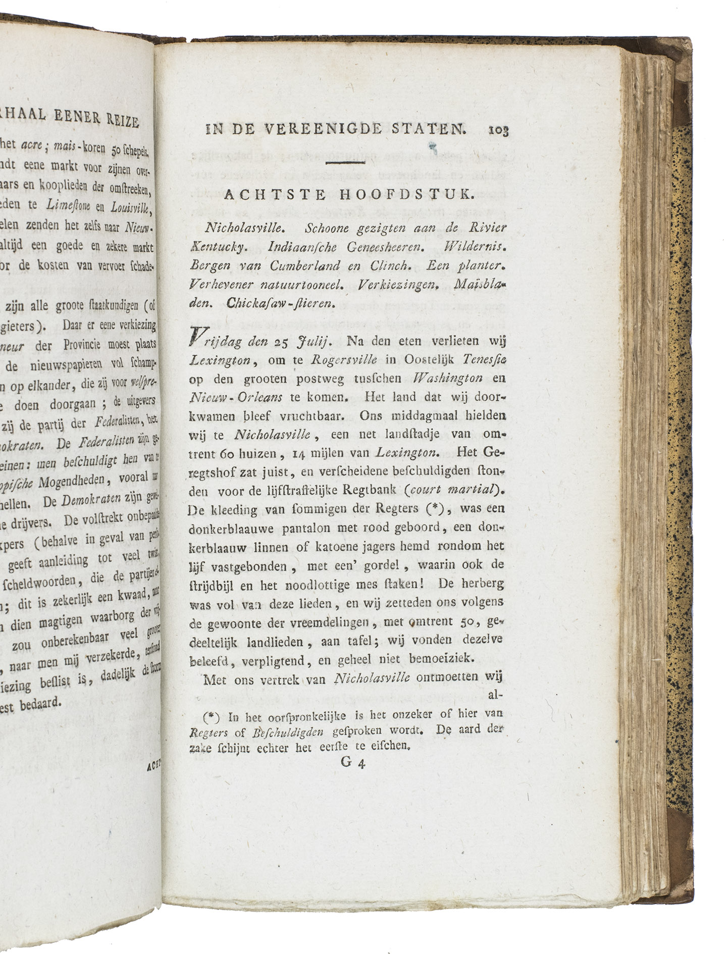 Haarlem, heirs of François Bohn, 1820. 8vo. With large folding map of America (34.5 x 44.5 cm), engraved by D. Veelwaard after John Melish, borders and outlines in contemporary hand-colouring. Contemporary half calf. 44, 318, [4] pp.