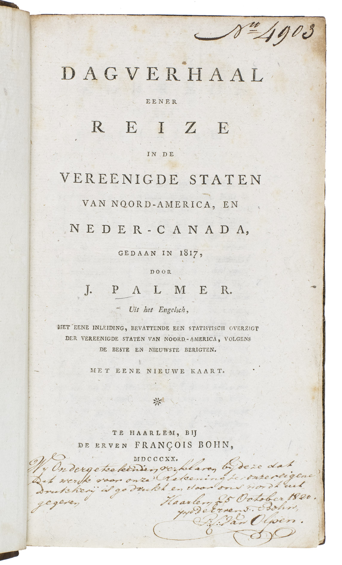 With a note from the manager of the publishing house (heirs of François Bohn) on title-page, explicitly declaring (probably for a tax-acknowledgement) in the lower margin in brown ink that the book was printed in Bohn's own printing house at Bohn's own expense, signed: P.C. van Olpen, Haarlem, 25 October 1820. Some occasional foxing, otherwise in very good condition. Binding rubbed along the extremities, but otherwise good. Clark, Old South II, 227; Howes P49; Sabin 58362.