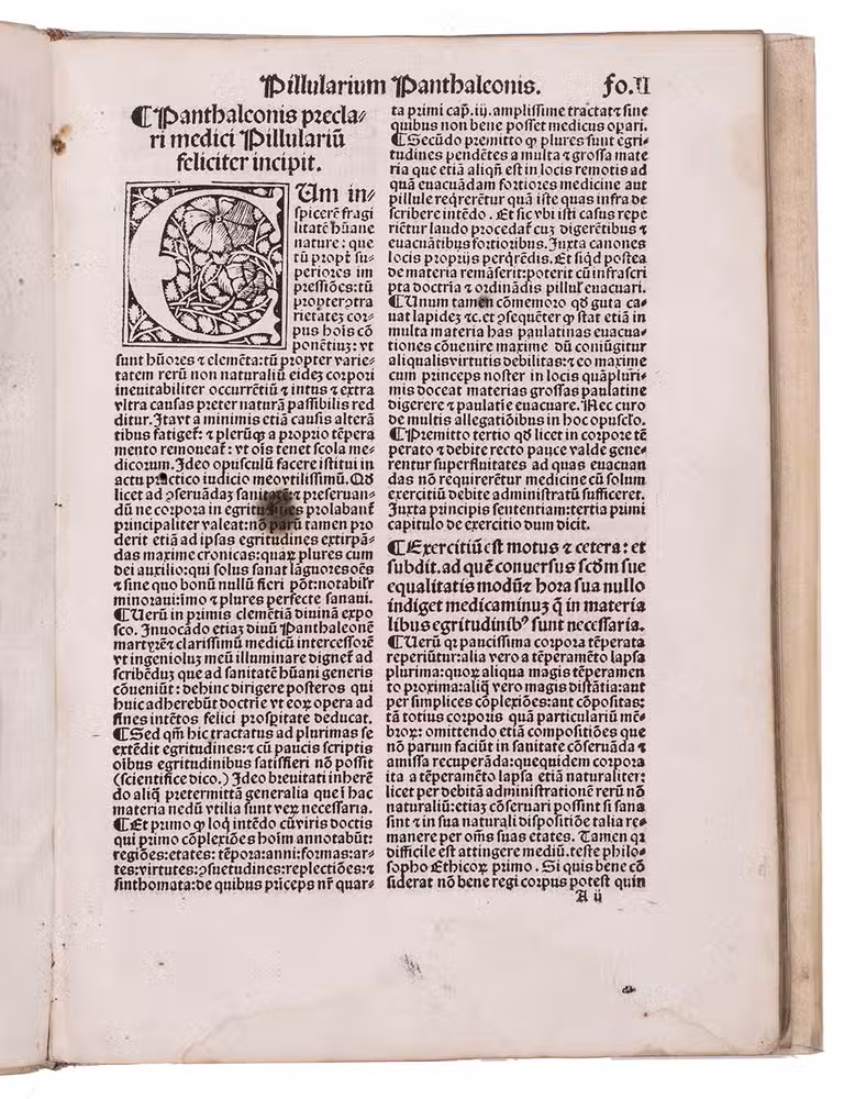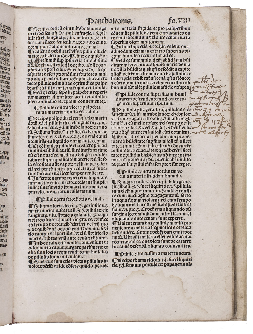 The first, Pillarium by Pantaleone di Confienza, is one of the earliest treatises dealing exclusively with pills as remedies for all kinds of diseases. He treats all kinds of aspects of pills, including their various (natural) substances of pills, their various forms (powders, tablets, tinctures, extracts, etc.), their physiological and pathological effects, the preparation and conservation, etc.