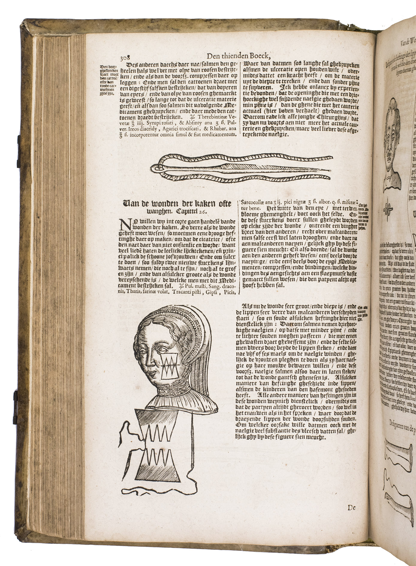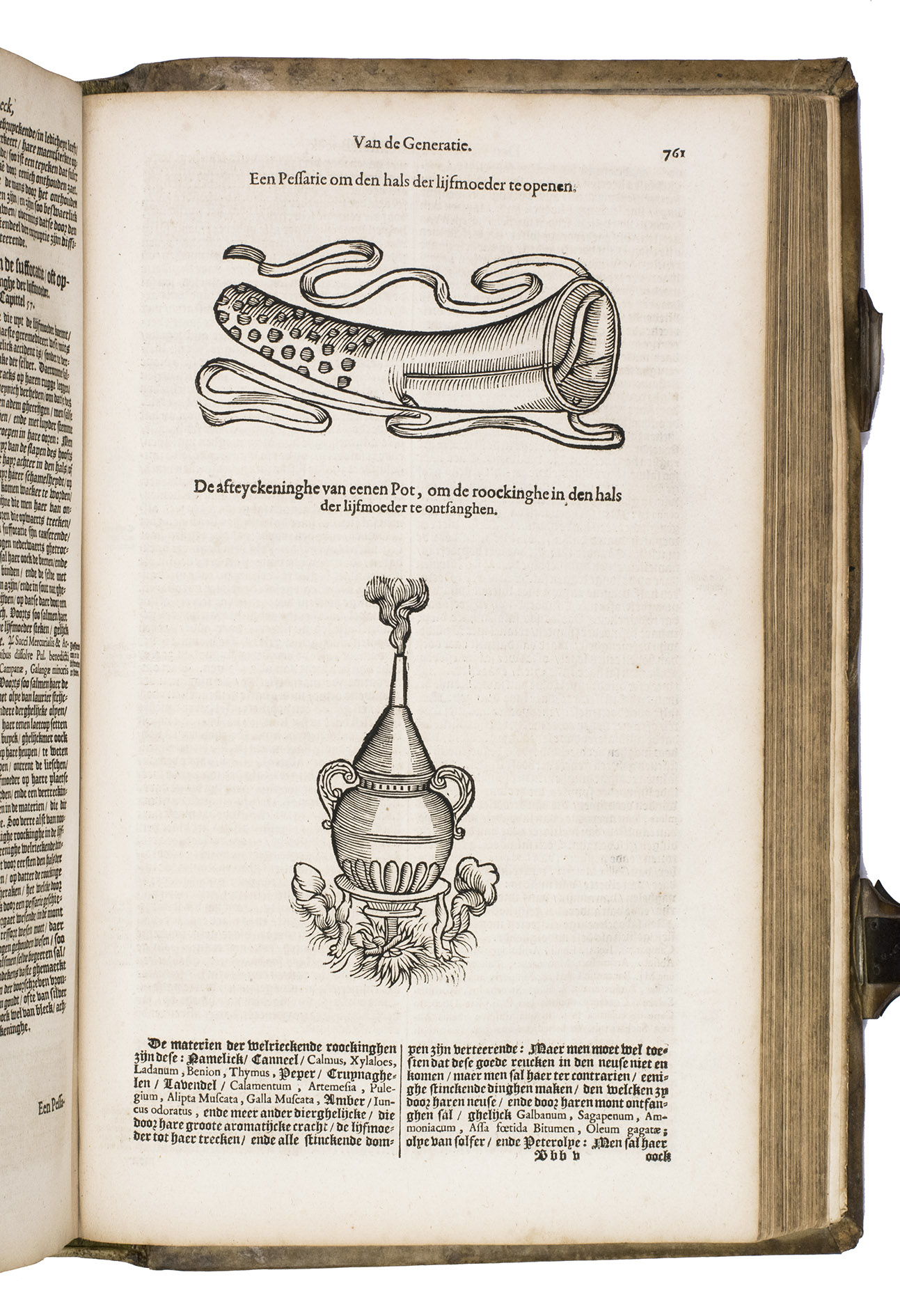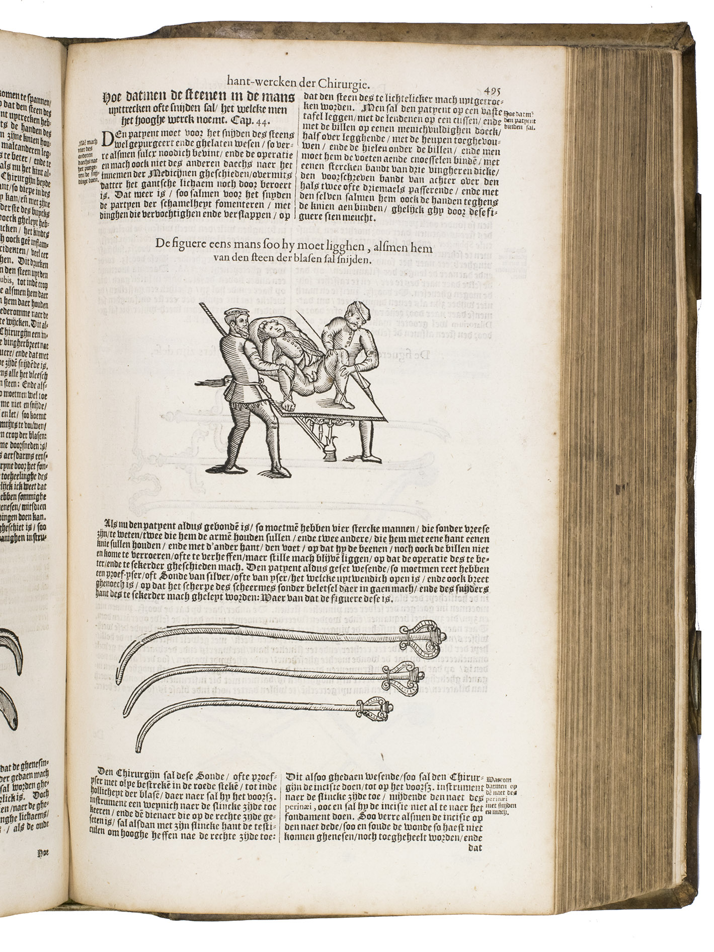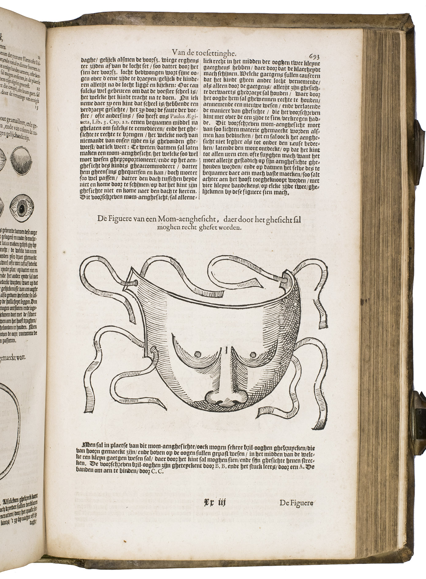 With the label of the Oudheidkamer Twente on the spine, and the stamp of this library on the recto of the first free flyleaf, an ownership entry on the very of the same leaf. The vellum is somewhat browned and rubbed, with a stain in the lower left corner of the front board, lacking one of the clasps. Some of the leaves are lightly (water) stained, without affecting the text or illustrations. Otherwise in good condition. Bibl. Med. Neerl. I, p. 288; Doe, Bibl. of Paré, 66; STCN 088354946 (1 copy); cf. Wellcome Library I, 4819-25 (French, Latin & English eds.); Garrison & Morton 5565 (French 1575 ed.); Heirs of Hippocrates 163 (French 1579 ed.); Krivatsy 8599-602 (Dutch eds.).