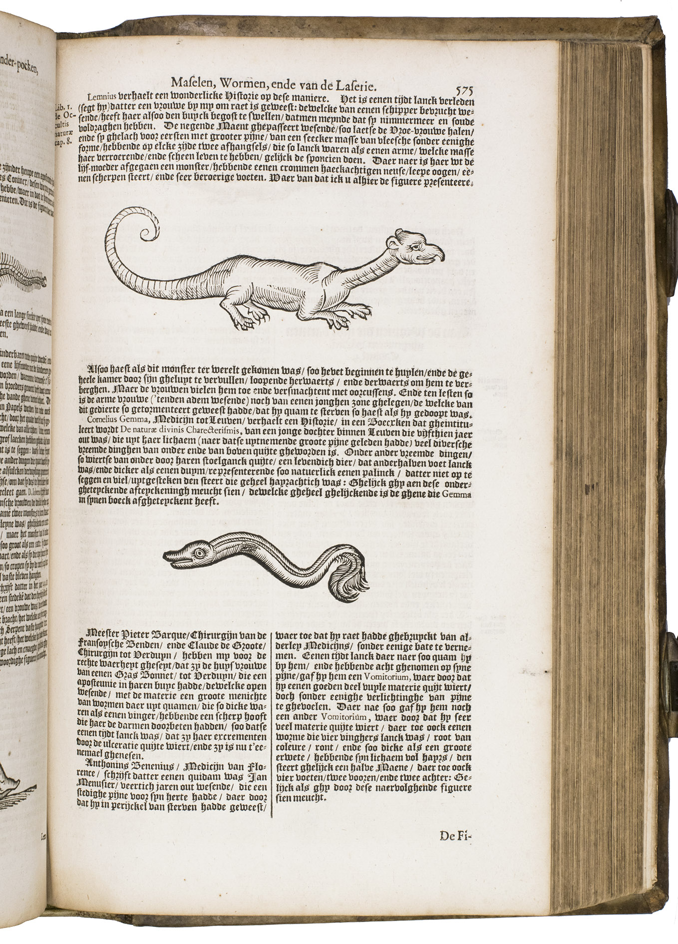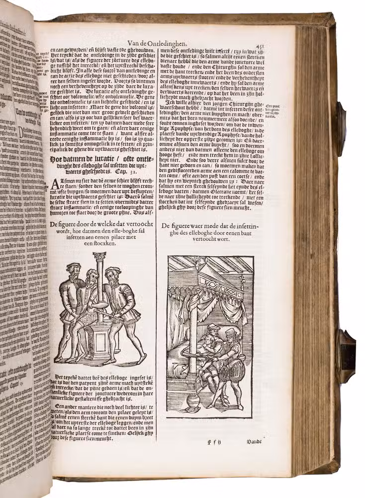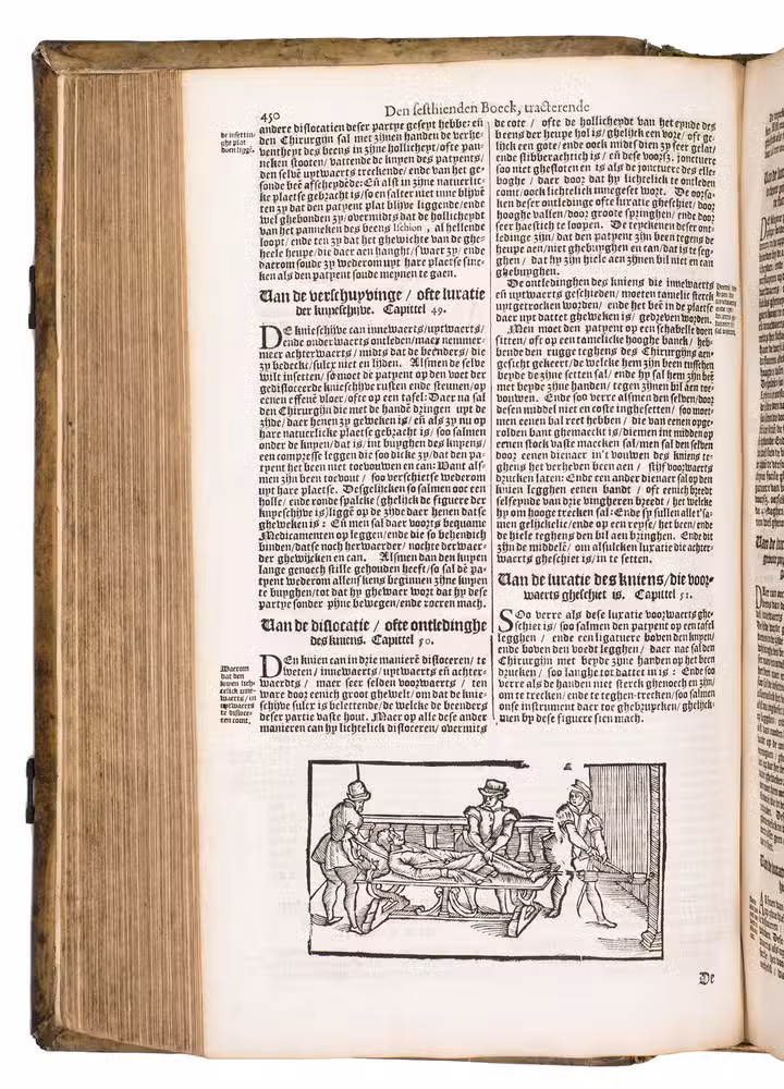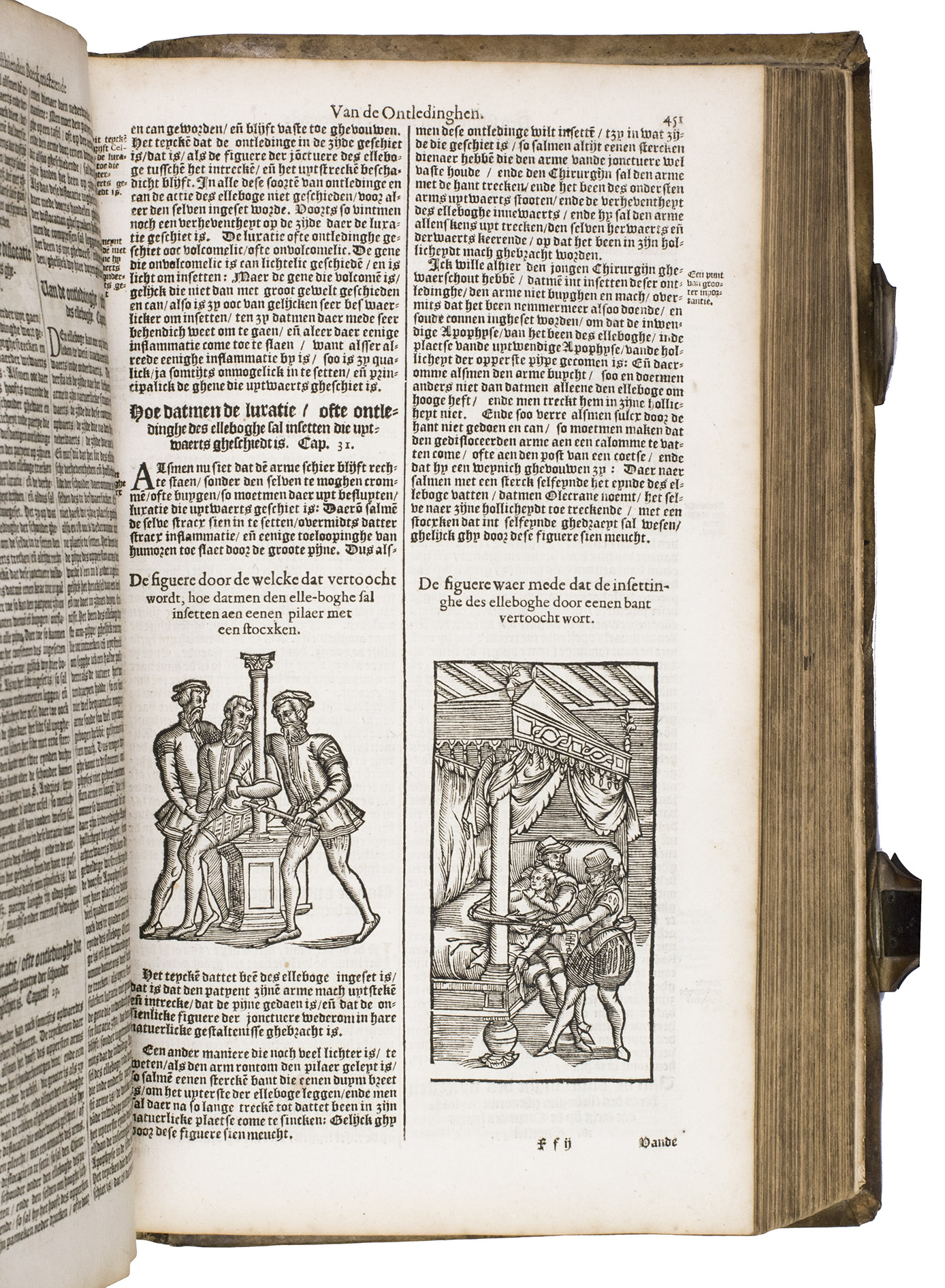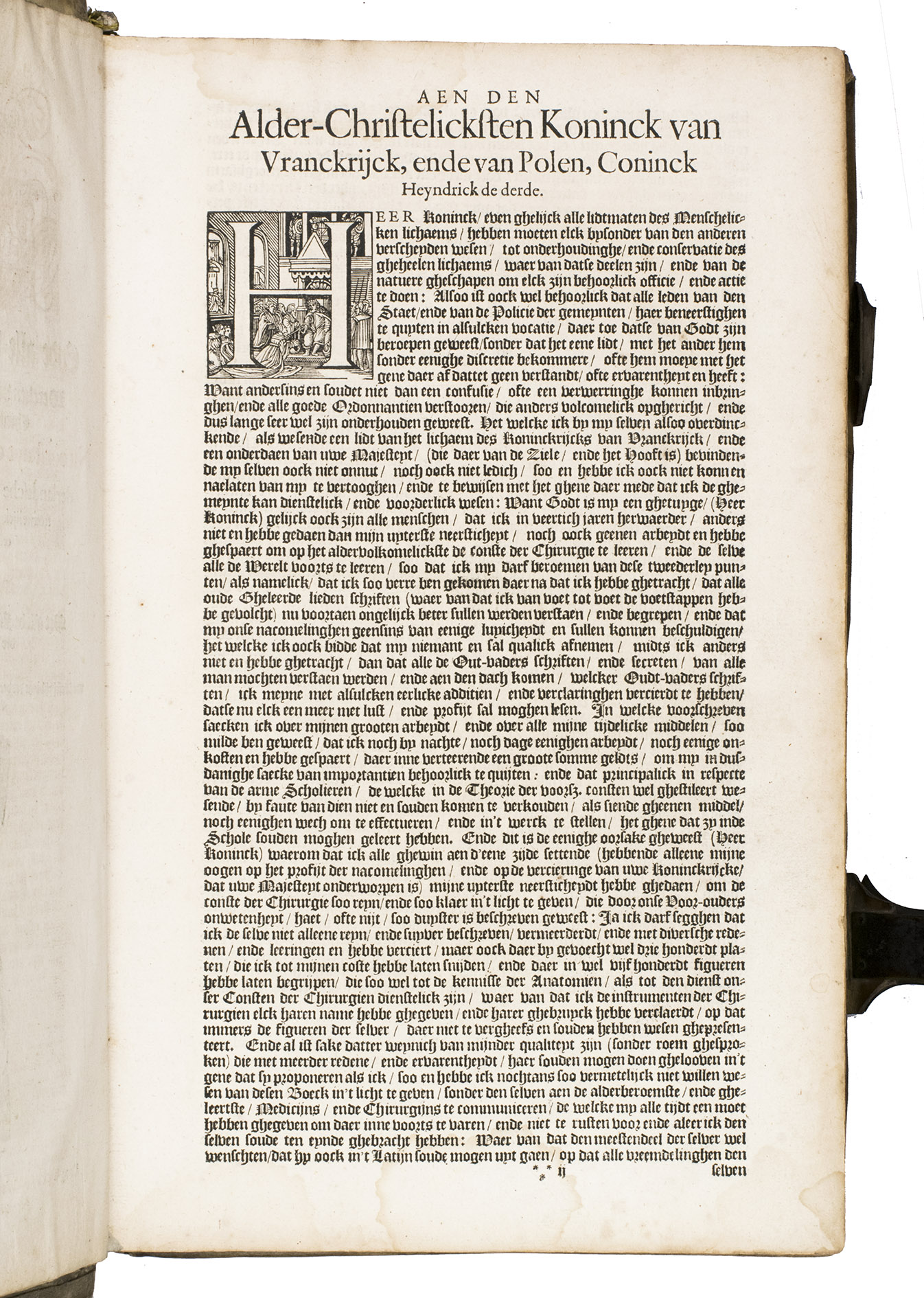 With the label of the Oudheidkamer Twente on the spine, and the stamp of this library on the recto of the first free flyleaf, an ownership entry on the very of the same leaf. The vellum is somewhat browned and rubbed, with a stain in the lower left corner of the front board, lacking one of the clasps. Some of the leaves are lightly (water) stained, without affecting the text or illustrations. Otherwise in good condition. Bibl. Med. Neerl. I, p. 288; Doe, Bibl. of Paré, 66; STCN 088354946 (1 copy); cf. Wellcome Library I, 4819-25 (French, Latin & English eds.); Garrison & Morton 5565 (French 1575 ed.); Heirs of Hippocrates 163 (French 1579 ed.); Krivatsy 8599-602 (Dutch eds.).