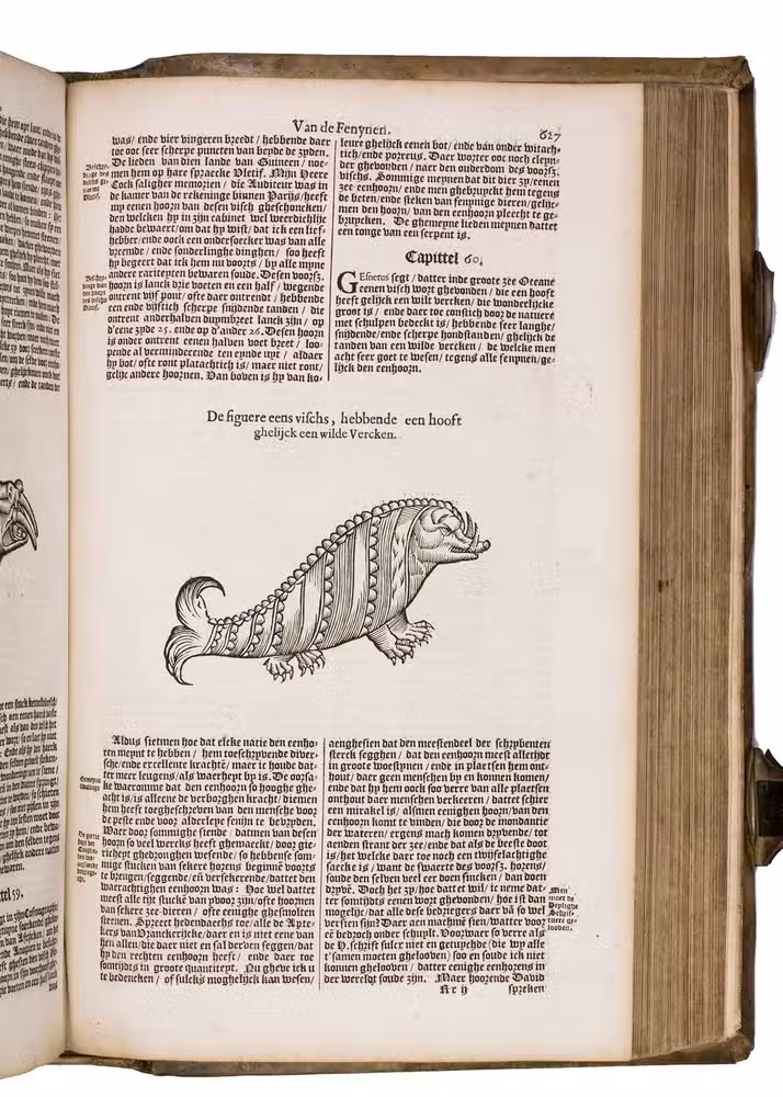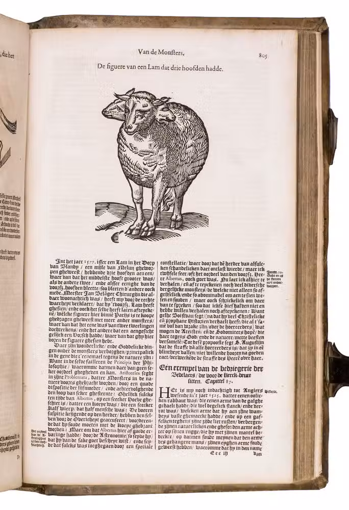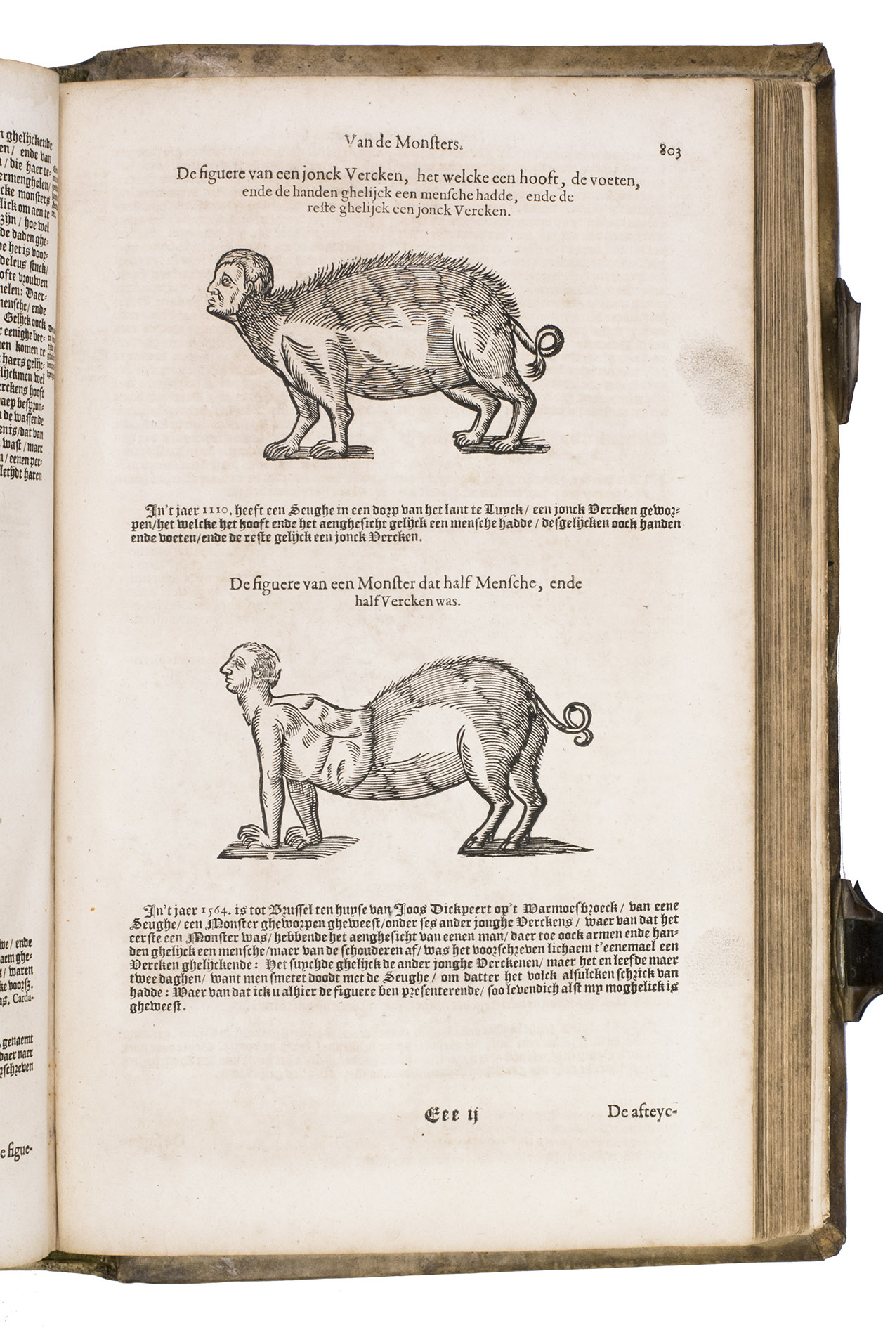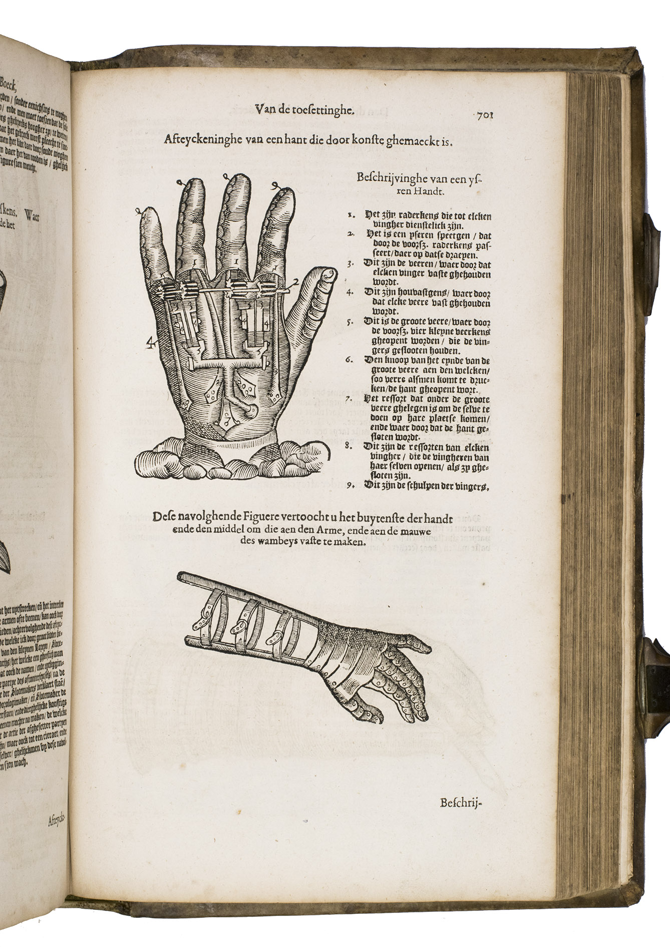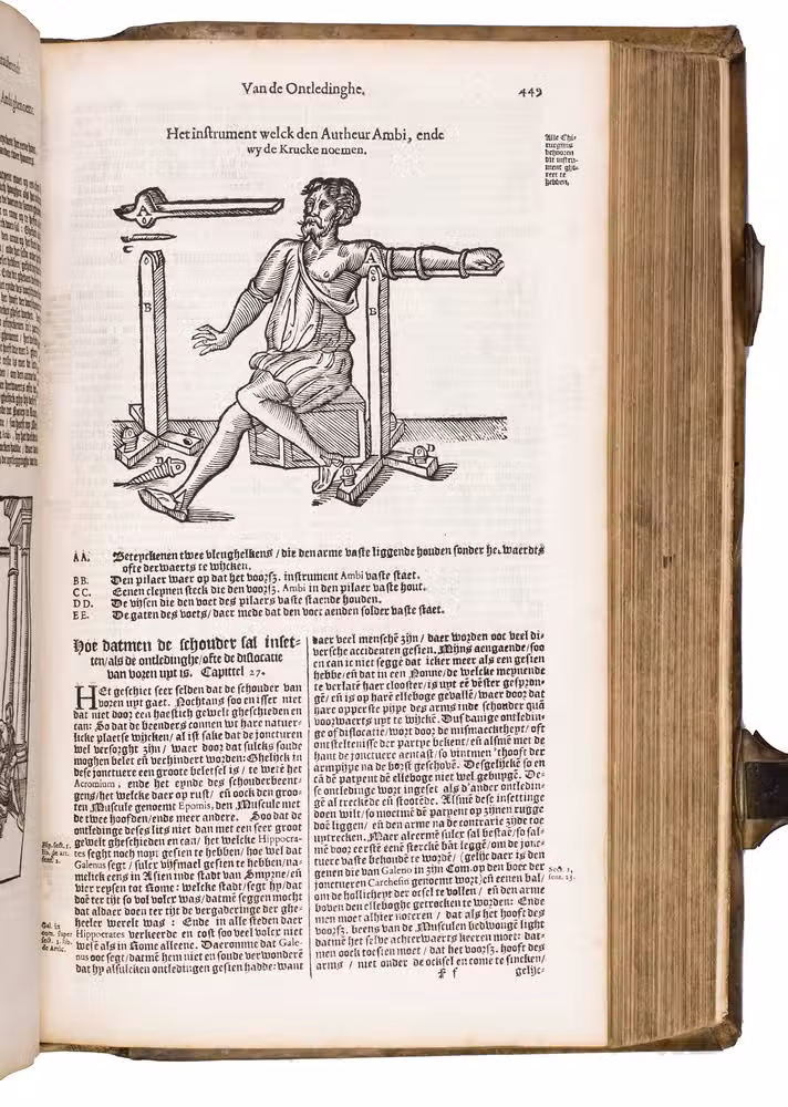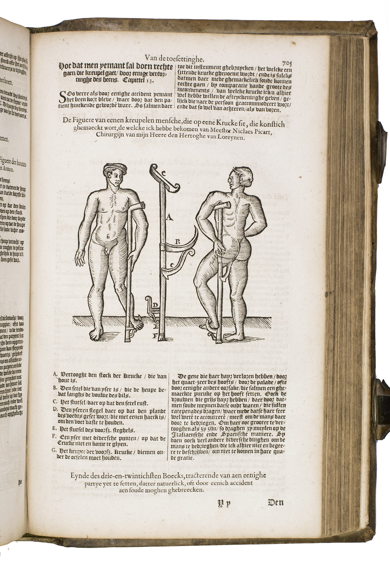With the label of the Oudheidkamer Twente on the spine, and the stamp of this library on the recto of the first free flyleaf, an ownership entry on the very of the same leaf. The vellum is somewhat browned and rubbed, with a stain in the lower left corner of the front board, lacking one of the clasps. Some of the leaves are lightly (water) stained, without affecting the text or illustrations. Otherwise in good condition. Bibl. Med. Neerl. I, p. 288; Doe, Bibl. of Paré, 66; STCN 088354946 (1 copy); cf. Wellcome Library I, 4819-25 (French, Latin & English eds.); Garrison & Morton 5565 (French 1575 ed.); Heirs of Hippocrates 163 (French 1579 ed.); Krivatsy 8599-602 (Dutch eds.).