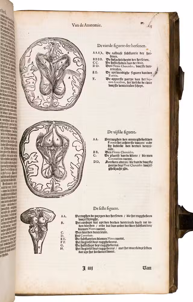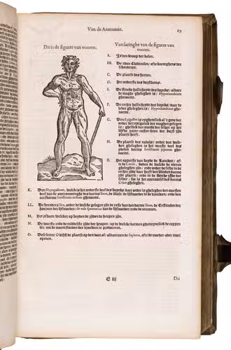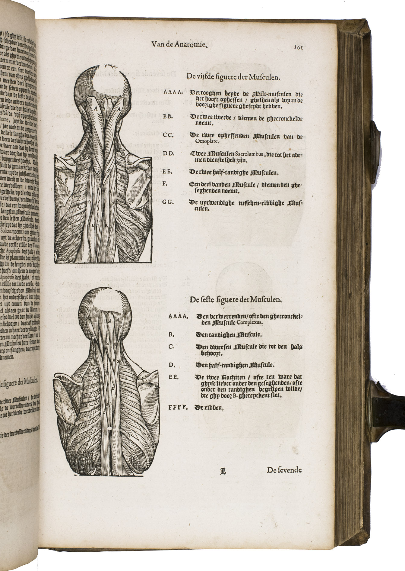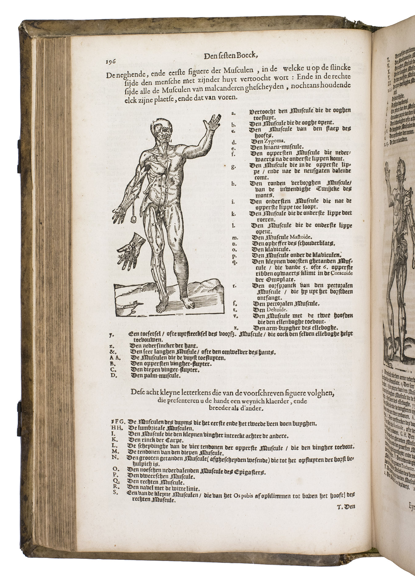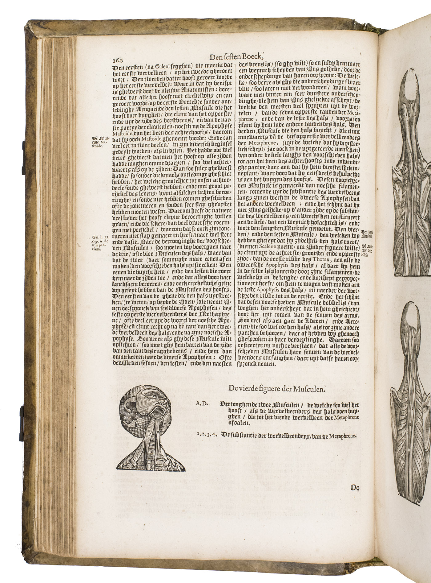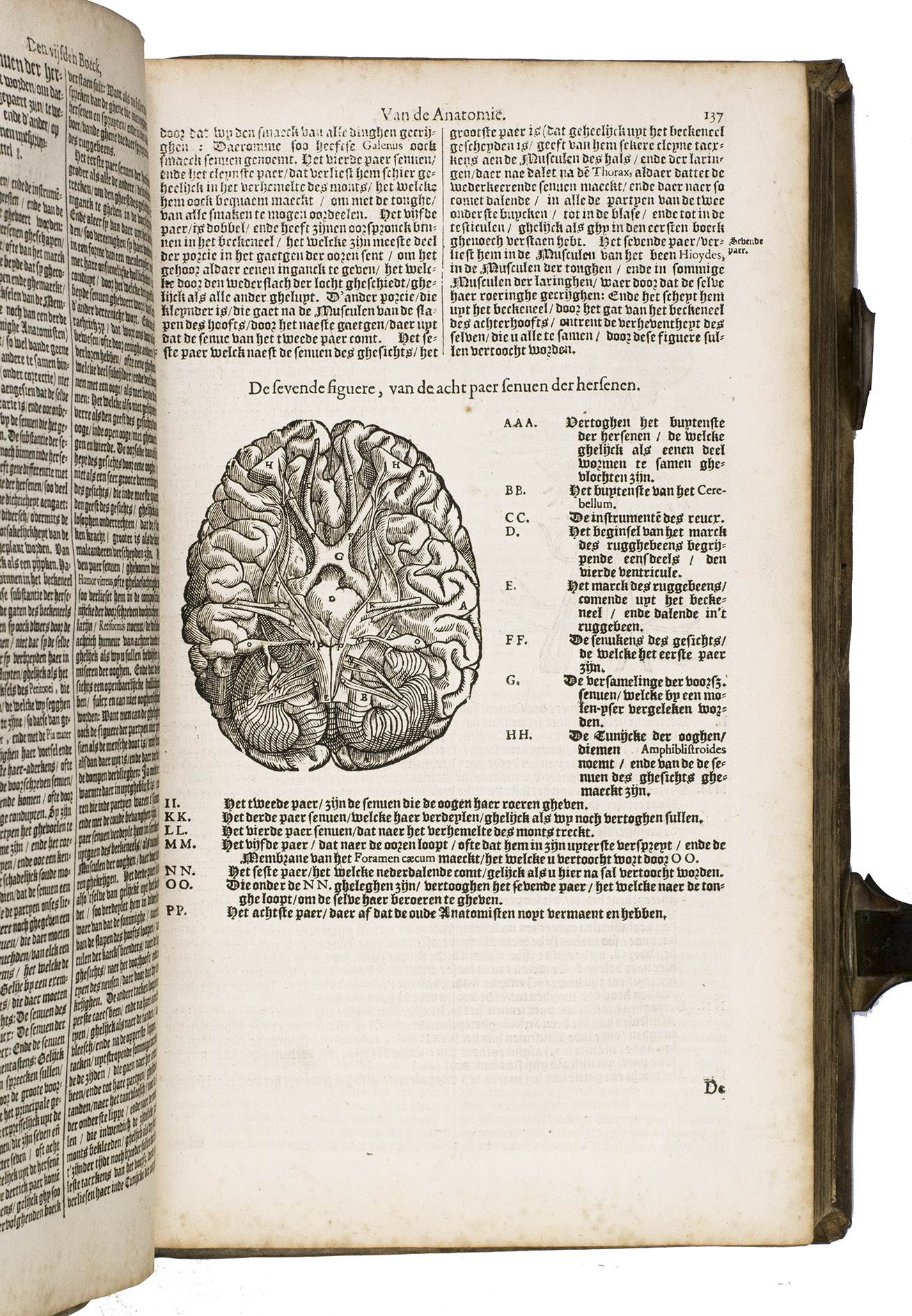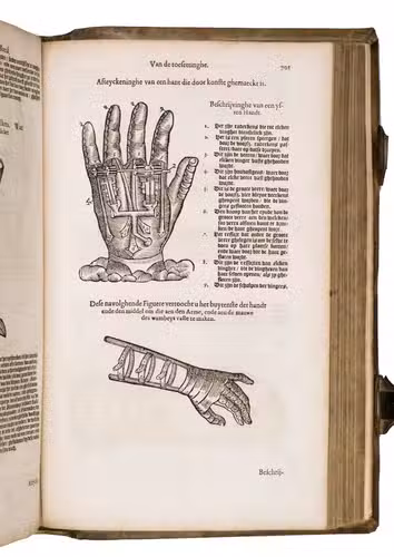 Amsterdam, Gerrit Willemsz, 1649. 2 parts in 1 volume. Folio. With a large woodcut vignette on the title page, more than 300 woodcut illustrations in the text, and several woodcut initials, the title is printed in red and black. The illustrations originate from the 1582 first edition. Including: FERNELLI, Johannes. Beschryvinghe der deelen des menschelijcken lichaems. Contemporary blind-tooled vellum over wooden boards. [16], 940, [12]; 42, [2] pp.