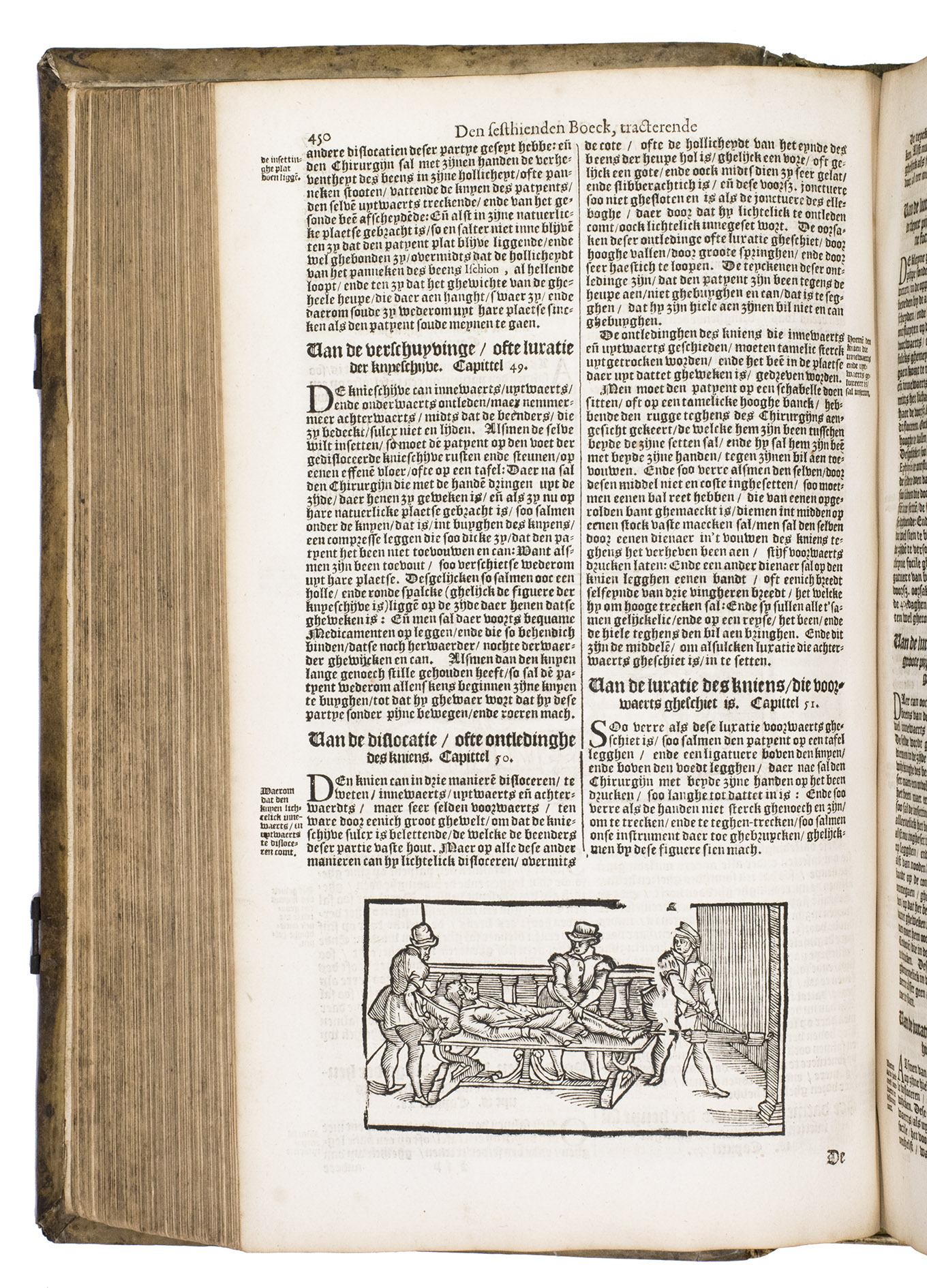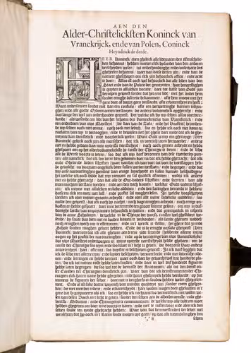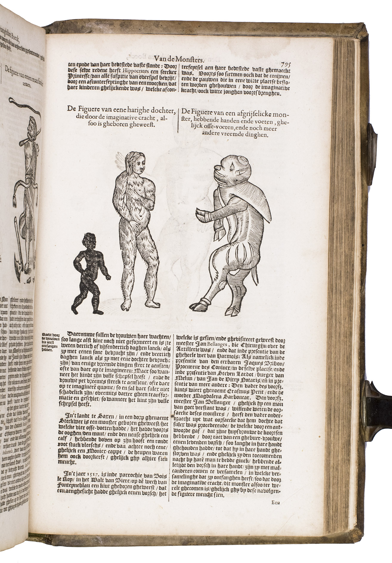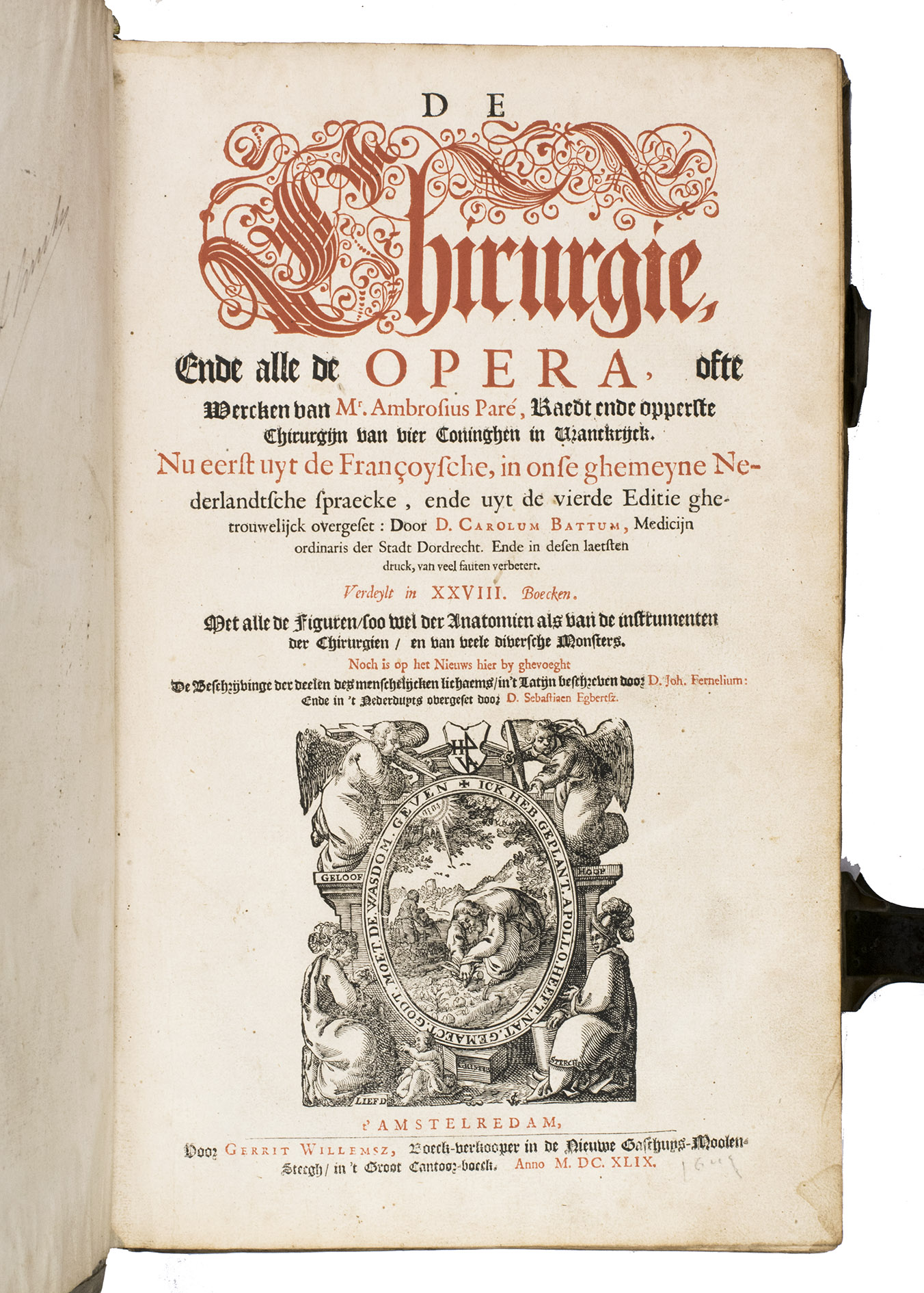Dutch edition of the collected works of the famous French surgeon Ambrosius Paré (1517-1590), great renovator of surgery in France, who also profoundly influenced the practice of surgery throughout Europe. Paré is especially remembered for his abandonment of boiling oil and the cautery, and for his revival of podalic version. He invented many new surgical instruments, and instruments for dentistry. Paré was raised in a poor family, he started his medical career as an assistant barber. He worked his way up and became an outstanding surgeon, and the greatest military surgeon before Larrey could be named such over 200 years later. His writings are still popular for the vivid case histories, which Paré mainly drew from his own practical experience. For example, in the present work, many examples and illustrations are given on procreation and monsters, a part which actually deals with obstetrics. Paré had problems with the Paris physicians during the 1570's. Since he had not asked permission for publication of his medical writings at the medical faculty of the Paris university, and because he used to write in the common tongue - he did not speak or write any Latin - he provoked the anger of the physicians, who feared rivalry from surgeons. They tried to destroy Paré with the help of the law, but it turned out that the king had given the great surgeon a 10-year privilege in 1572, granting Paré the right "to employ such printers as seems good to him".