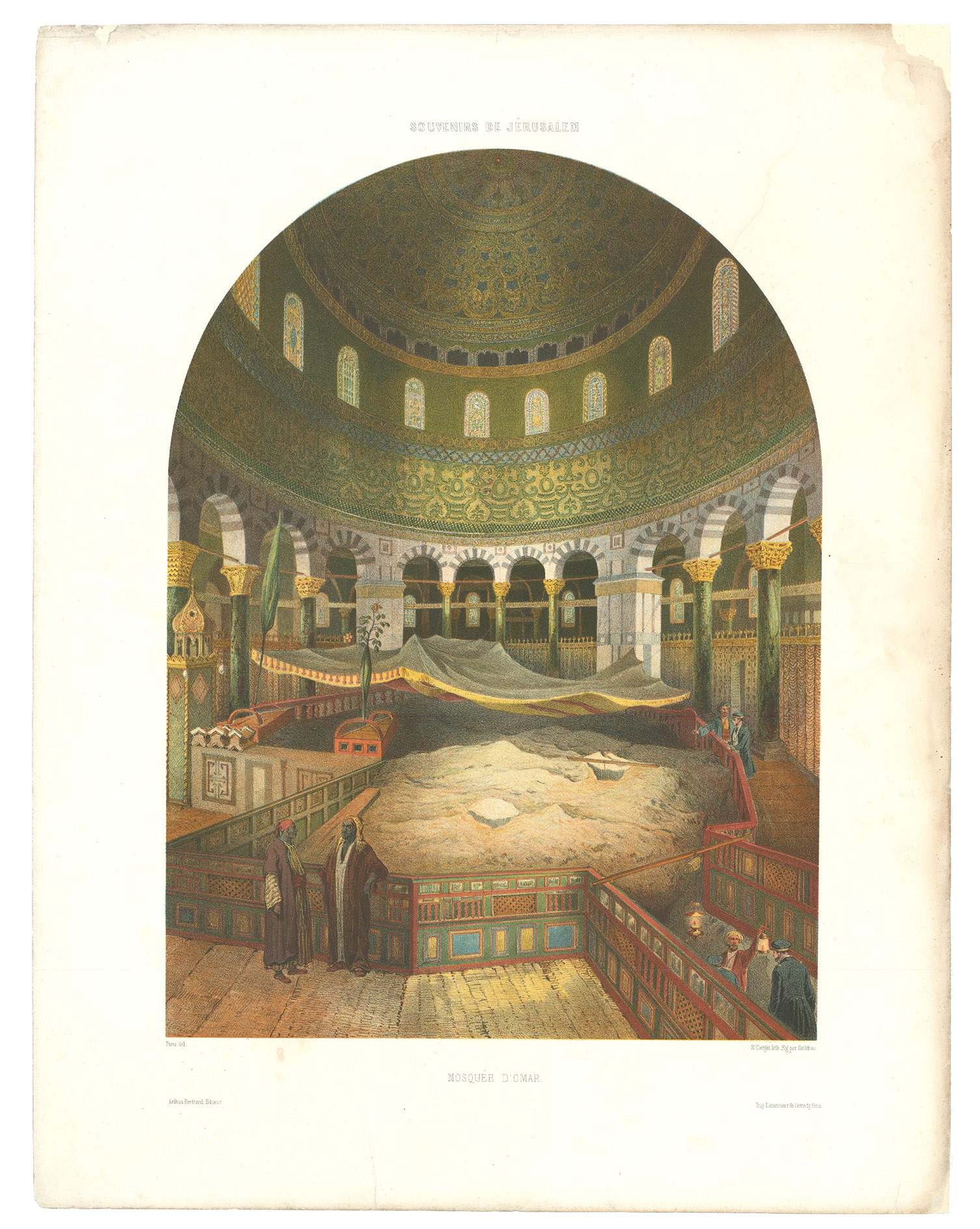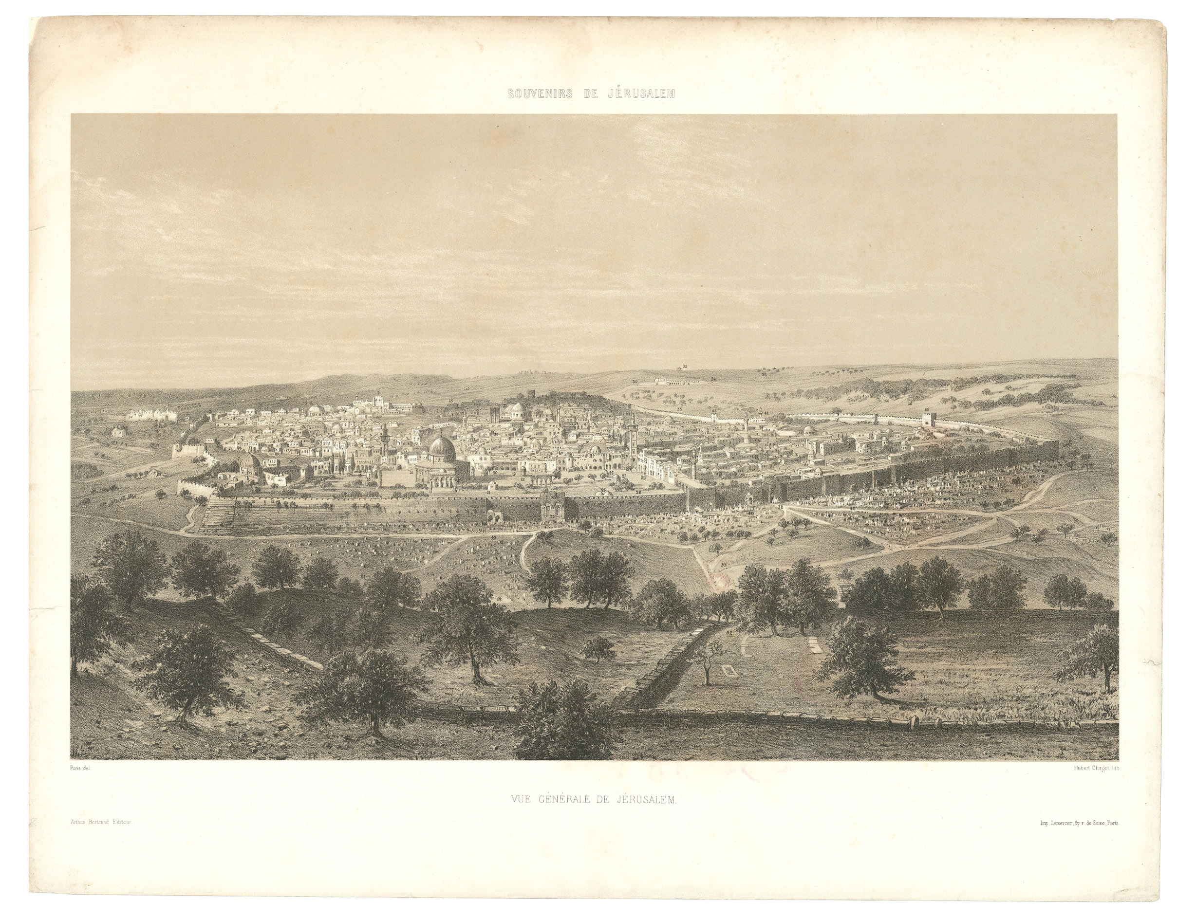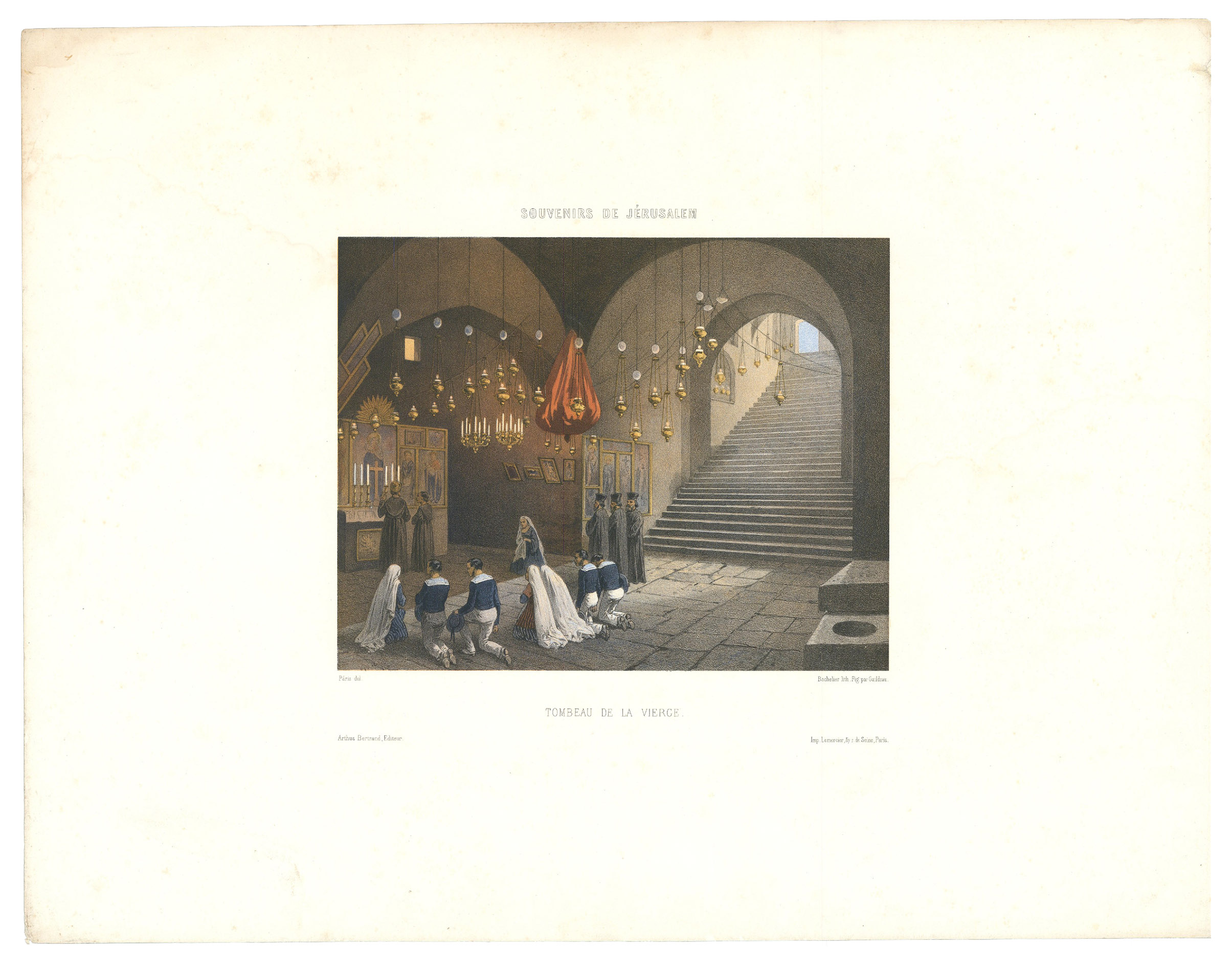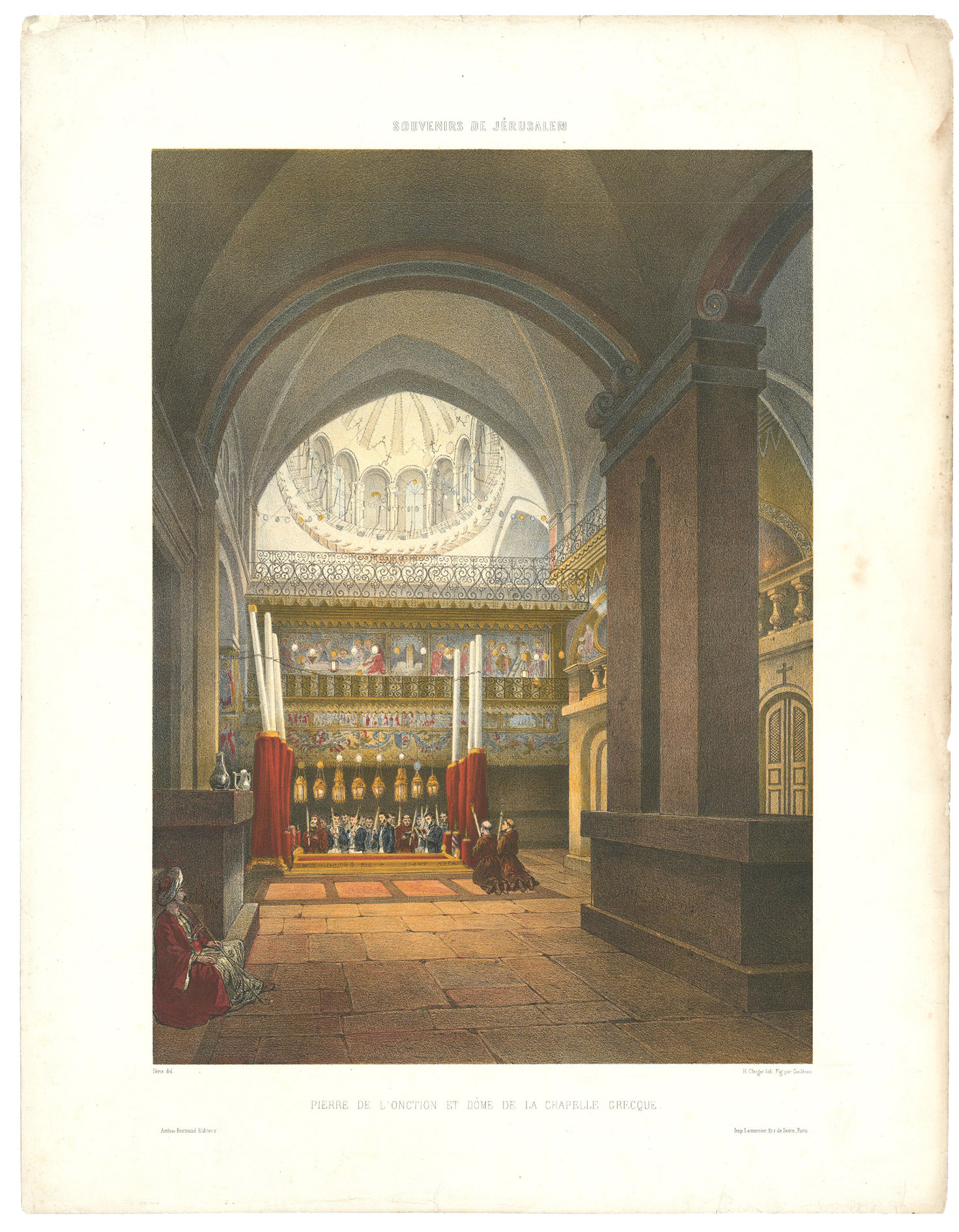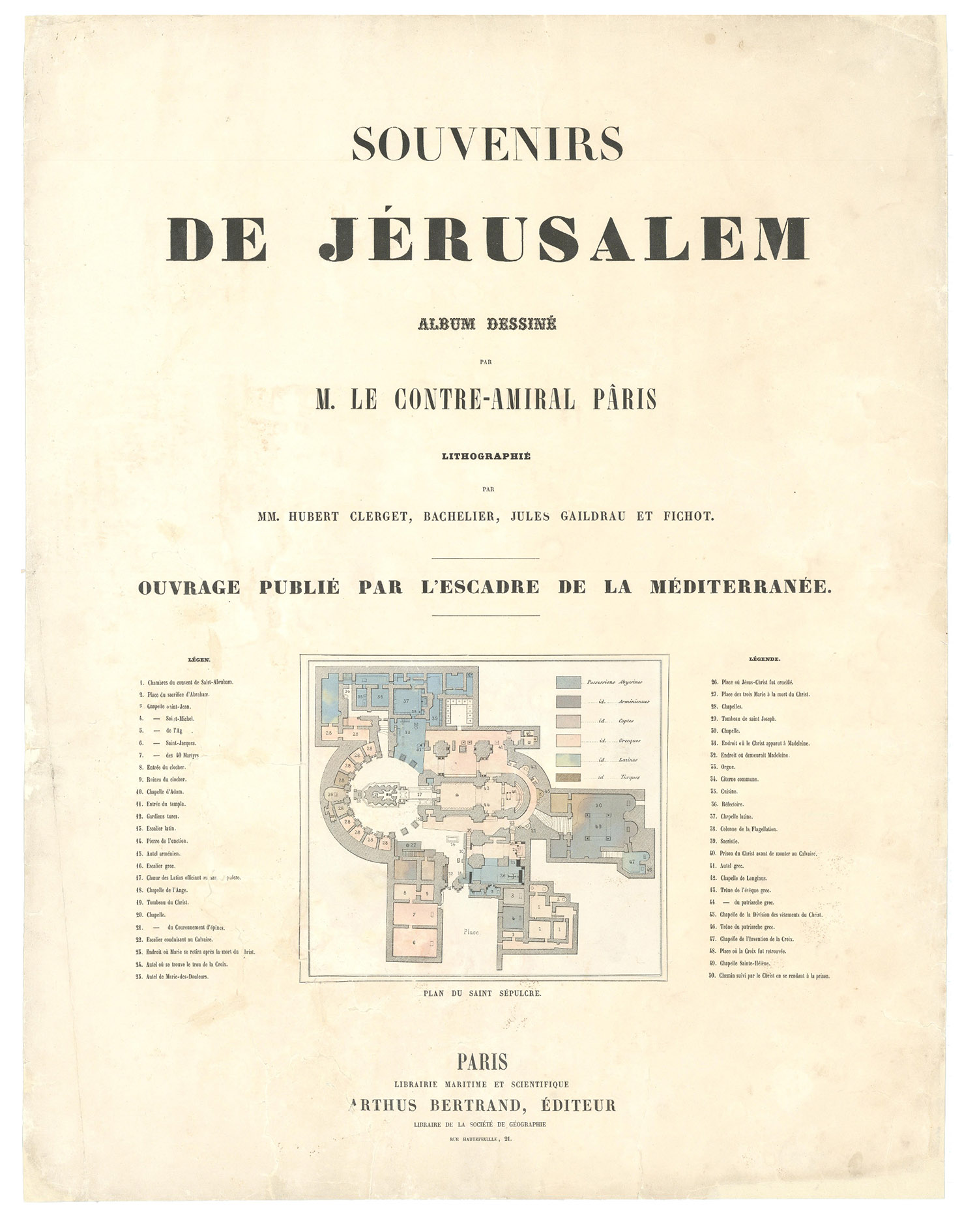 Elaborate album of lithographs based on drawings by Vice Admiral François-Edmond Pâris from a visit to the Holy City in 1861. The album follows Pâris' itinerary as described by him in the introductory text. Leading his squadron from Jaffa to Jerusalem, Pâris drew a charming scene of pilgrims gathering at the fountain of Abu-Nabbut. Before entering the city, he captured an impressive view of Jerusalem from the Mount of Olives. 52 important sights are marked in the uncoloured lithograph and described in the text. The view of the city is followed by impressions of Christian places of worship such as the Holy Grave, the Prison of Christ, and the Chapel of Saint Helena in the Church of the Holy Sepulchre, the Tomb of the Virgin Mary, the Grotto of the Nativity in nearby Bethlehem, and an unusual, uncoloured view of the interior of the Golden Gate (Gate of Mercy). The final 3 lithographs present 2 beautiful interiors of the Mosque of Omar and one of the Al-Aqsa Mosque. All sights depicted are described in the text.