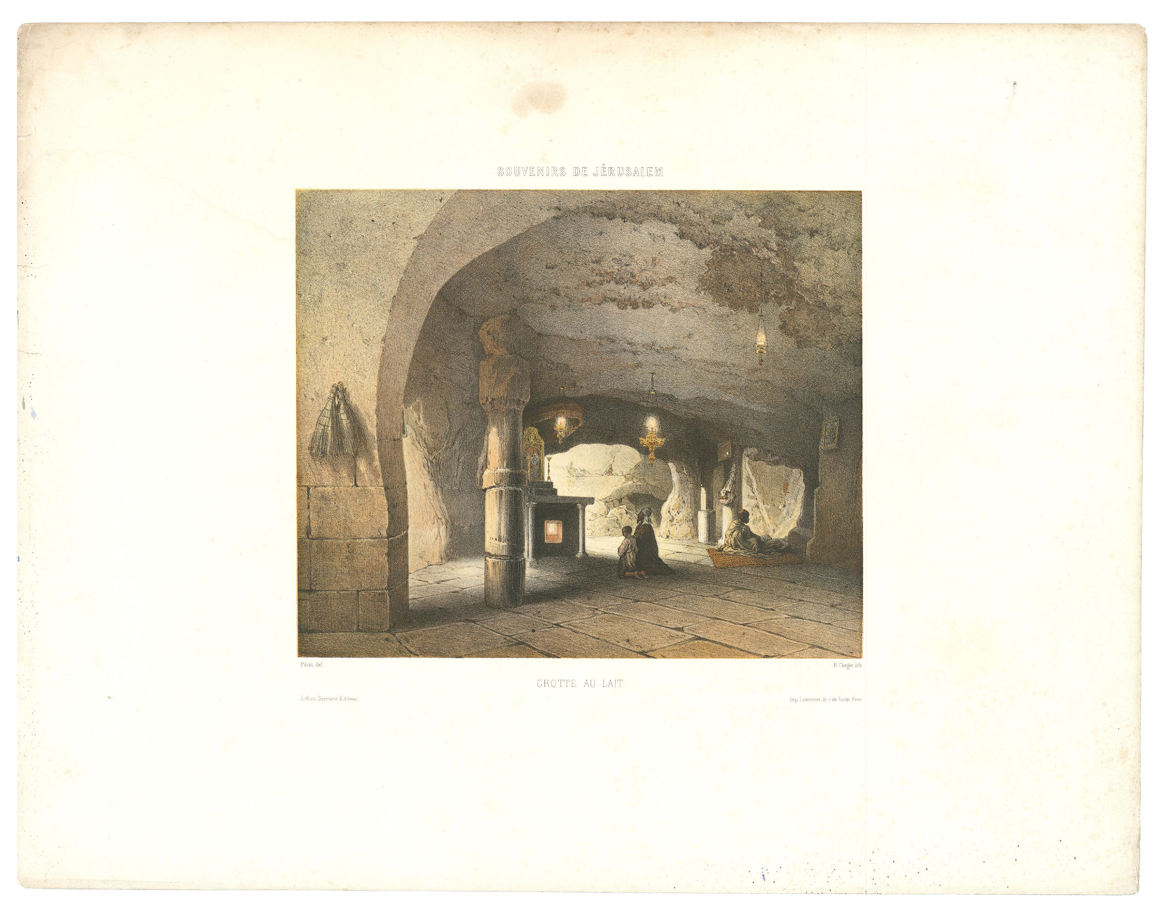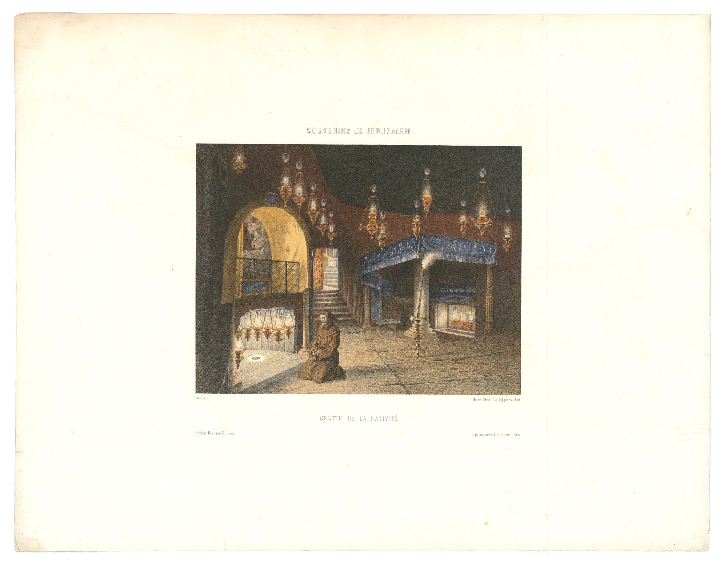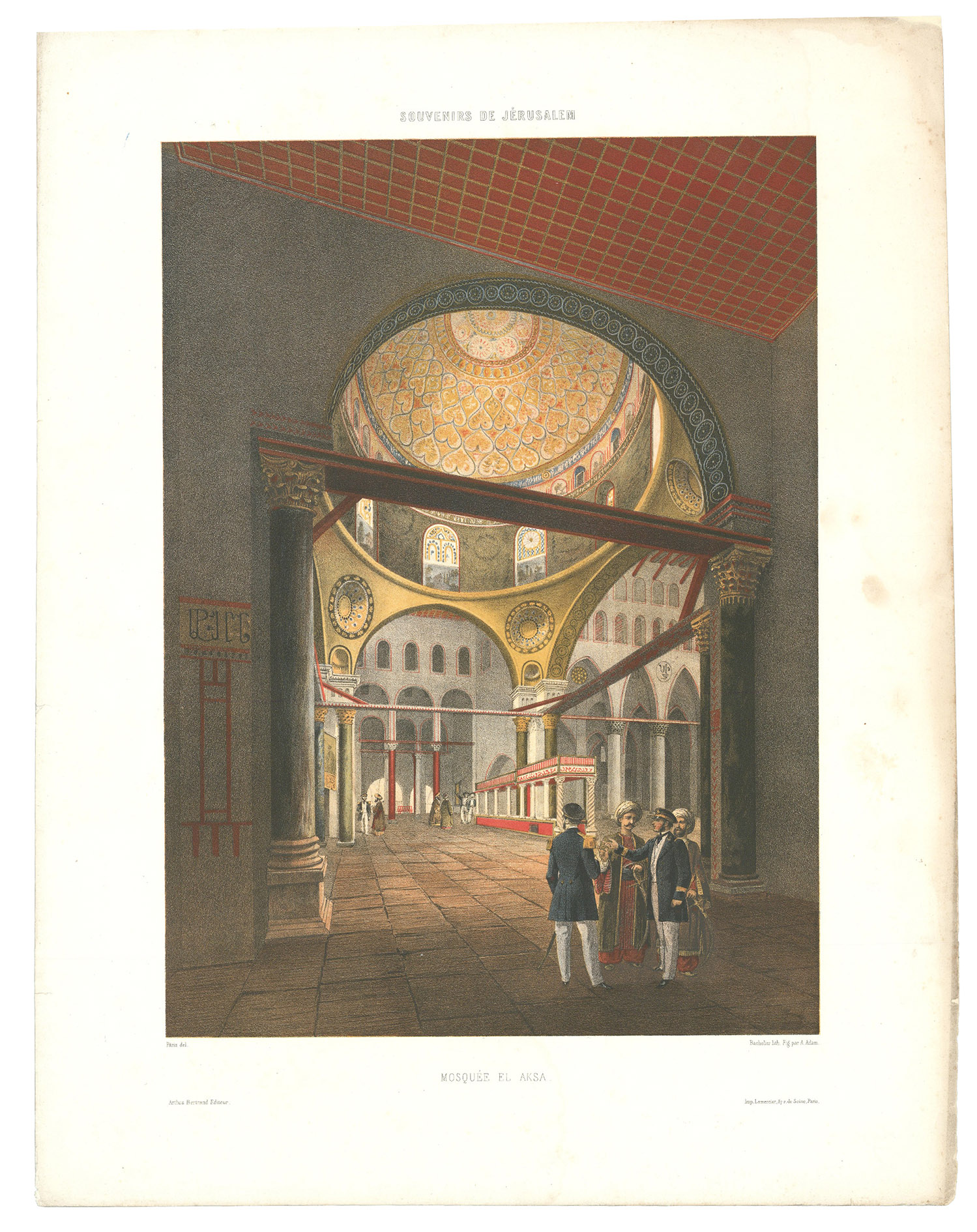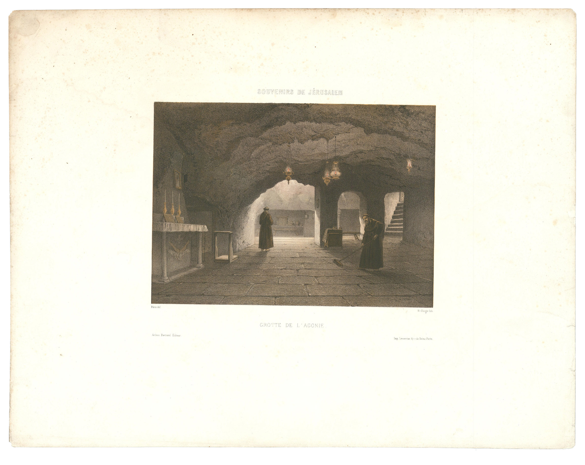 Elaborate album of lithographs based on drawings by Vice Admiral François-Edmond Pâris from a visit to the Holy City in 1861. The album follows Pâris' itinerary as described by him in the introductory text. Leading his squadron from Jaffa to Jerusalem, Pâris drew a charming scene of pilgrims gathering at the fountain of Abu-Nabbut. Before entering the city, he captured an impressive view of Jerusalem from the Mount of Olives. 52 important sights are marked in the uncoloured lithograph and described in the text. The view of the city is followed by impressions of Christian places of worship such as the Holy Grave, the Prison of Christ, and the Chapel of Saint Helena in the Church of the Holy Sepulchre, the Tomb of the Virgin Mary, the Grotto of the Nativity in nearby Bethlehem, and an unusual, uncoloured view of the interior of the Golden Gate (Gate of Mercy). The final 3 lithographs present 2 beautiful interiors of the Mosque of Omar and one of the Al-Aqsa Mosque. All sights depicted are described in the text.