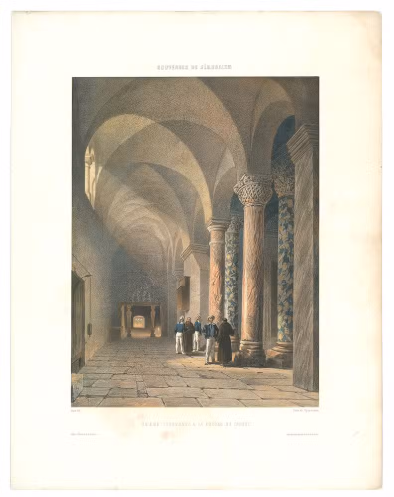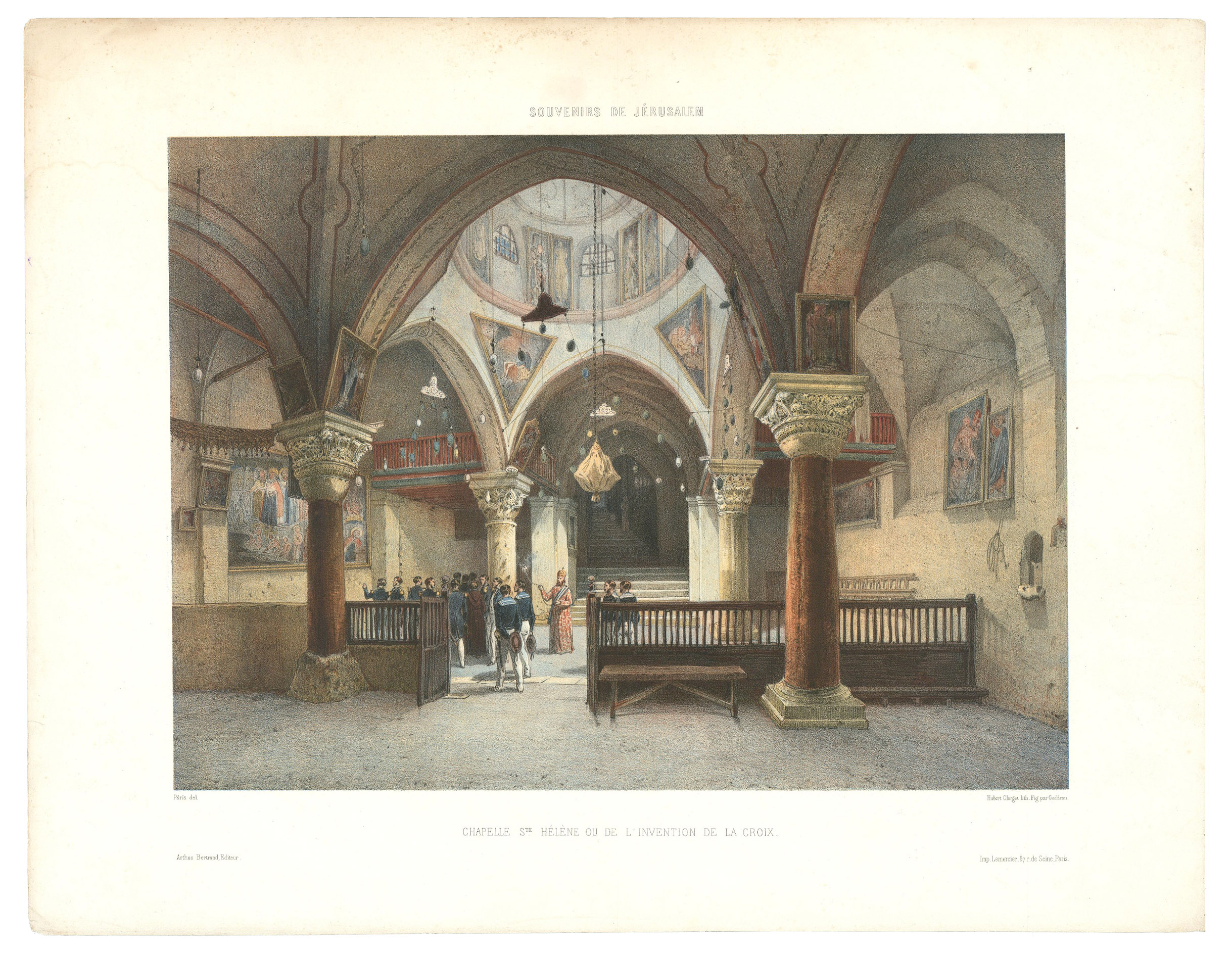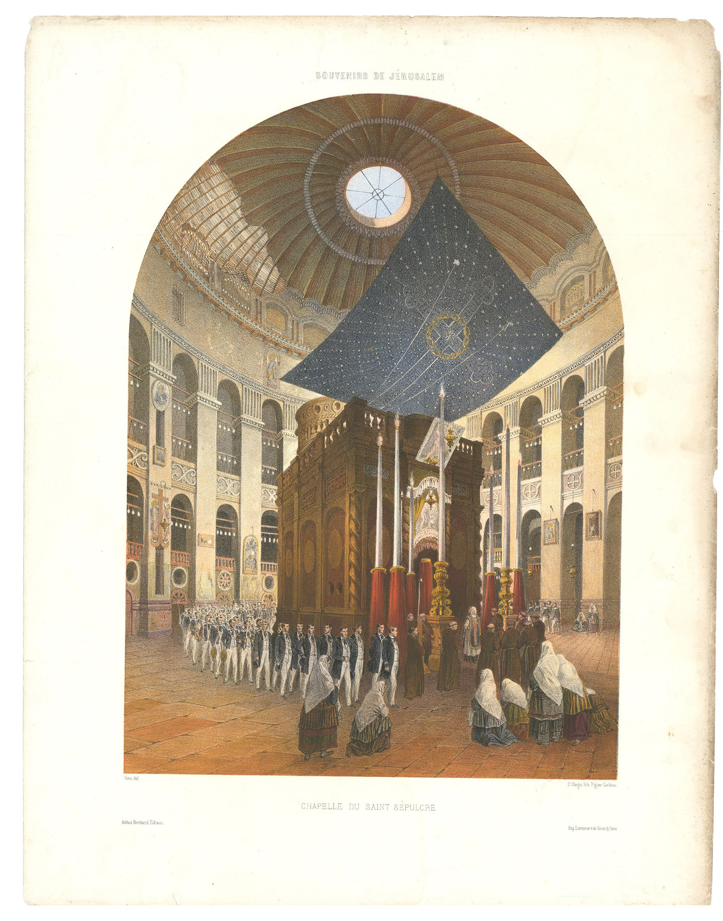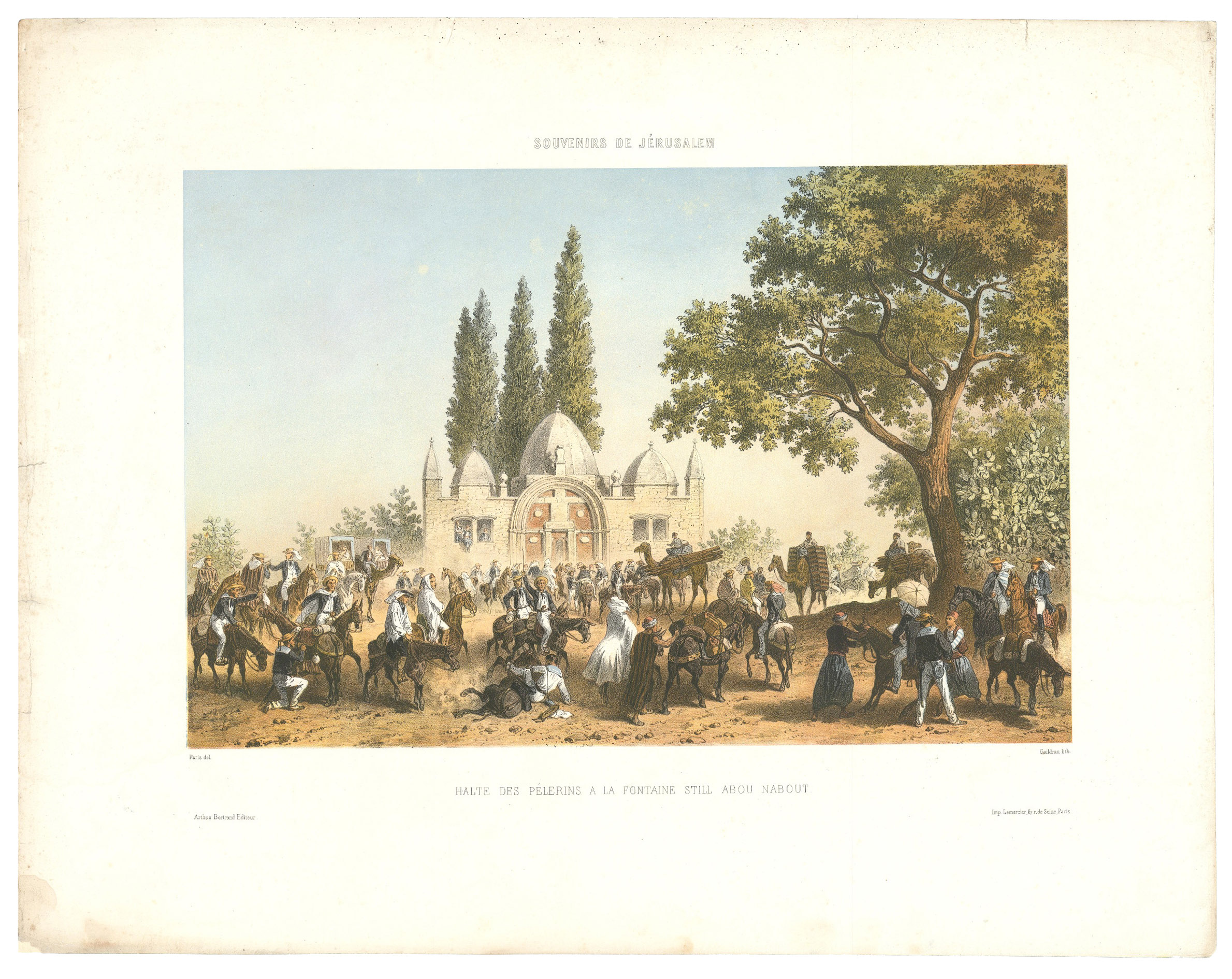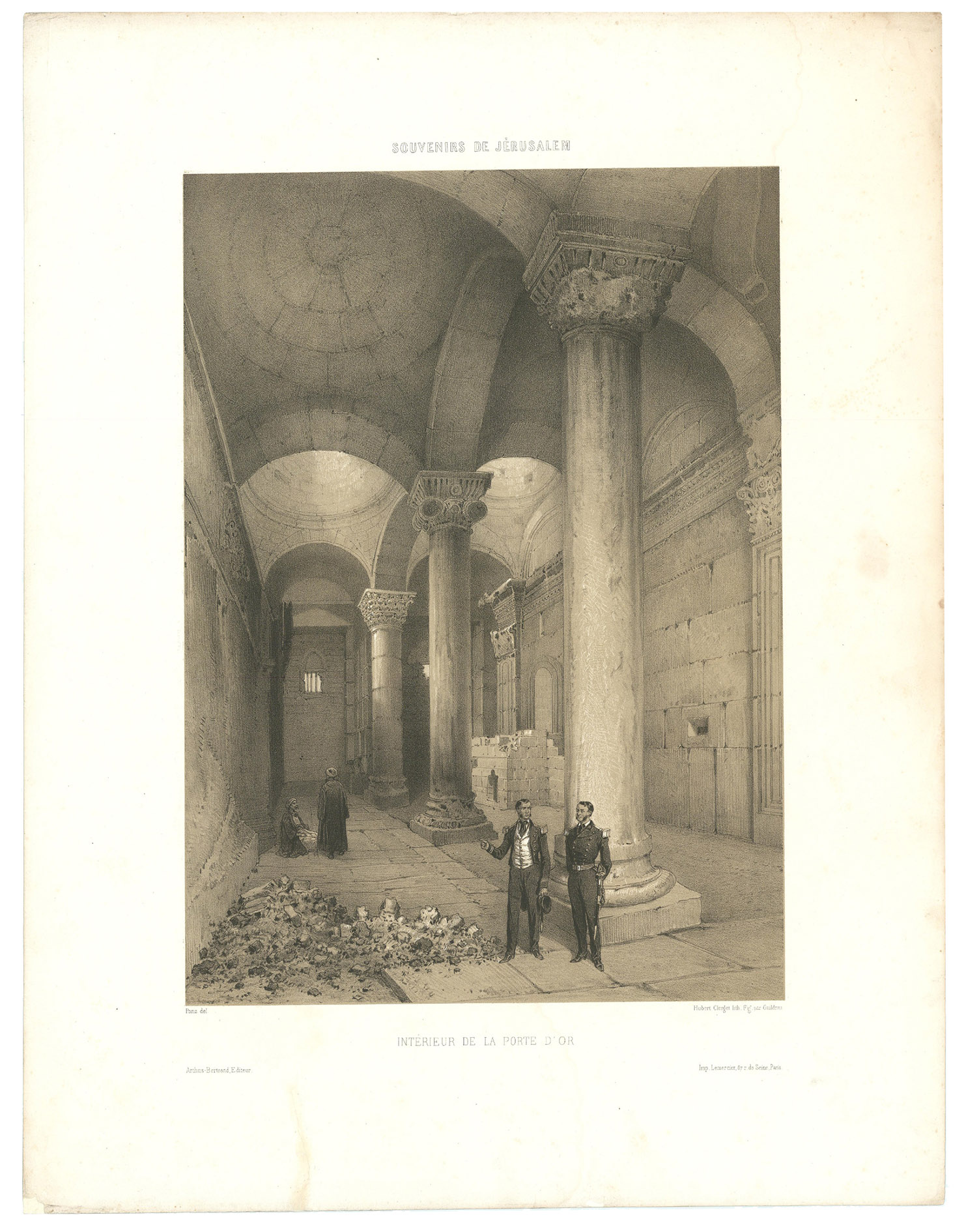 Elaborate album of lithographs based on drawings by Vice Admiral François-Edmond Pâris from a visit to the Holy City in 1861. The album follows Pâris' itinerary as described by him in the introductory text. Leading his squadron from Jaffa to Jerusalem, Pâris drew a charming scene of pilgrims gathering at the fountain of Abu-Nabbut. Before entering the city, he captured an impressive view of Jerusalem from the Mount of Olives. 52 important sights are marked in the uncoloured lithograph and described in the text. The view of the city is followed by impressions of Christian places of worship such as the Holy Grave, the Prison of Christ, and the Chapel of Saint Helena in the Church of the Holy Sepulchre, the Tomb of the Virgin Mary, the Grotto of the Nativity in nearby Bethlehem, and an unusual, uncoloured view of the interior of the Golden Gate (Gate of Mercy). The final 3 lithographs present 2 beautiful interiors of the Mosque of Omar and one of the Al-Aqsa Mosque. All sights depicted are described in the text.