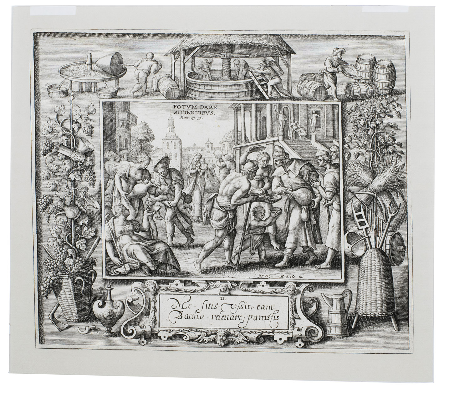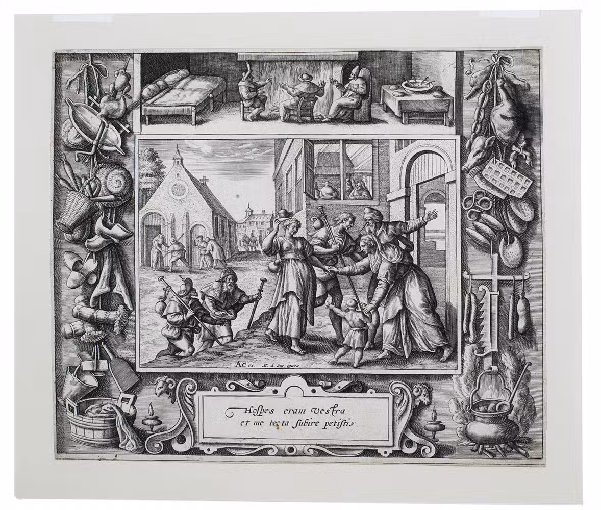 Complete series of the Acts of Mercy, including the plate of the Last Judgement, engraved by the engraver, illustrator and publisher Crispijn de Passe I (ca. 1564-1637) after Maarten de Vos (1532-1603), one of the most prolific and influential print designers of his generation. They were first published by the engraver Crispijn de Passe the elder (I), and subsequently by Adriaen Collaert, Theodoor Galle and Johannes Galle. Our set shows the 7 prints of the Acts of Mercy in their second state (of 4) by Collaert, with his monogram "AC" in the plates. The eighth print, showing the Last Judgement, is in its third state, published by Johannes Galle.