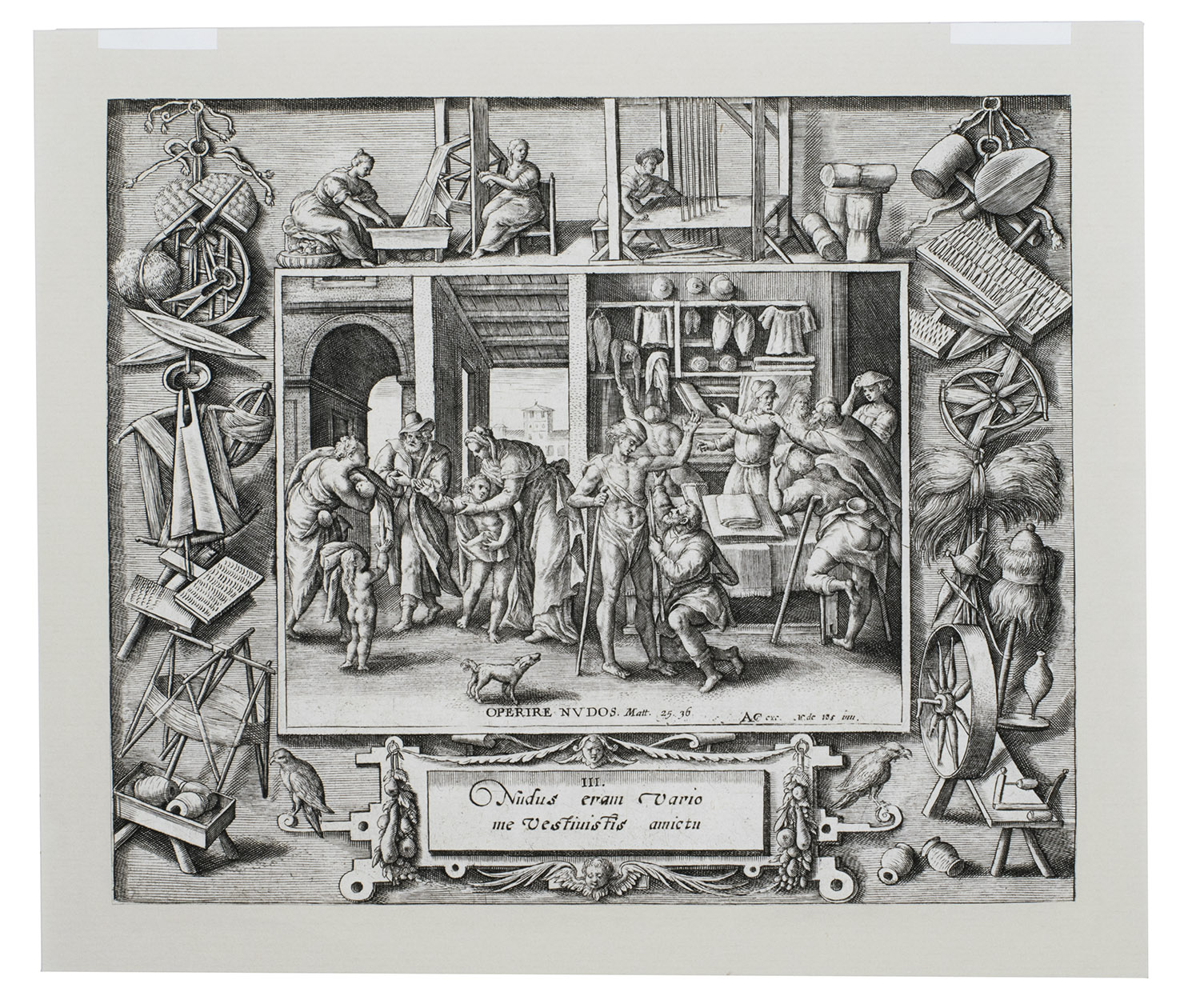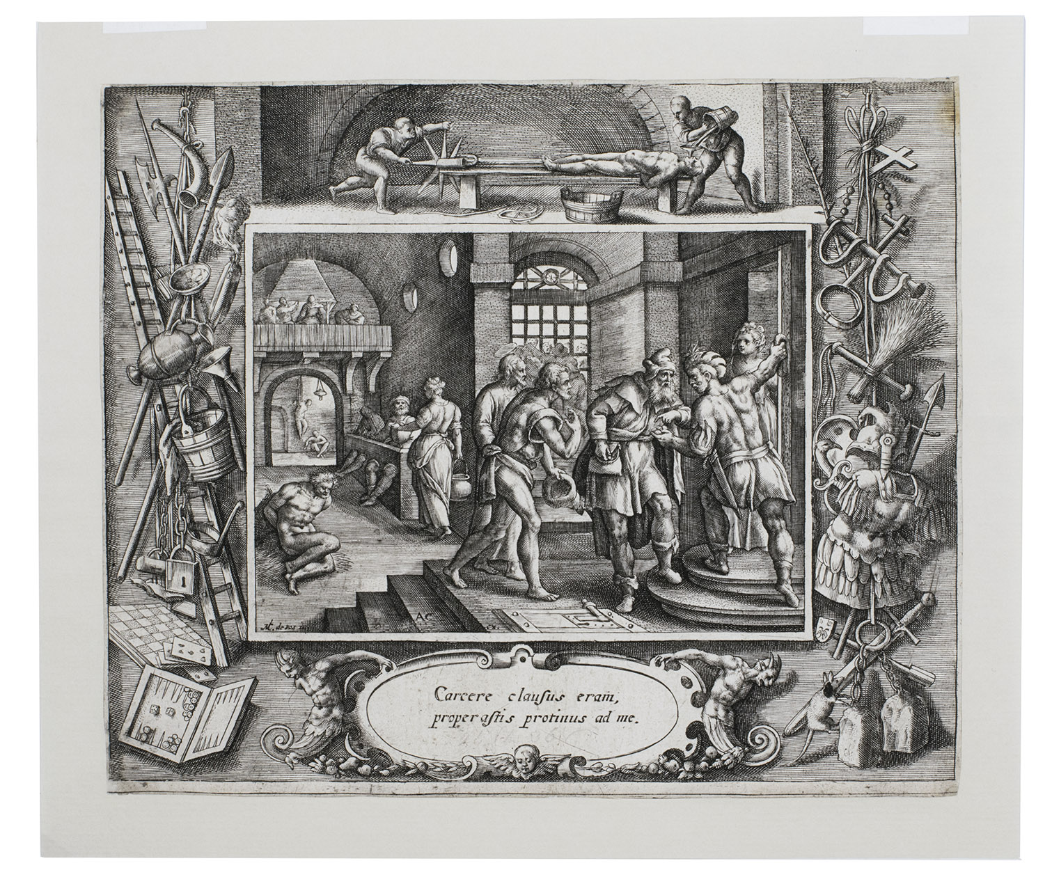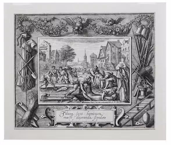 Antwerp, Adriaen Collaert (7 plates with the Acts of Mercy) & Johannes Galle (the Last Judgement), ca. 1580-1588. Folio (7 of 8 plates trimmed). 8 engravings (ca. 17.5 x 20.5 cm) on laid paper by Crispijn de Passe I (the elder) after Maarten de Vos with the central scene framed by an exquisite ornamental border showing crafts, tools and scenes relating to the subject. All engravings captioned with engraved Latin text in a cartouche below the images. Loose prints.