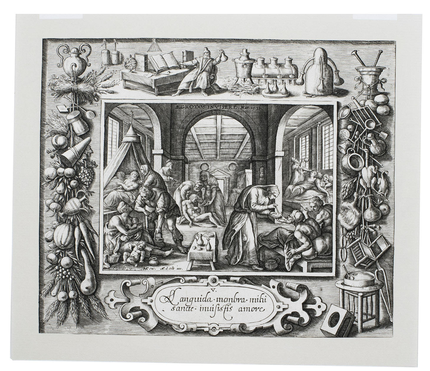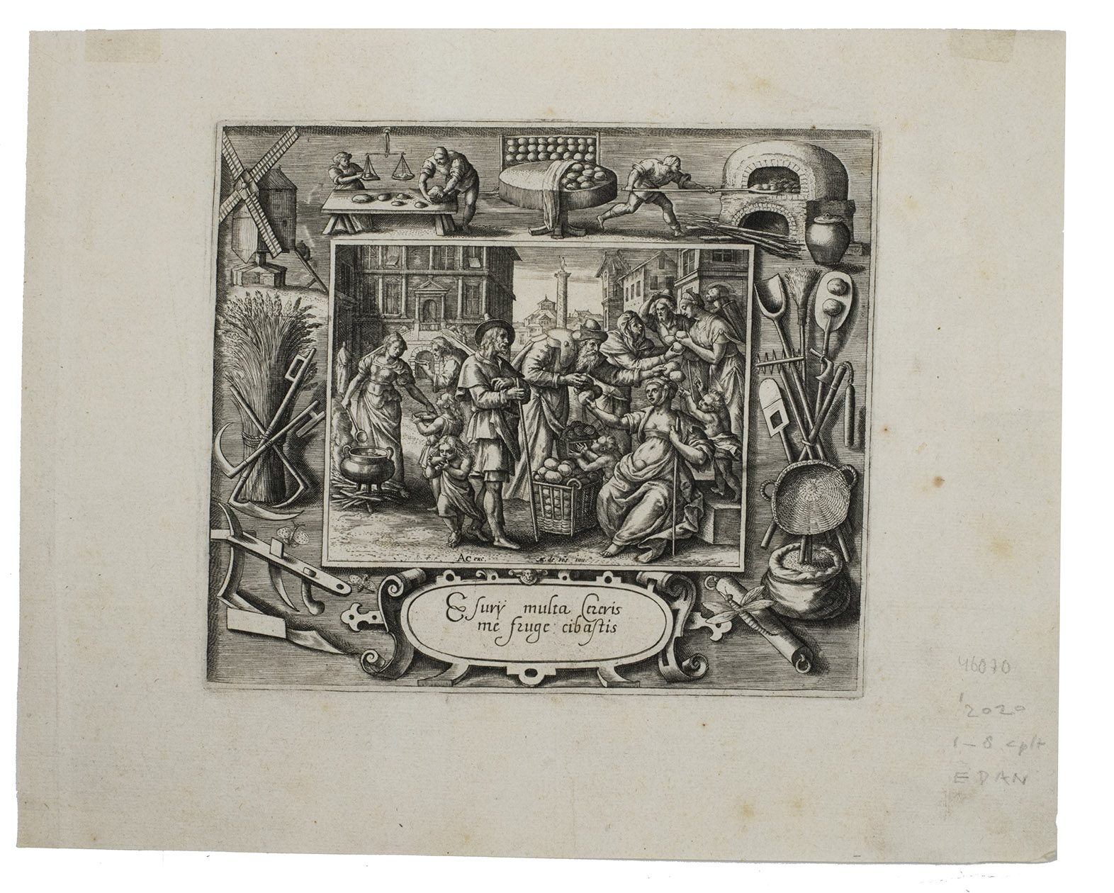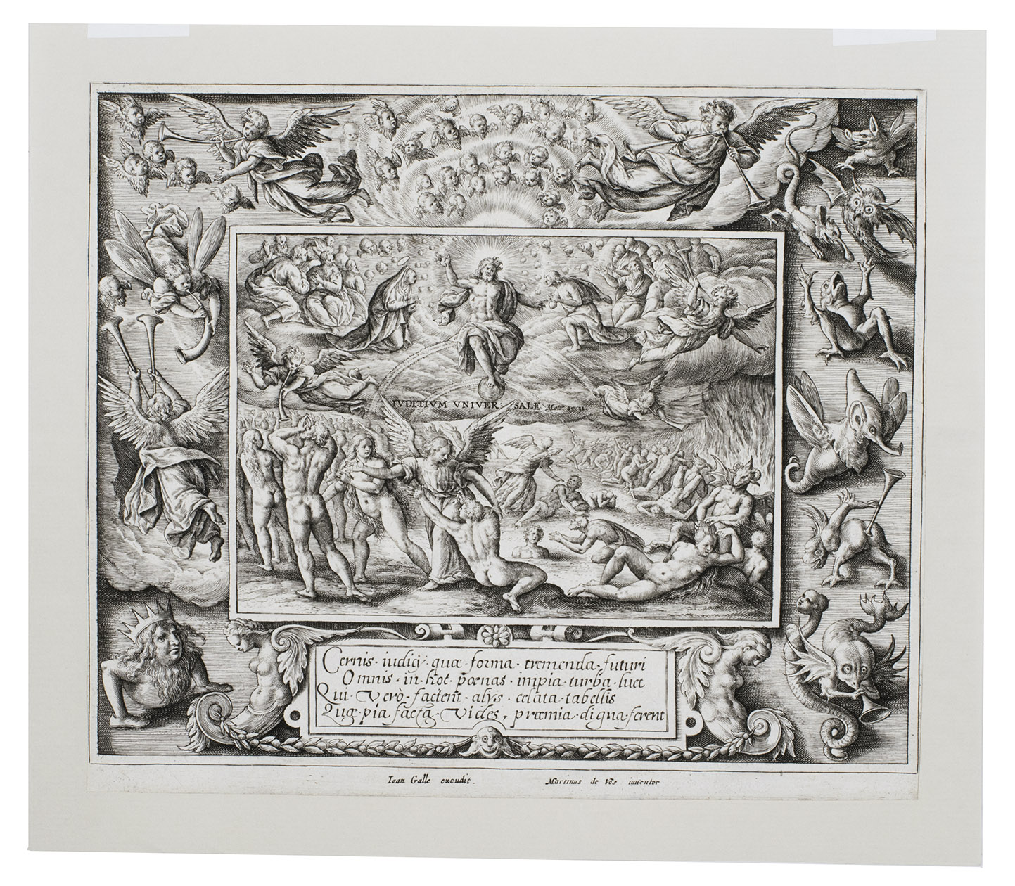 Antwerp, Adriaen Collaert (7 plates with the Acts of Mercy) & Johannes Galle (the Last Judgement), ca. 1580-1588. Folio (7 of 8 plates trimmed). 8 engravings (ca. 17.5 x 20.5 cm) on laid paper by Crispijn de Passe I (the elder) after Maarten de Vos with the central scene framed by an exquisite ornamental border showing crafts, tools and scenes relating to the subject. All engravings captioned with engraved Latin text in a cartouche below the images. Loose prints.
