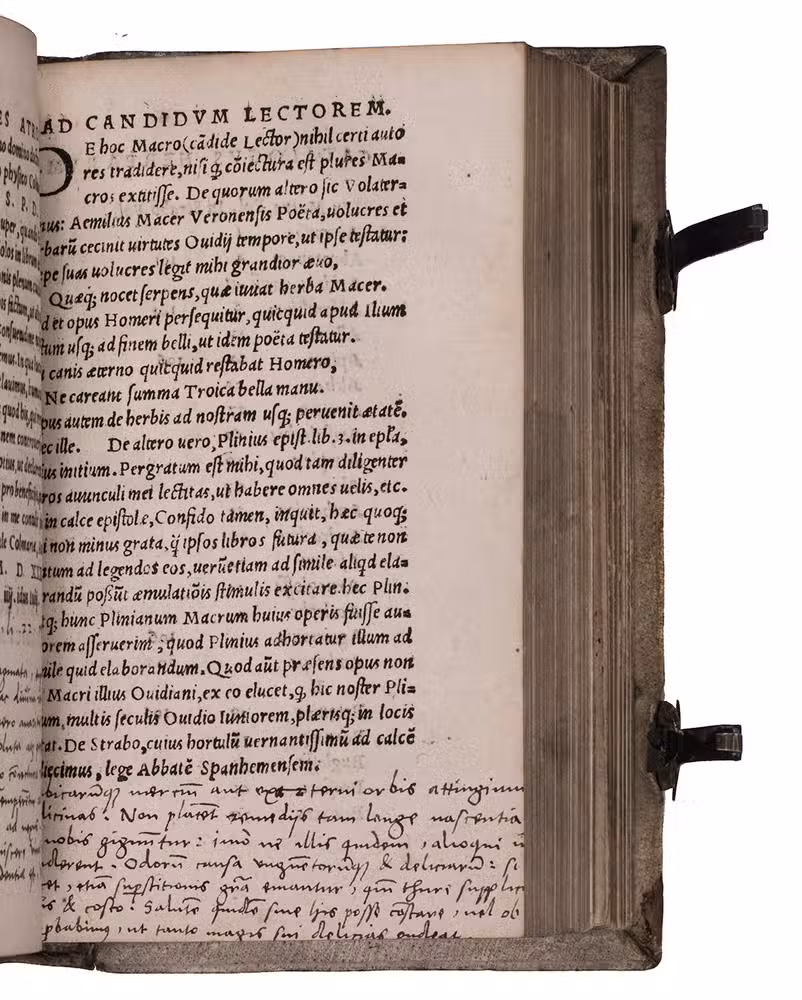 With owner's(?) names and several contemporary and later manuscript notes. With the first title page slightly dirty, a faint water stain in the second, and minor marginal defects in 3 leaves of ad 3 (not affecting the text), but otherwise in very good condition. The impression of the tooling on the spine is no longer clear and there are a couple small holes and minor wear, but the binding remains in good condition, with most of the tooling on the boards sharp, so that the roll and stamps are very clear. Ad 1: Adams P496; USTC 683278; VD16, ZV12239; ad 2: USTC 659360; VD16, V195; not in Adams; ad 3: Adams O62; Durling 2892; L. Elaut, "Para-historisch kommentaar op ... de Macer Floridus, in: Scientiarum historia I (1959), pp. 149-159, at p. 153; USTC 609421; VD16, O270; ad 4: Sinkankas 4170 & 4172; USTC 674861; VD16, M931 & P2691; Ward & Corozzi 1495; cf. Adams M519 (1539 Köln ed.); Wellcome 4039 (1531 Wechel ed.).