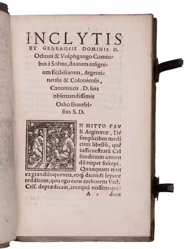 Ad 1. First edition of two pharmacological works by the Byzantine physician Paulus of Aegina (ca. 625-ca. 690). The first, Pharmaca simplicia, prepared for publication by the great German pioneer of scientific botany Otto Brunfels (1488?-1534), provides brief accounts of the properties and uses of about 750 pharmacological simples, the basic ingredients for preparing medicines, listed mostly in alphabetical order. The second, De ratione victus, prepared by Wilhelm Kopp (ca. 1461-1532) from Basel, who moved to Paris in 1512 and became personal physician to King Louis XII, describes about 100 medicines, including mushrooms.