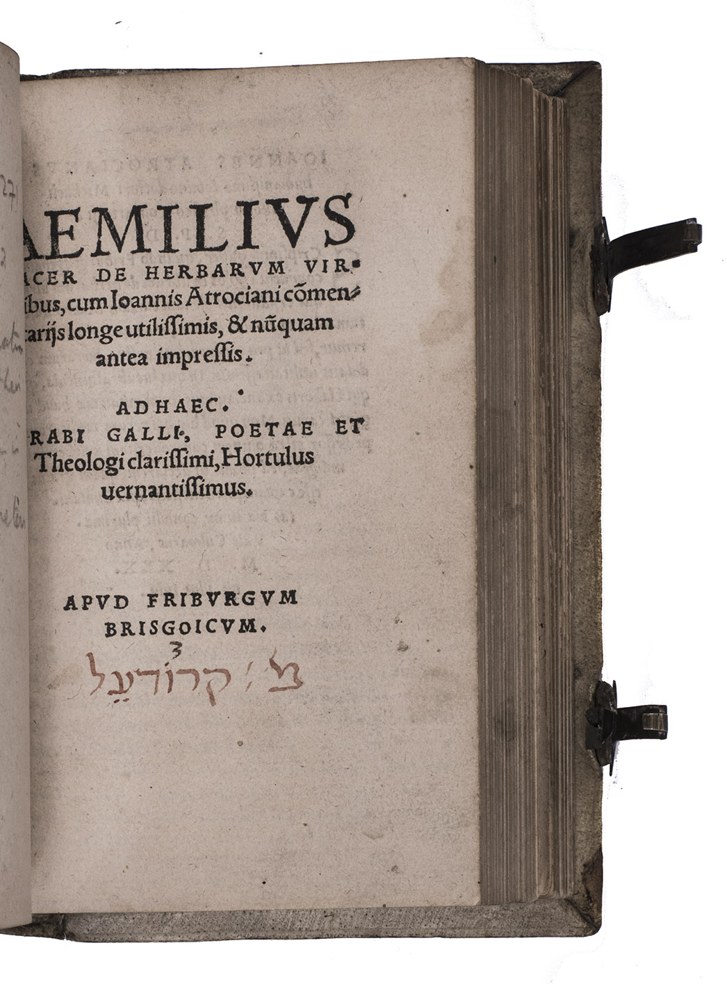 Ad 3. A didactic poem in Latin hexameters explaining the therapeutic value of (originally) 77 kinds of herbs, now usually attributed to the French medieval physician, Odo of Meung in the last quarter of the 11th century, but formerly to Aemilius Macer (70-16 BCE) and therefore sometimes called the Macer Floridus. It was a major influence on the Salerno Regimen sanitatis and through it on the Nicolai Antidotarium, making it a central work in the evolution of European medicine. Including the shorter and more botanical and horticultural poem by Walafrid Strabo (ca. 808-849), both with important new commentaries and additions by Johannes Atrocianus (ca. 1495?-ca. 1543?), giving nearly a hundred kinds of medicinal herbs.