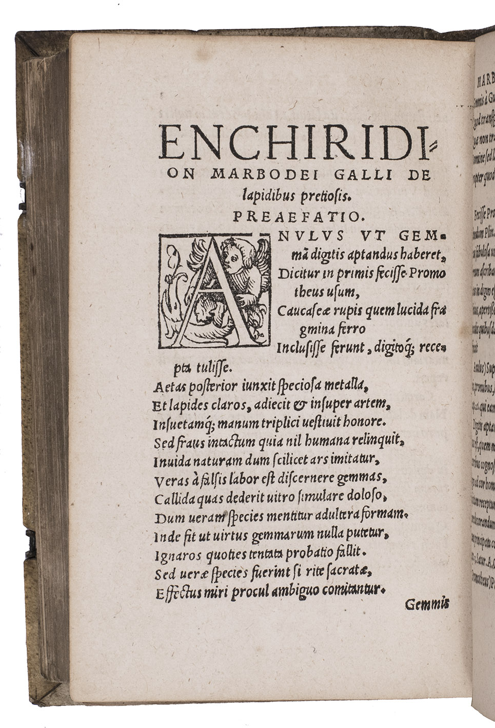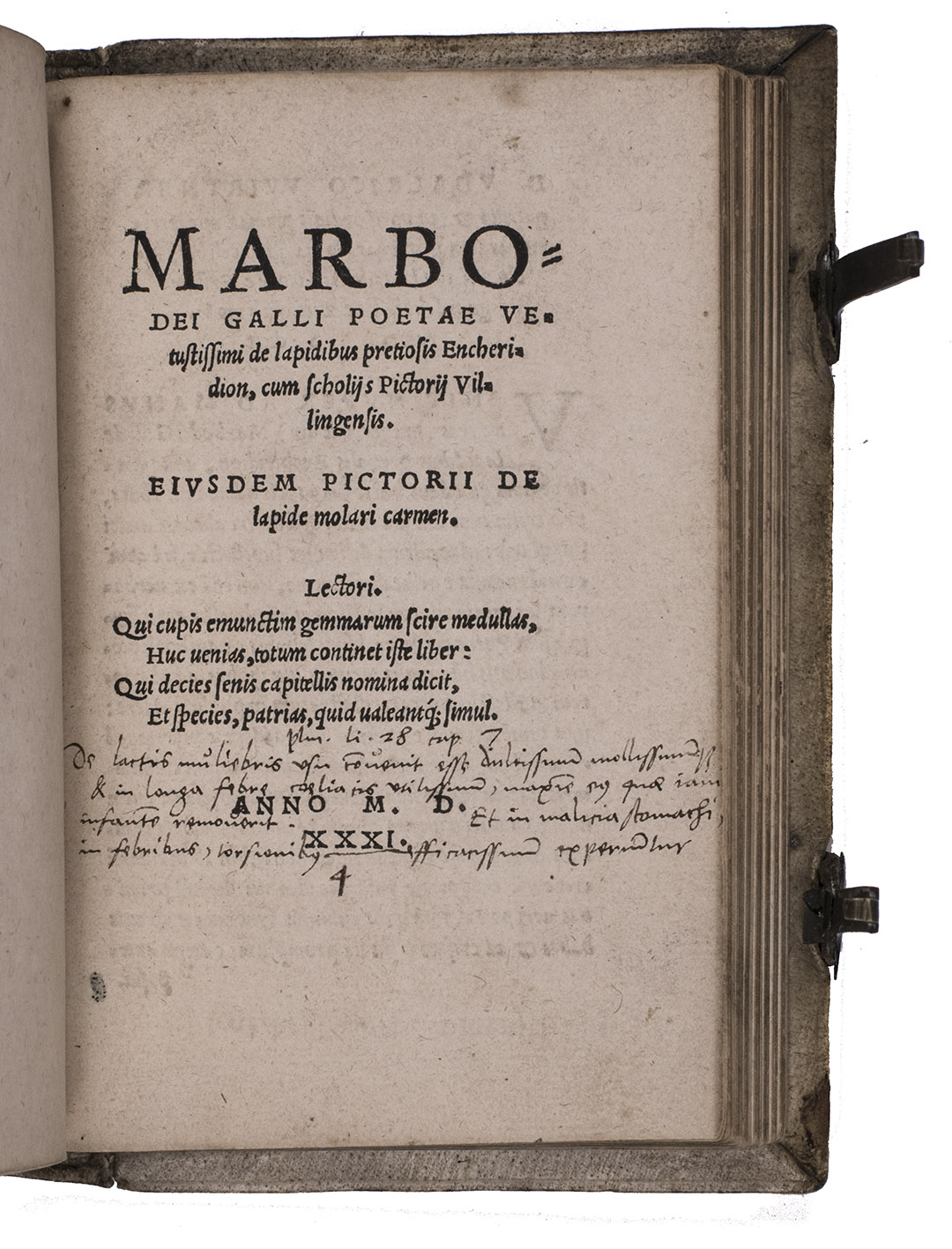 Ad 4. Third and best edition of the first lapidary, written in verse around 1100 by Marbod of Anjou, Bishop of Rennes. It gives a detailed account of a wide variety of precious stones, especially the magical powers and therapeutic properties of gems. It is carefully edited and annotated by Georg Pictorius, who also added a few verses of his own. "There is a new spirit in his [Marbode's] work, not seen in earlier lapidaries, which emphasizes that the knowledge of stones is useful and a means of power for men. Marbodes lapidary then becomes the model for numerous subsequent treatises" (Schuh).