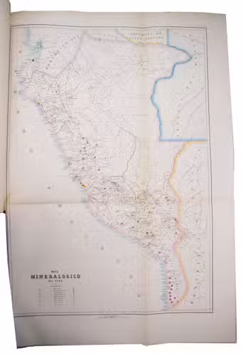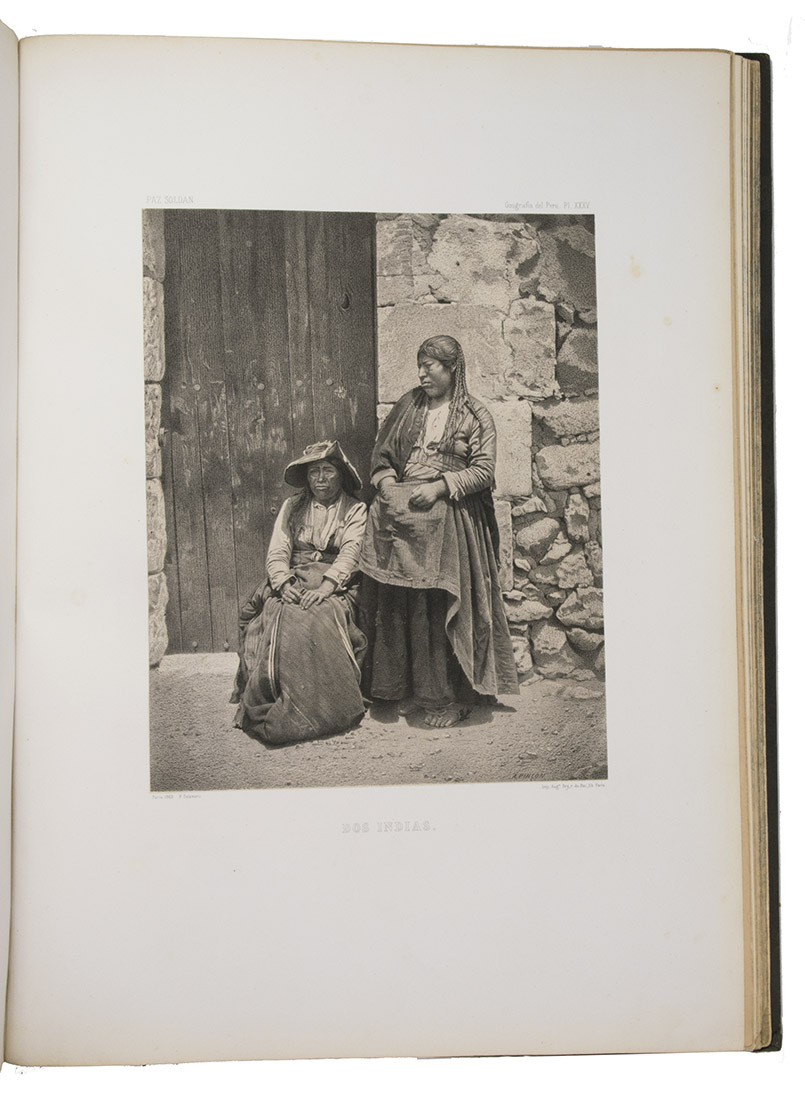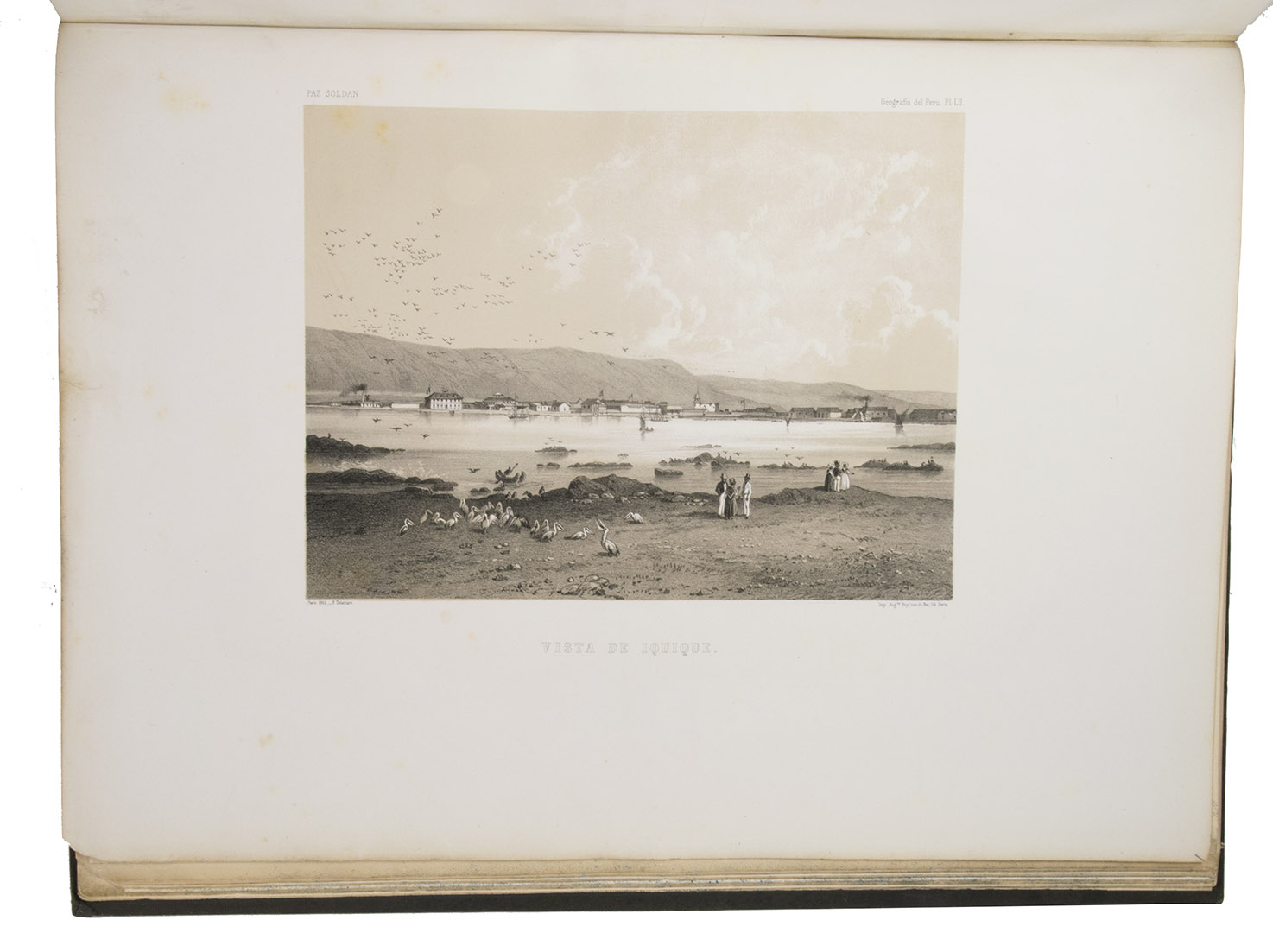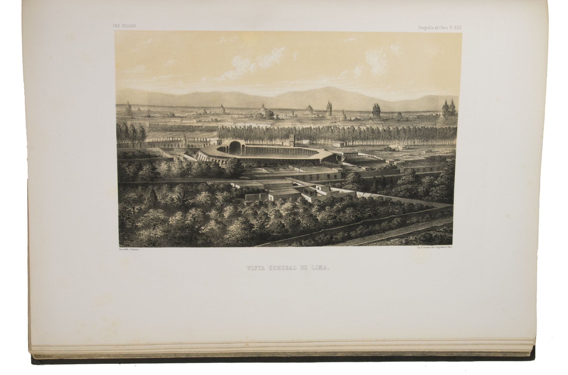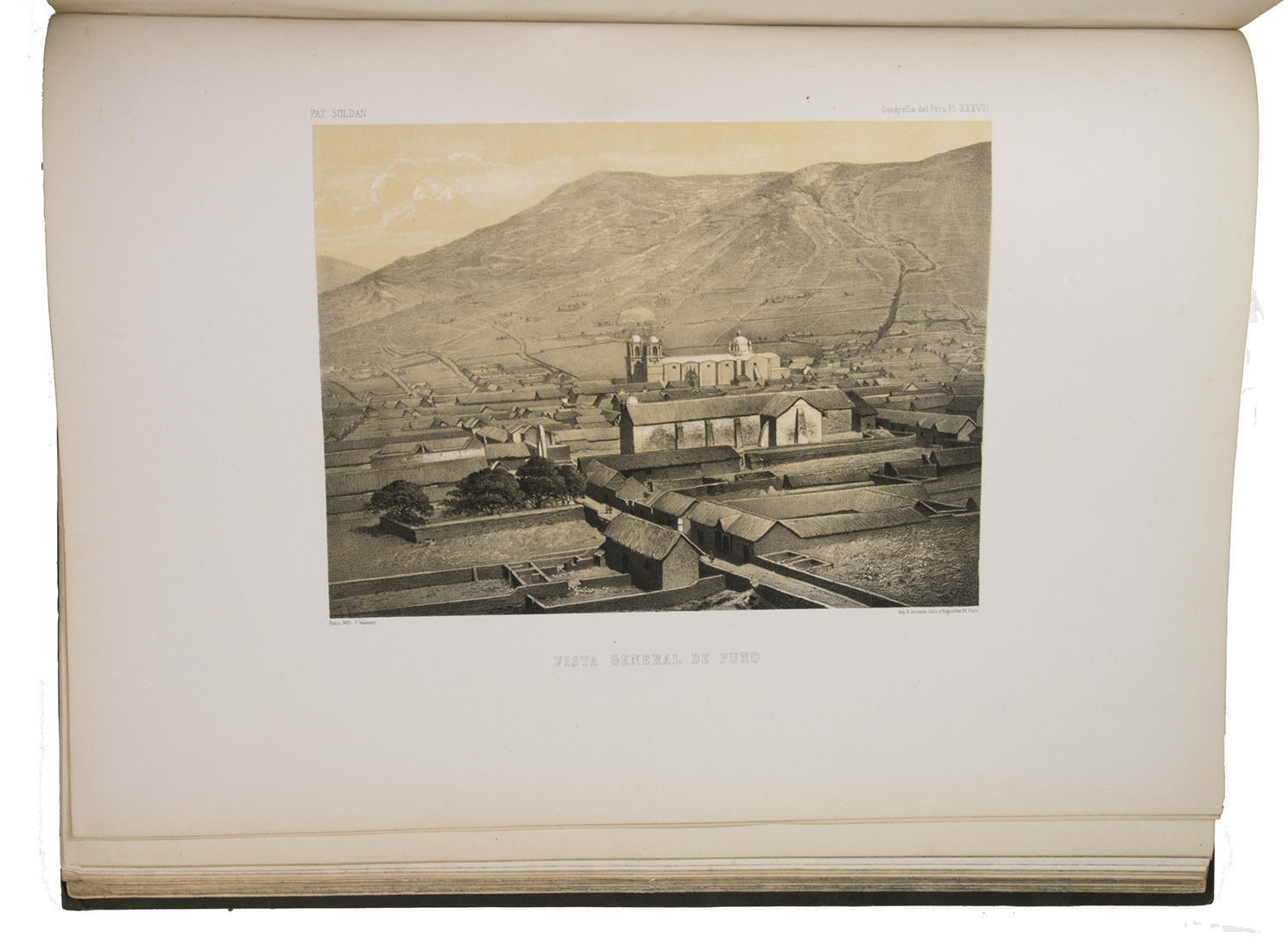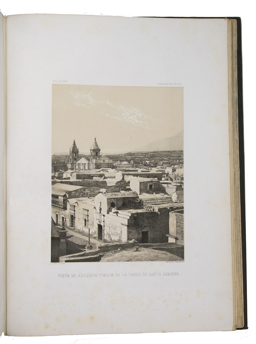 The first atlas of Peru containing detailed maps, plans and fine views, together with geographical and statistical information on Peru by the Peruvian historian, geographer and statesman Mariano Felipe Paz Soldan (1821-1886). With 3 full-page tinted lithographed portraits of Peruvian Indians. (plates 35, 35 bis, 35 ter). Further with a large magnificent folding lithographed panorama of Paz Soldan's home town of Arequipa (plate 42, 44 x 154 cm), and a large tinted folding lithographed view titled "Cuadro general de alturas comperativas del Peru" (plate 63). The large coloured mineralogical map titled "Mapa mineralogico del Peru" (plate 62) indicates the gold-mining sites with gold circles.