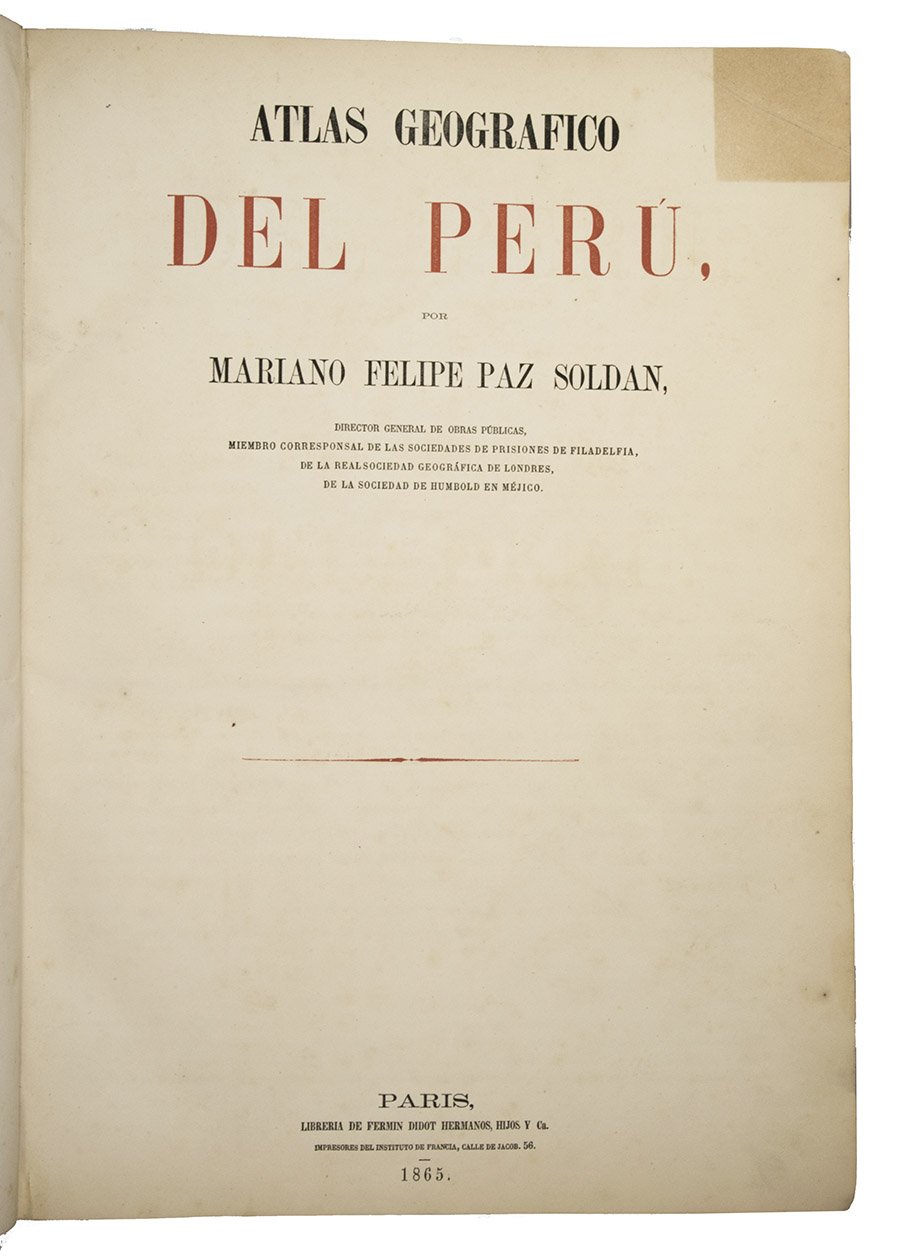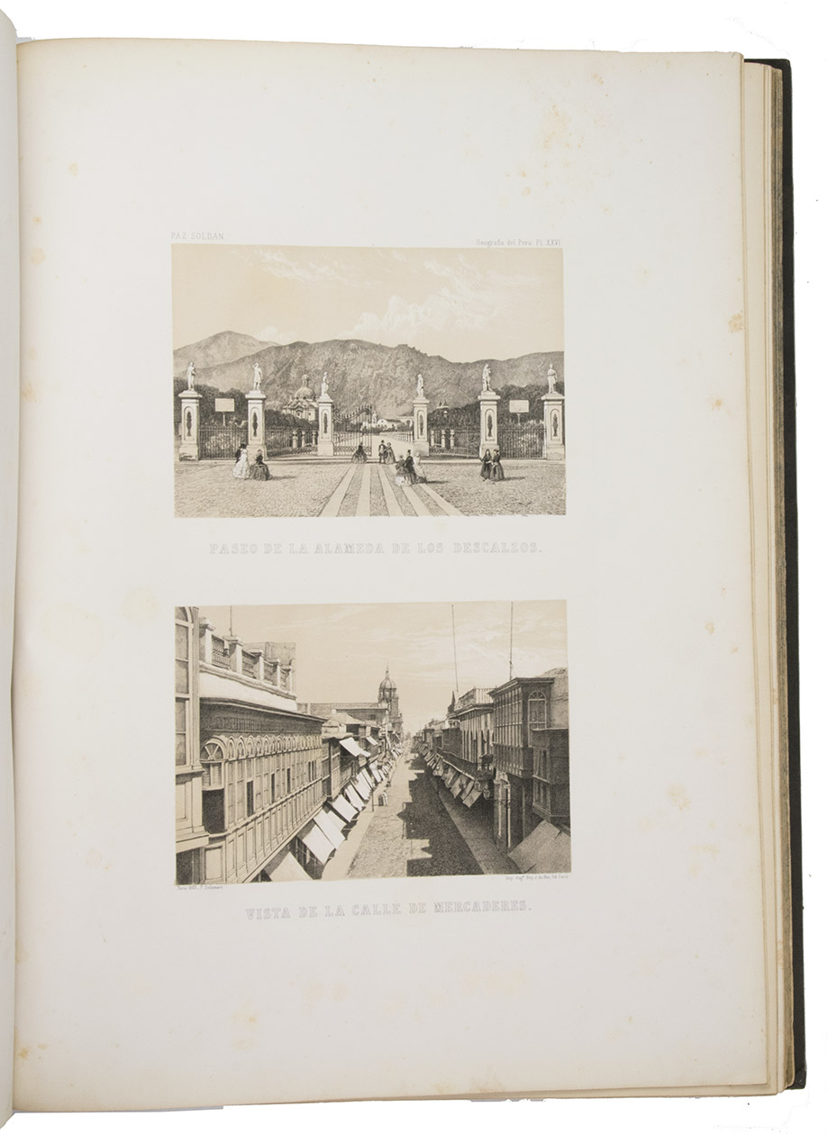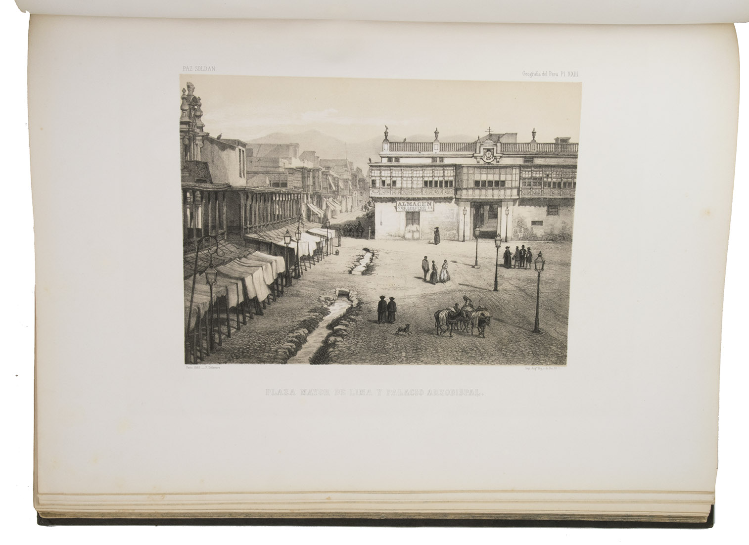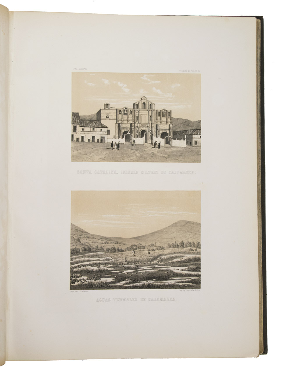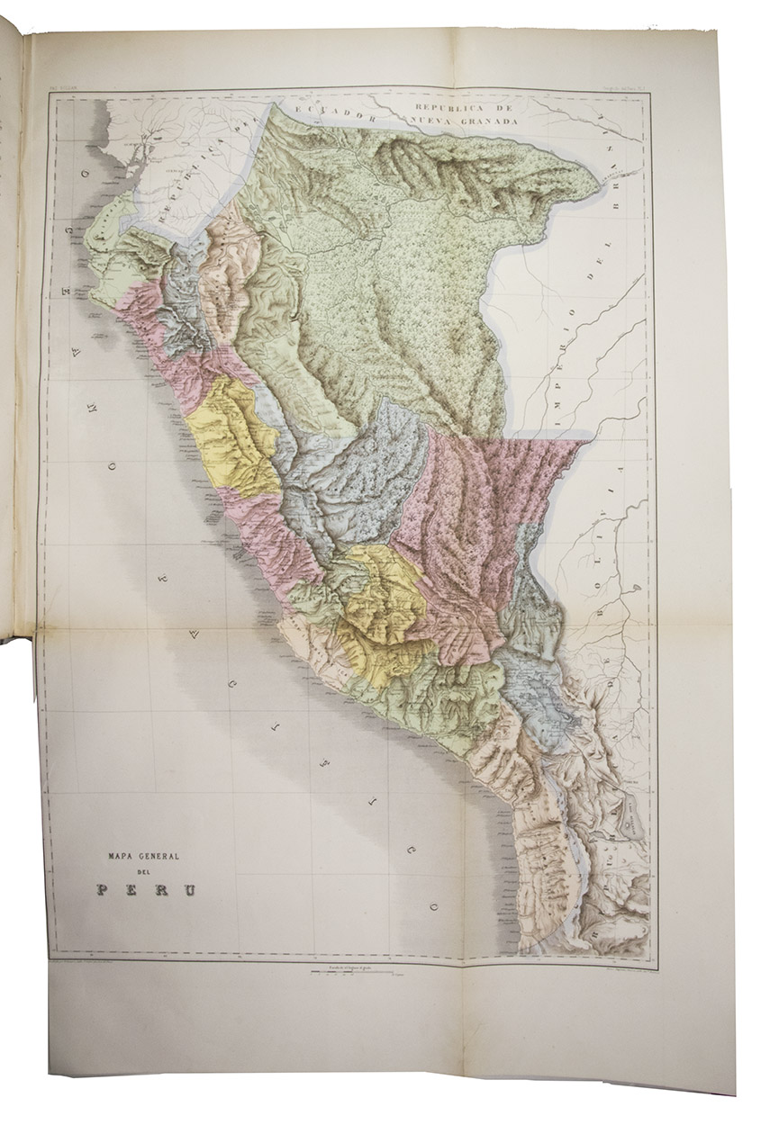 The first atlas of Peru containing detailed maps, plans and fine views, together with geographical and statistical information on Peru by the Peruvian historian, geographer and statesman Mariano Felipe Paz Soldan (1821-1886). With 3 full-page tinted lithographed portraits of Peruvian Indians. (plates 35, 35 bis, 35 ter). Further with a large magnificent folding lithographed panorama of Paz Soldan's home town of Arequipa (plate 42, 44 x 154 cm), and a large tinted folding lithographed view titled "Cuadro general de alturas comperativas del Peru" (plate 63). The large coloured mineralogical map titled "Mapa mineralogico del Peru" (plate 62) indicates the gold-mining sites with gold circles.
