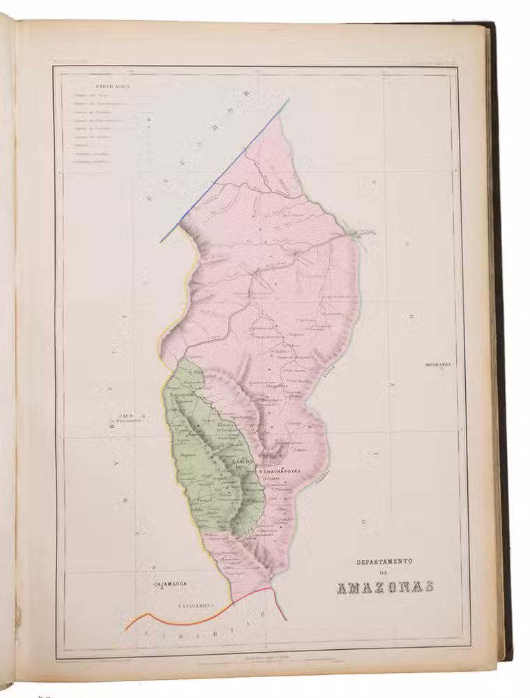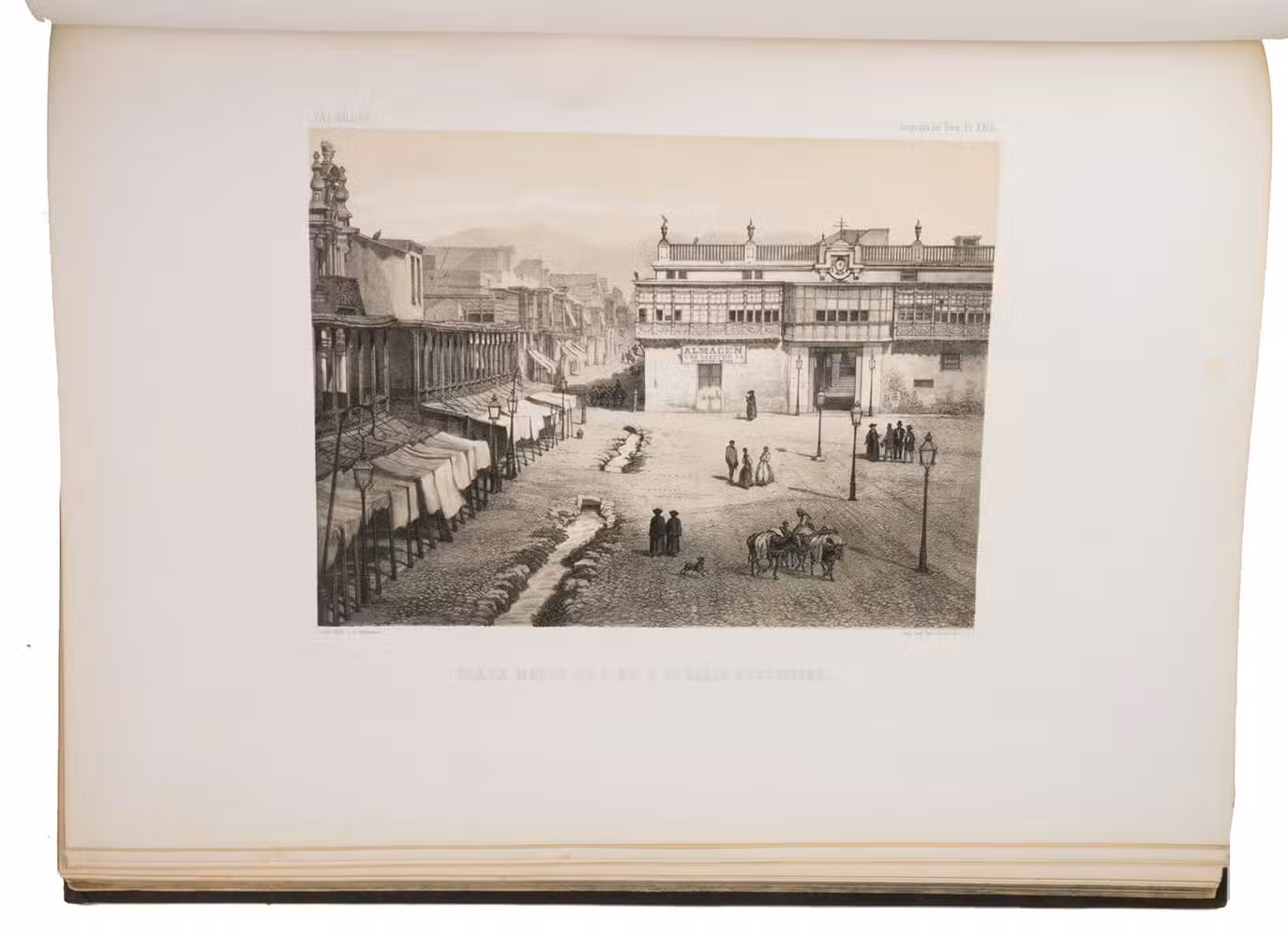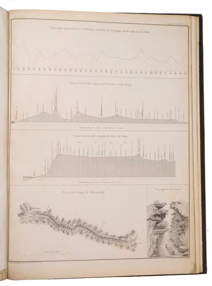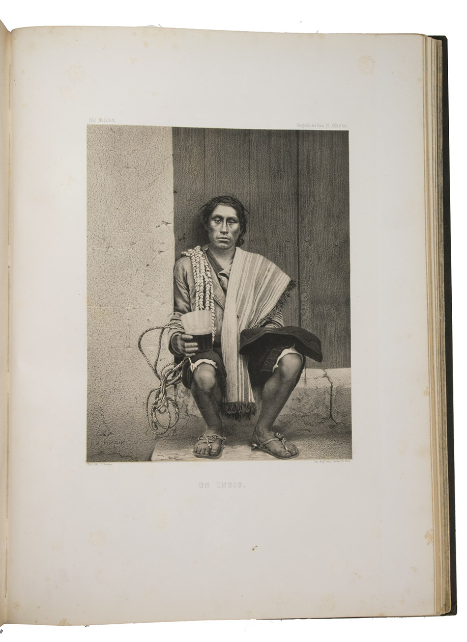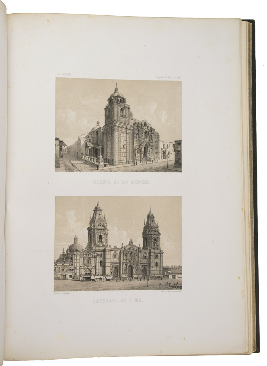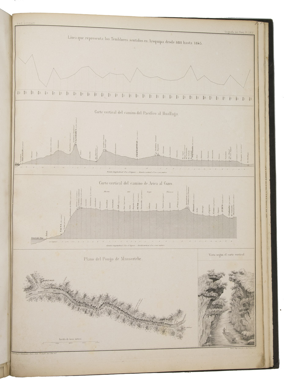 The first atlas of Peru containing detailed maps, plans and fine views, together with geographical and statistical information on Peru by the Peruvian historian, geographer and statesman Mariano Felipe Paz Soldan (1821-1886). With 3 full-page tinted lithographed portraits of Peruvian Indians. (plates 35, 35 bis, 35 ter). Further with a large magnificent folding lithographed panorama of Paz Soldan's home town of Arequipa (plate 42, 44 x 154 cm), and a large tinted folding lithographed view titled "Cuadro general de alturas comperativas del Peru" (plate 63). The large coloured mineralogical map titled "Mapa mineralogico del Peru" (plate 62) indicates the gold-mining sites with gold circles.