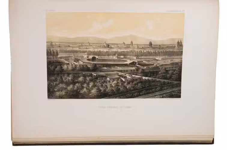 Paris, Firmin Didot brothers, children and comp., 1865. Large folio (51.5 x 37.5 cm). With 50 engraved maps, plans and views (including 20 coloured) and 24 tinted lithographs by F. Delamare. Contemporary black half sheepskin, rebacked. [2], 82 pp.