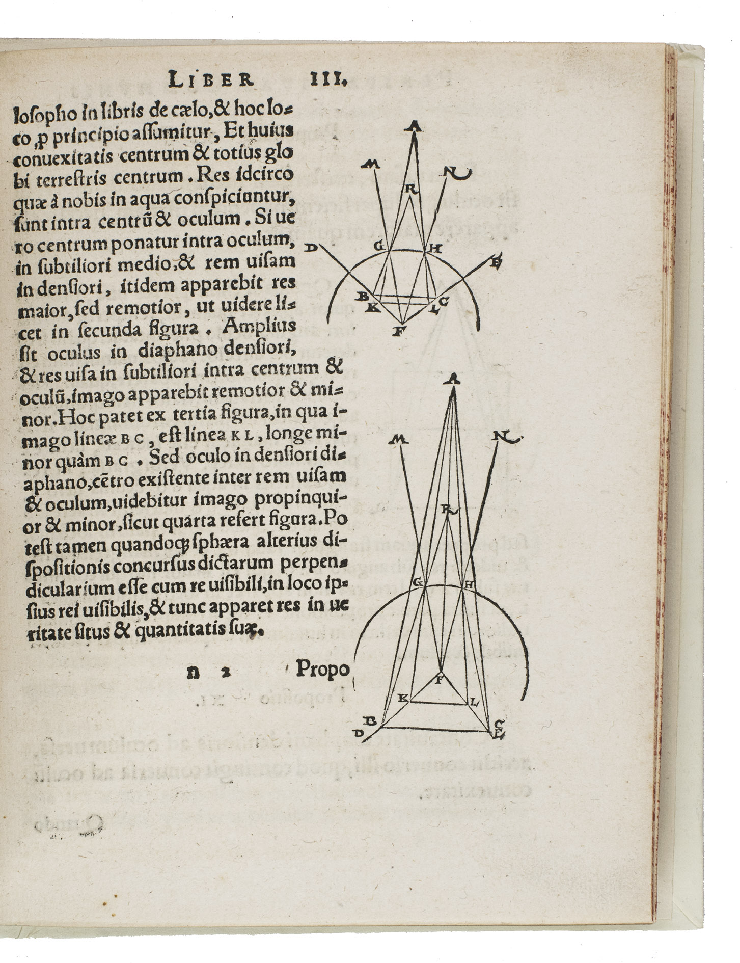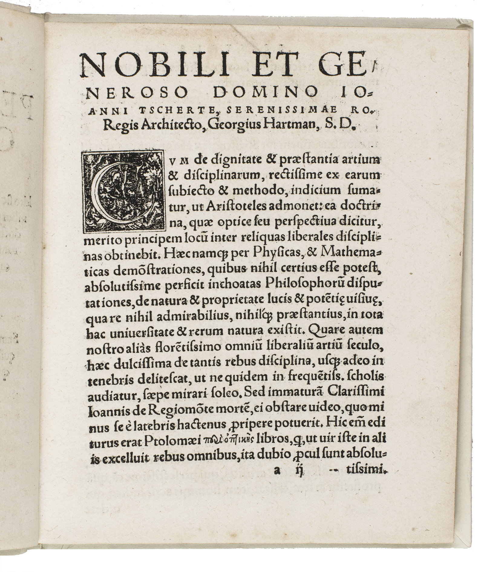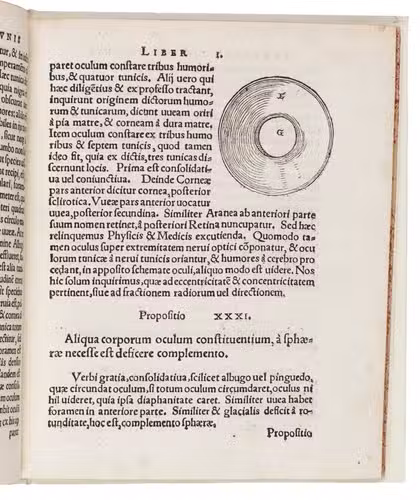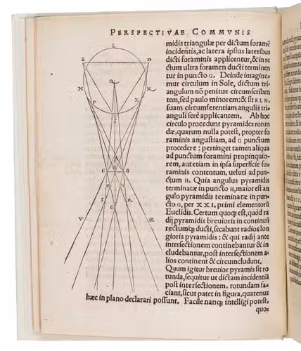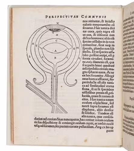 An important edition in the original Latin, the first to be edited by Hartman, of the English Franciscan John Peckham's Perspectiva communis, one of the earliest works on perspective, written in the late 1200s and first printed ca. 1482/83. Divided into three parts, the Perspectiva communis presents 162 propositions: 84 on optics (the anatomy and the physiology of the eye), 56 on catoptrics (the reflexion of light) and 22 on dioptrics (the refraction of light). This last part also contains descriptions of a rainbow, the milky way and a camera obscura, the predecessor of photography. The 44 woodcuts illustrating the propositions were designed by Hartmann, and include a fine, large cross-section of the human eye, one of the earliest representations of the eye in print.