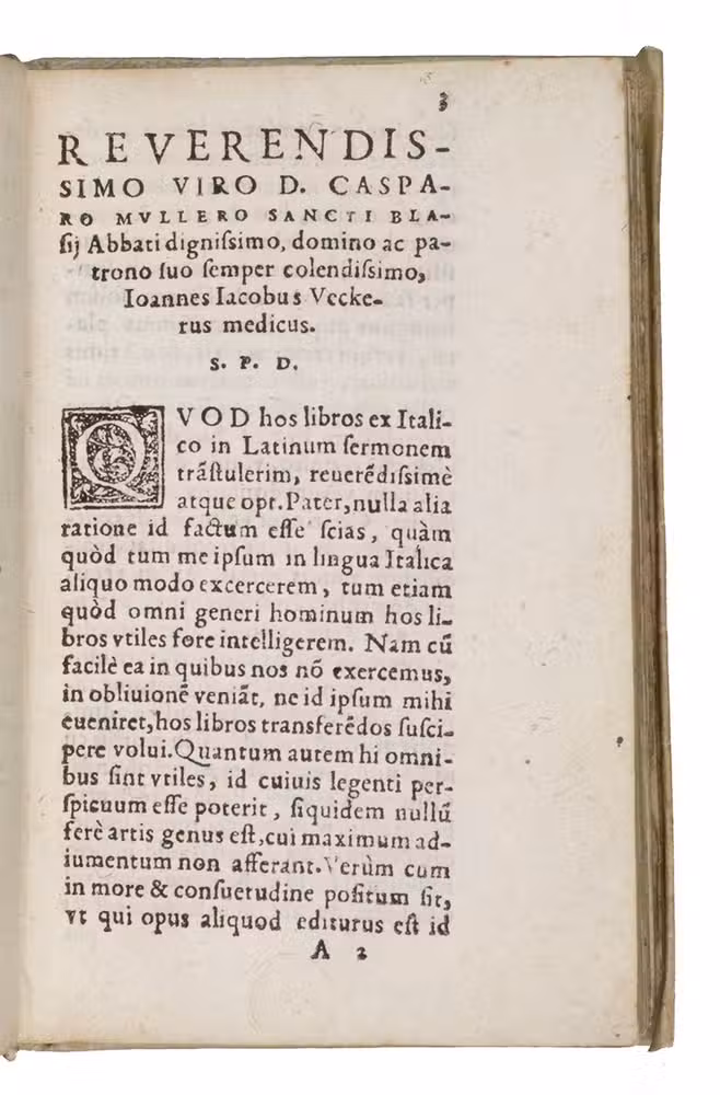 The translator Johannes Jacob Wecker (1528-1586) was a Swiss physician and philosopher. He worked as a physician in Colmar from 1566 and wrote a number of works about medicine, some of which were in both French and Latin, the most well-known being his Antidotarum generale, a work about alchemy. His work is known for the elaborate bibliography on chemistry-alchemy. Doubtless fleeing accusations of sorcery, Wecker moved to Basel where he was appointed professor of logic.