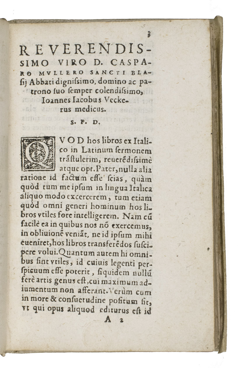 Fourth edition of the translation into Latin of the famous Secreti of Alexius Pedemontanus (or Piemontese, ps. of Girolamo Ruscelli (1500-1565), as is generally assumed), by Johann Jakob Wecker. The first edition of this translation had appeared in Basel, published by Petrus Perna, in 1559, followed by two editions in 1560 (Basel and Antwerp); a fifth edition was also published in Lyon in 1565.