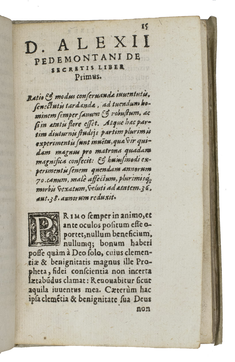 Owner's stamp (with initials A. D. C.?) in the lower margin of the title-page. In very good condition. Adams, A729; Durling, 110; Duveen, p. 15; Ad Stijnman, A short-title bibliography of the Secreti by Alessio Piemontese 044; Wellcome, 178; cf. W. Eamon, Science and the Secrets of Nature: Books of Secrets in Medieval and Early Modern Culture (Princeton 1994); Ferguson, Hist. of Inventions and books of secrets, I/5, pp. 30-31; Thorndike VI, p. 215.