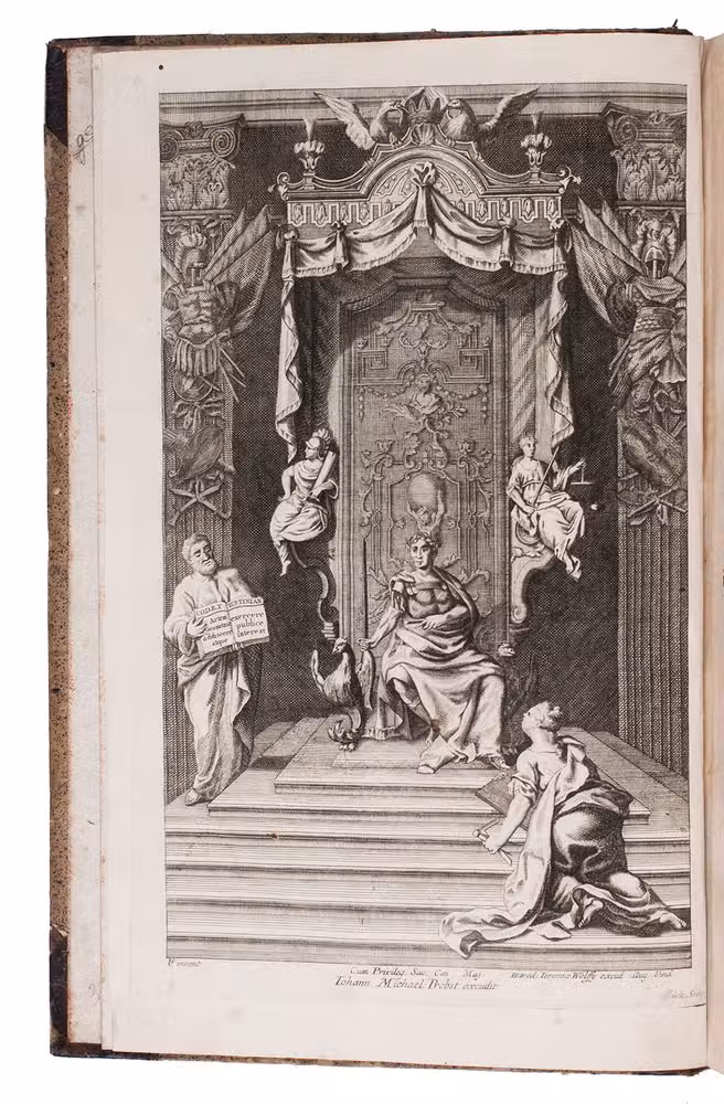 Augsburg, J.M. Probst, 1788-1790. 2 parts in 1 volume. Folio. With 2 engraved frontispieces, second title-page with half-page engraved town view, and 39 folding engraved plates. Contemporary half calf. [6], 97, [5]; 55 pp.