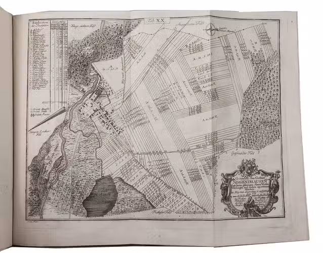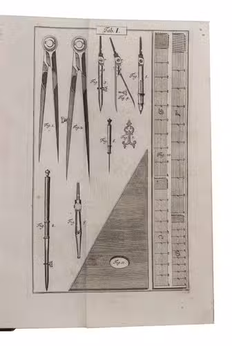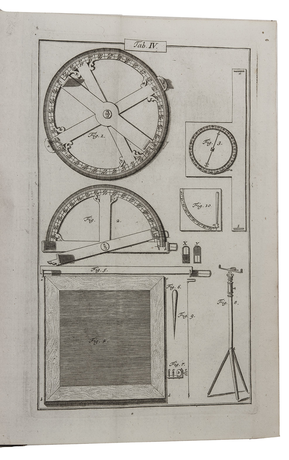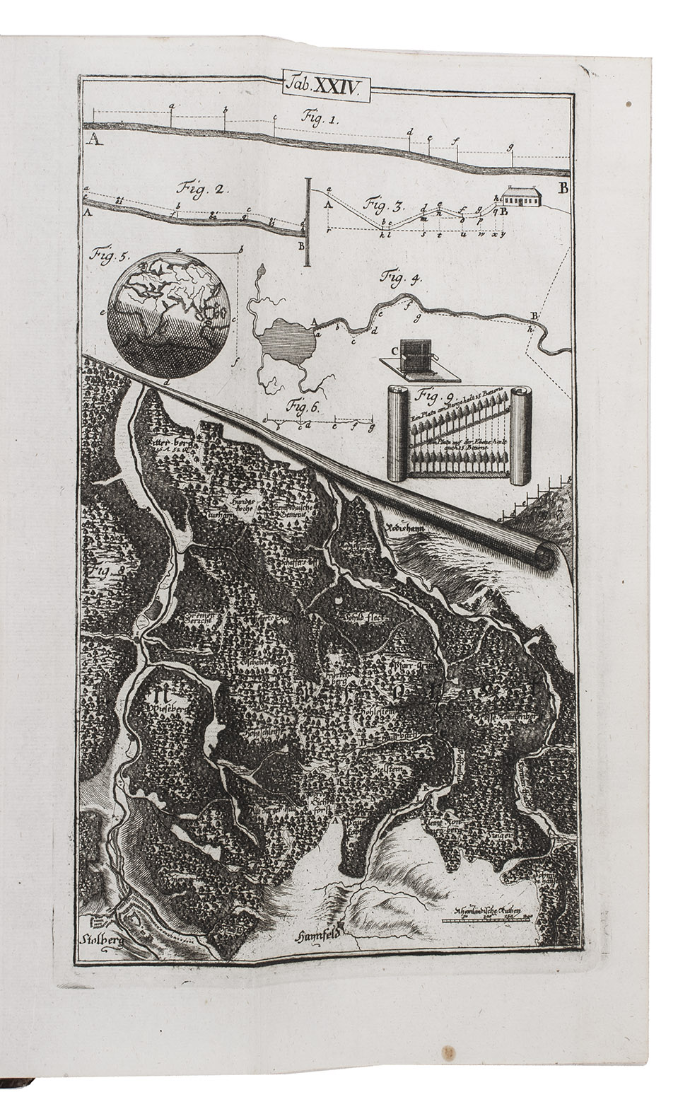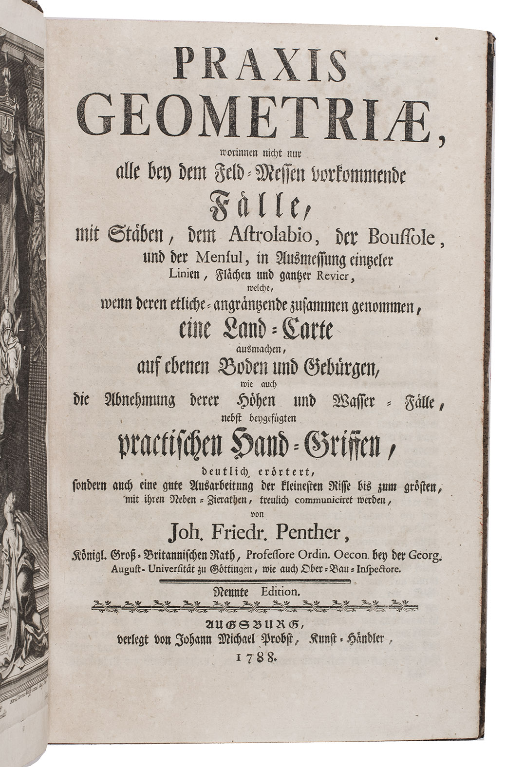 Ninth edition of "one of the most popular German works on surveying" (Sotheran). Johann Friedrich Penther (1693-1749), professor of mathematics and economy at the university of Göttingen) deals with geometry and its application in surveying. He discusses the instruments used, such as rules, compasses, graphometer, geometrical circle, geometrical table, surveyor's level pole, and shows how to calculate the size of differently shaped surfaces, circles, cones and cylinders, how to draw multiple-angled surfaces, circles, etc., how to calculate distances in flat areas and mountainous terrain, how to divide a piece of land, how to draw a fortification, etc. The Zugabe deals with the calculation of the contents of cones and cylinders. This knowledge is applied to tunnels, architecture (sloping walls, arches, etc). Penther also includes his design for a surveyor's level pole. Each subject is accompanied by a folding engraved plate showing measuring instruments, geometrical figures, maps of lakes, roads, estates, architectural structures, etc. Penther's lucid style and the attractive illustrations made his work very popular and it went through nine editions (see Sotheran, who states there were eight editions).