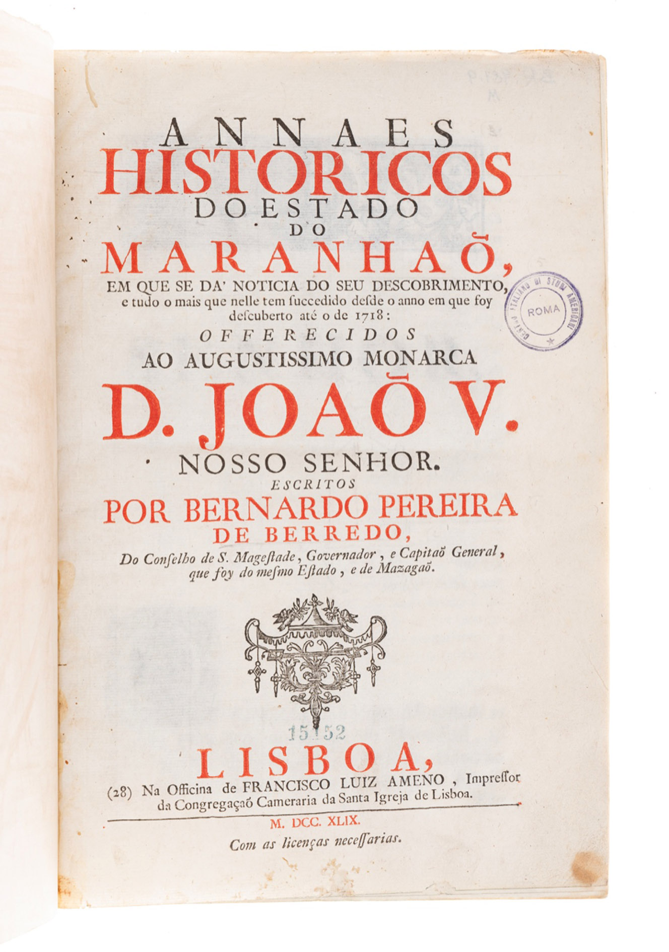 Bernardo Perreira de Berredo was Governor of the Maranhao province from 1718-1722; he died in 1748 at Lisbon, whilst preparing this work for the press. Sabin quotes Southey saying "(Pereira)... has left for himself a more durable remembrance in his historical annals of the state over which he presided".
