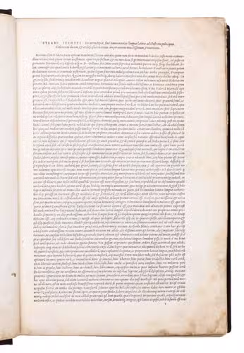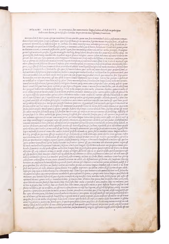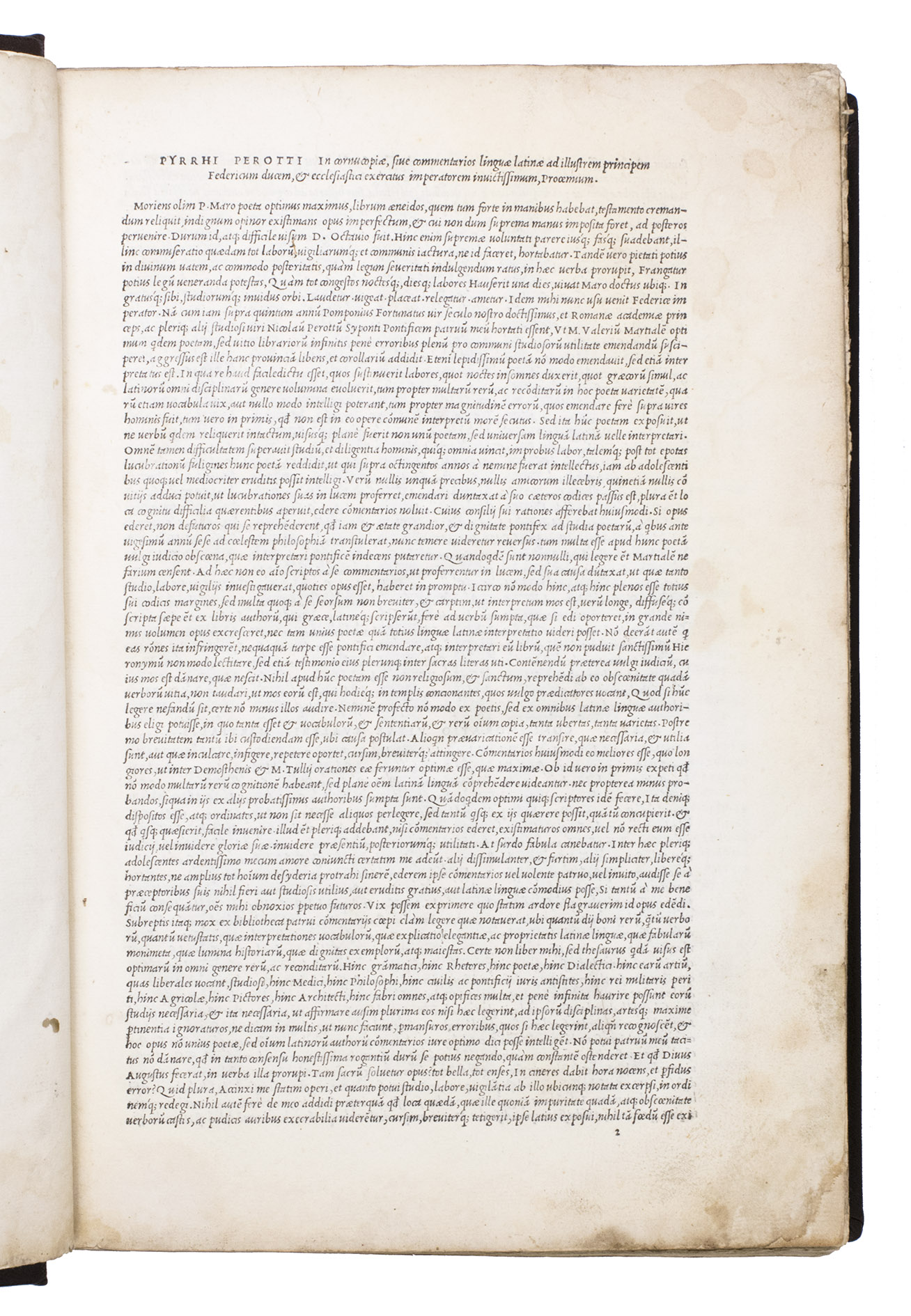 The greater part of this impressive Aldus edition is occupied by the Cornucopia of the Italian humanist Perotti. Written as a commentary on book I of Martial, it includes a discussion on almost every word of Martial's text and thus transcended its original ambition, becoming a standard work of reference on the Latin language. One commentator calls it "a massive encyclopaedia of the classical world. Every verse, indeed every word of Martial's text was a hook on which Perotti hung a densely woven tissue of linguistic, historical and cultural knowledge". The work was dedicated to the condottiere Federico da Montefeltro of Urbino (whose portrait was painted by Pierro della Francesco). The work was revised and expanded by Perotti's son Pyrrhus who made a number of additions of his own.