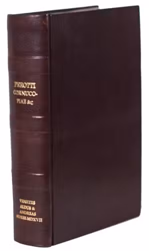 The first edition of the Cornucopia was published in Venice by Paganino de Paganin in 1489; the first Aldine edition in 1499. Our edition is a page-for-page reprint of the second Aldus edition of 1513.