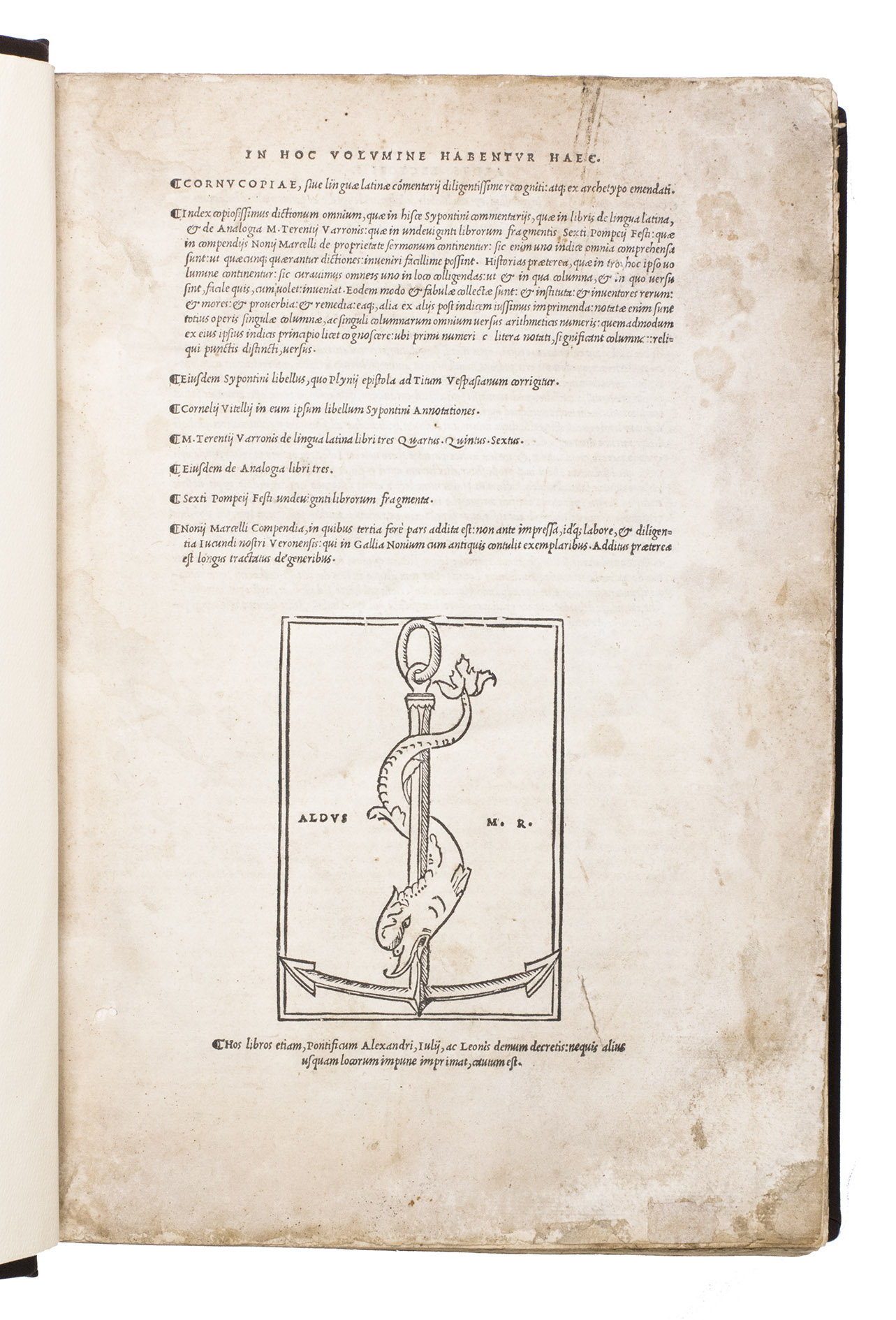 To the Cornucopia are added the three most important classical text on the grammar and etymology of the Latin language: (1) De lingua Latina by Marcellus Terentius Varro (116-27BC), a prolific classical author of whom only two works partly survive. In this Aldus edition the known books 4-6 of his most famous work De lingua Latina are given, together with the three books De analogia, which also belong to the De lingua Latina. (2) De verborum significatione of the Roman grammarian Sextus Pompeius Festus (2nd cent. AD), an epitome in 21 books of the encyclopaedic treatise of the same name by Valerius Flaccus. Festus gives the etymology as well as the meaning of many words, and his work throws considerable light on the Latin language, mythology and antiquities of ancient Rome. Of Festus's work, only a few fragments remain in only one single manuscript (in Naples). (3) De compendiosa doctrina by the Latin grammarian and lexicographer Nonius Marcellus (end 3rd, beginning 4th cent. AD), a "lexicon" in 20 sections or chapters. The first twelve deal with language and grammar, the remaining eight with special subjects (navigation, costume, food, arms). The work is a compilation from commentaries on the authors quoted (whom Nonius only knows at second hand) and from existing dictionaries and grammars.