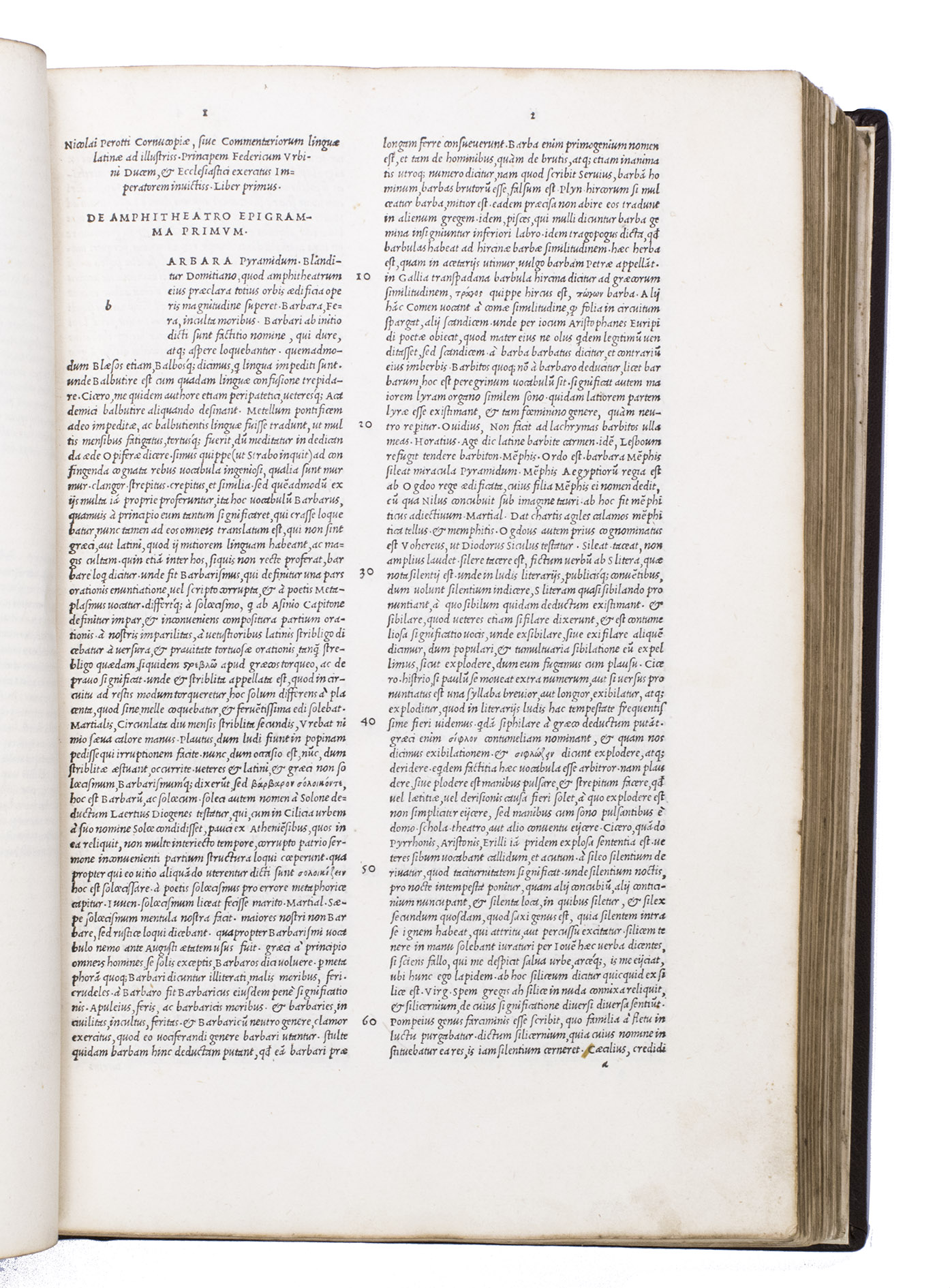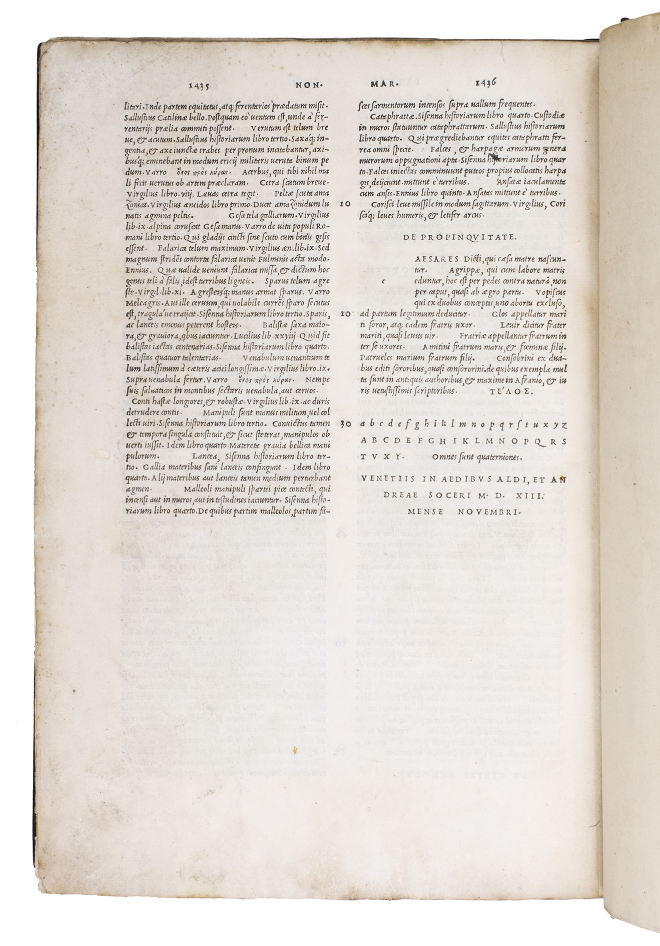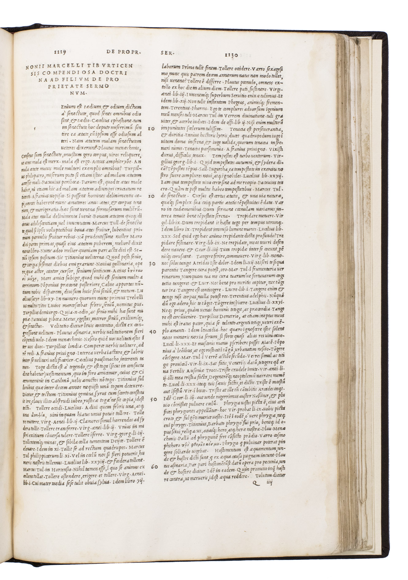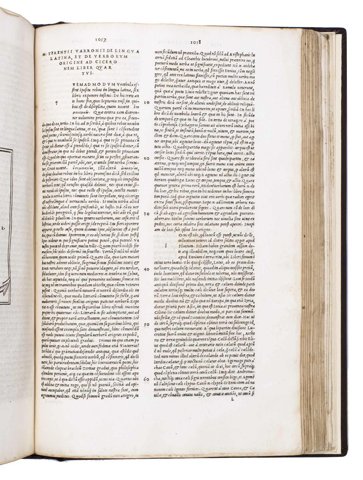 Third Aldine edition of this collection of the main texts on the Latin language available to the early humanists: the most important Renaissance dictionary/encyclopaedia, written by Niccolo Perroti, together with the three most important and influential classical texts on the subject by Varro, Festus and Nonius Marcellus.