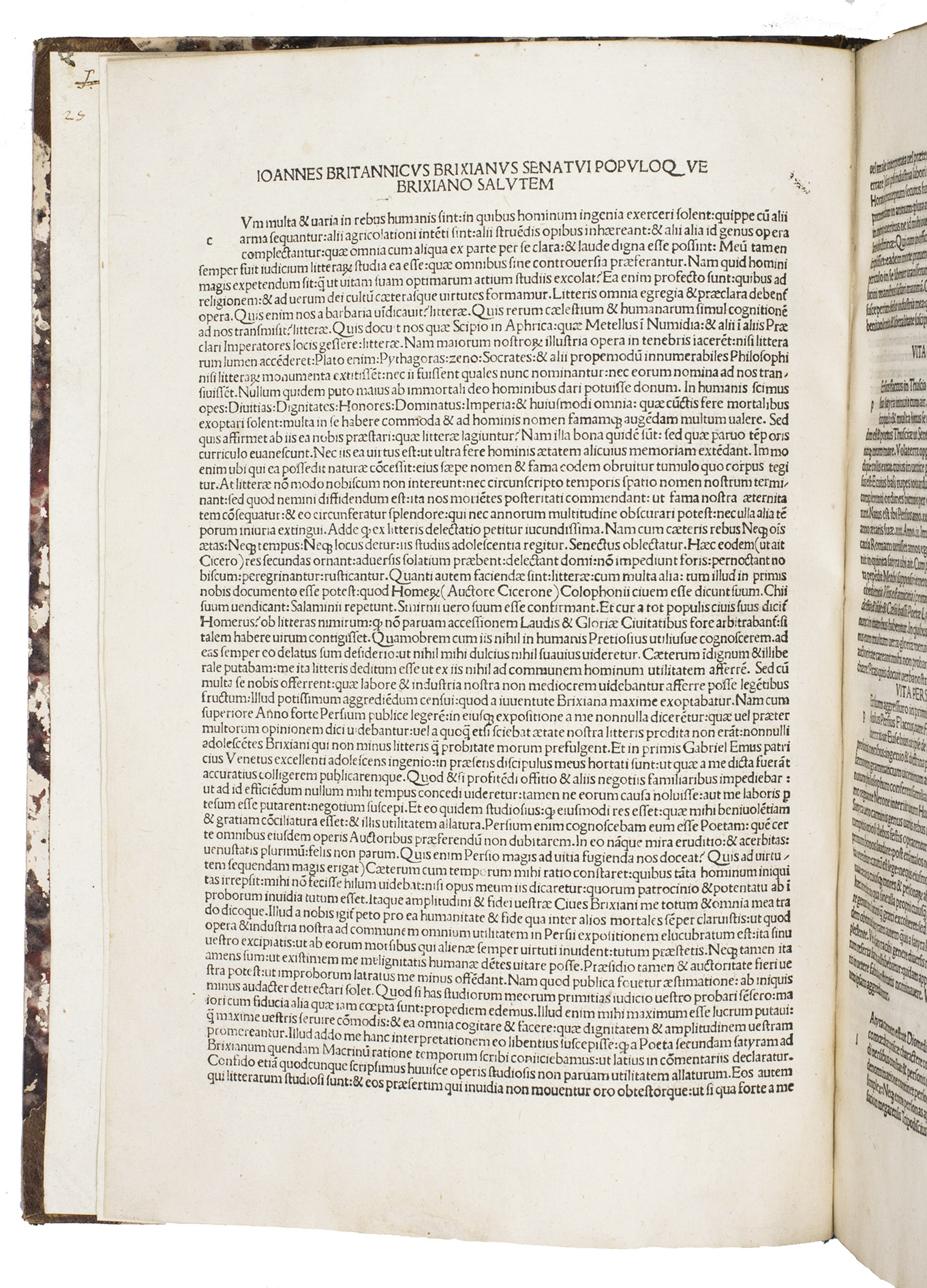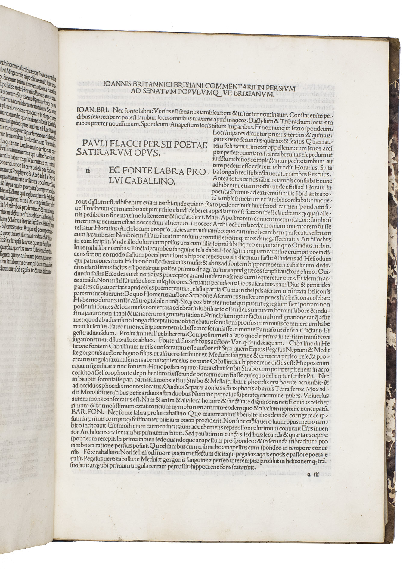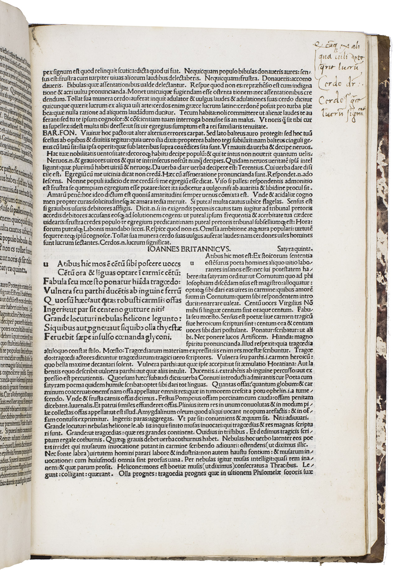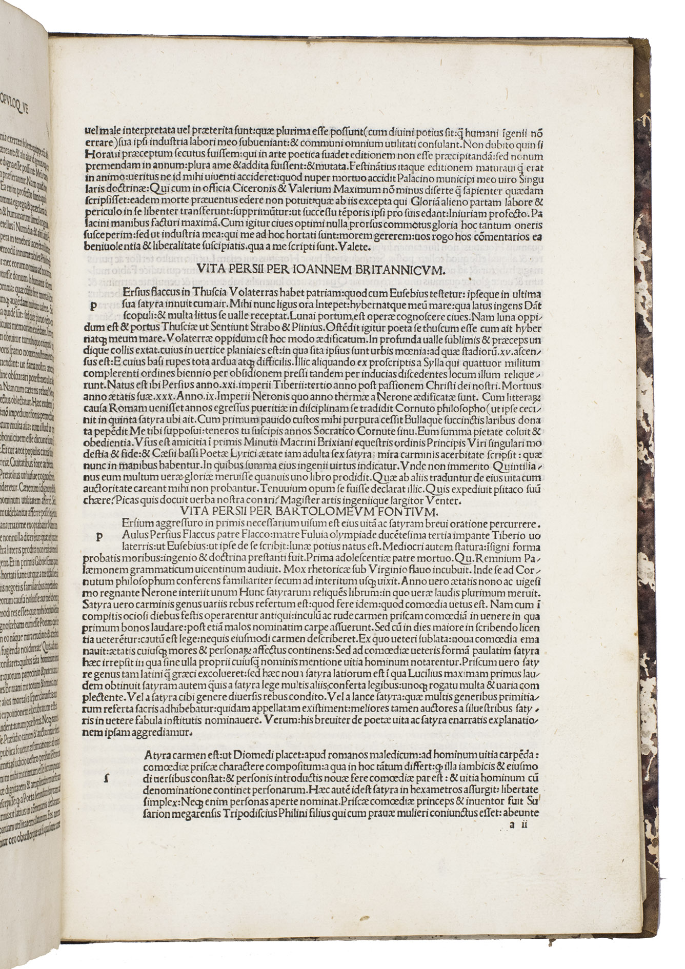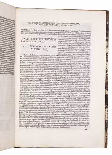 First incunable edition that brings together the Renaissance commentaries of Johannes Britannicus (ca. 1450-1518) and Bartholomaeus Fontius (1446-1513), this printing of the Satires of Aulus Persius Flaccus (34-62 CE) presents one of the most challenging and intellectually demanding works of Roman satire. The joint appearance of these commentaries marks a decisive moment in the reception of Persius, as they soon became the standard interpretative apparatus for his work throughout the late 15th and early 16th centuries.