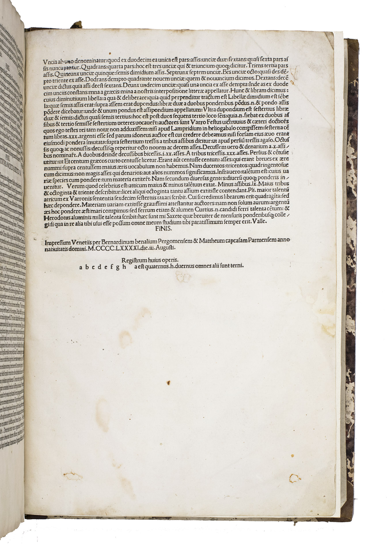 (Colophon:) Venice, Bernardinus Benalius & Matteo Capcasa, 3 August 1491. Folio. 19th-century gold- and blind-tooled half brown morocco and marbled paper sides, with the author, title, and impressum lettered in gold. [48] ll.