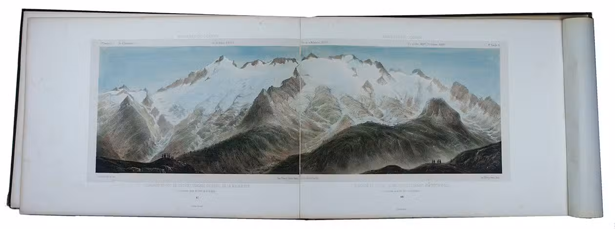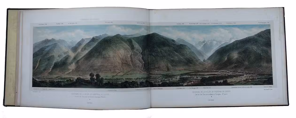 Paris, Charles Boivin; Pau, Auguste Bassy, [ca. 1850]. Oblong folio (26.5 x 37.5 cm). With a lithographed title-page with a hand-coloured vignette, and 29 numbered lithographed plates, all coloured by hand and some double-page (including 1 folding out vertically) or folding panoramas. All plates mounted on thick wove paper with letterpress captions. Contemporary gold- and blind-blocked dark green cloth, gilt edges.