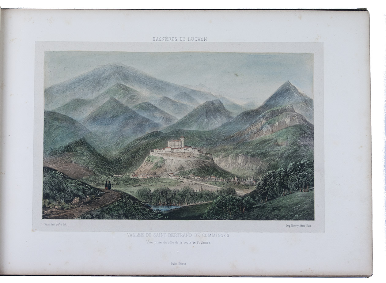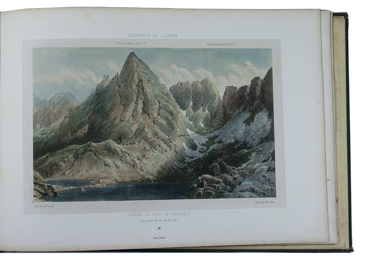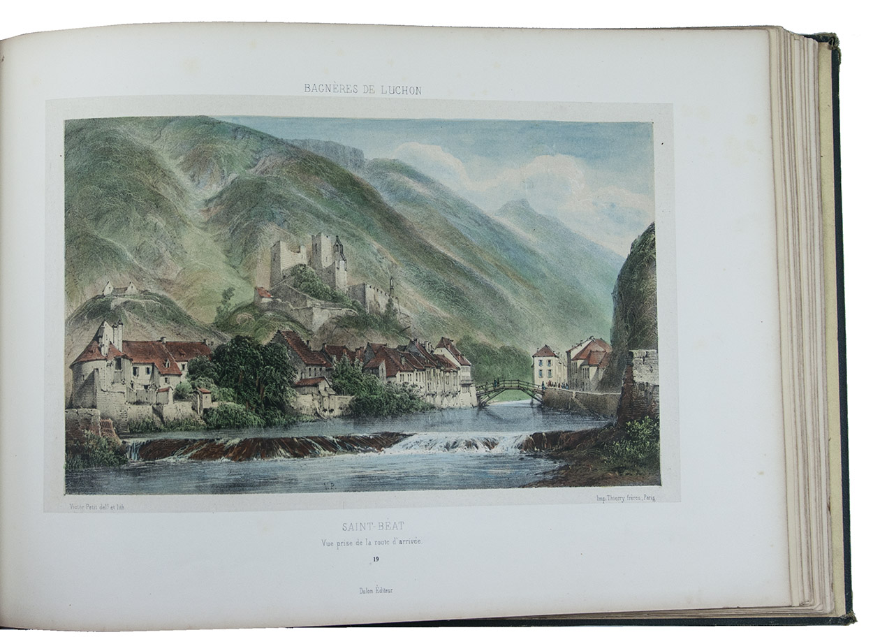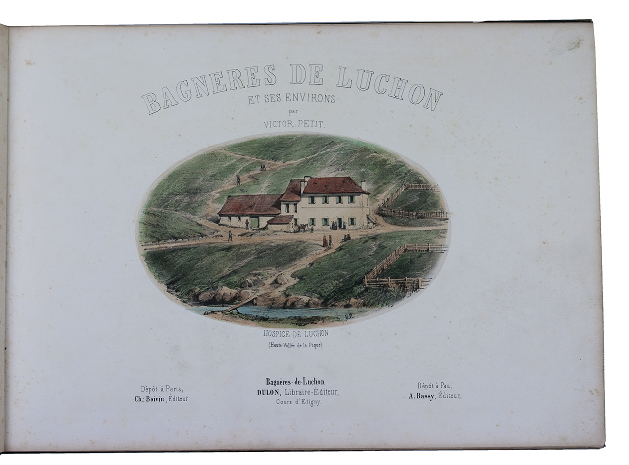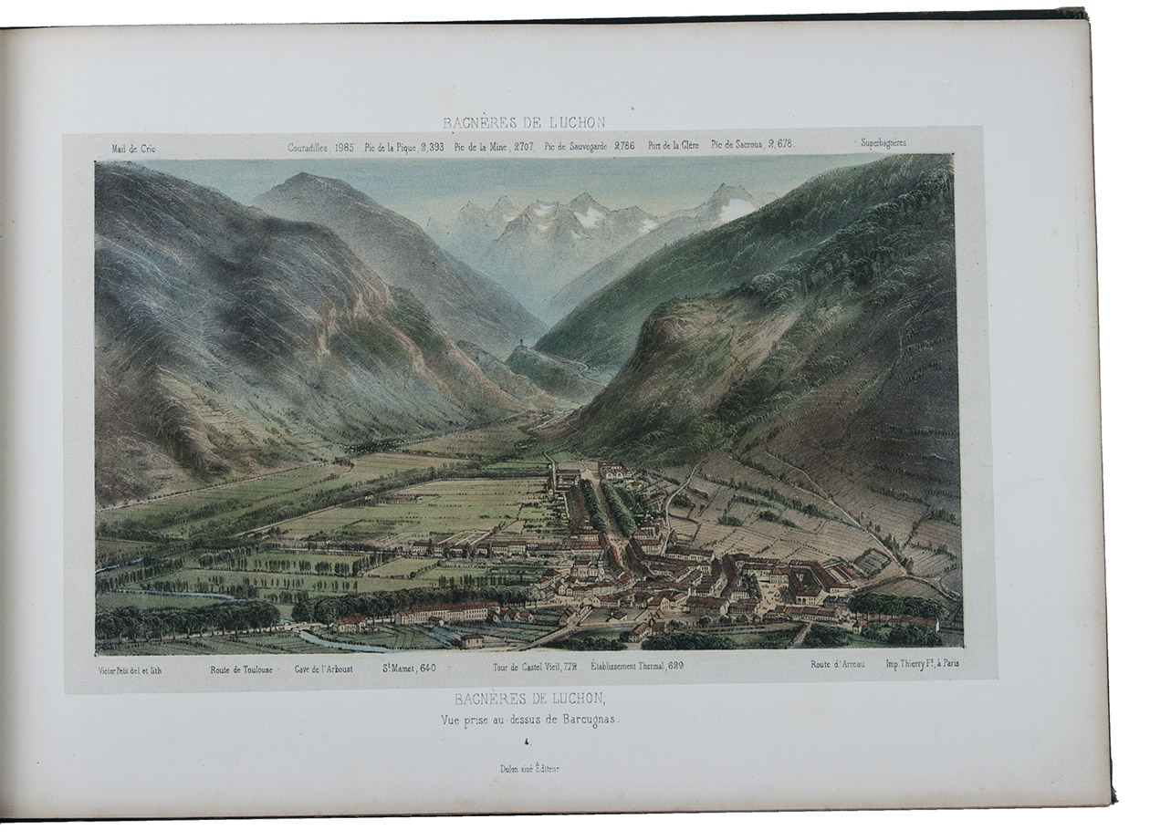 Attractive colour-plate book depicting the spa towns of Bagnères-de-Luchon, an area in the Pyrenees of southern France, adjacent to Spain. The illustrations show waterfalls, lakes, mountains, valleys, glaciers and some villages, each with a caption below the image and sometimes mentioning in the margins the names and heights of the mountains depicted. The plates are drawn and lithographed by the French artist Victor Petit (ca. 1817-1871) and printed by the Thierry brothers in Paris. Some of the plates were also inlcuded in Petit's Souvenirs des Pyrénées (1850).