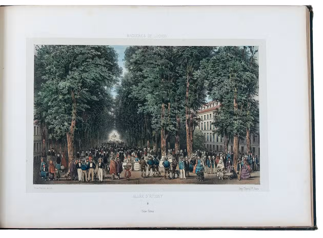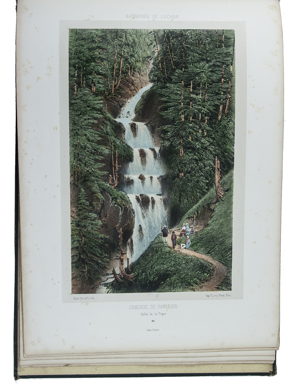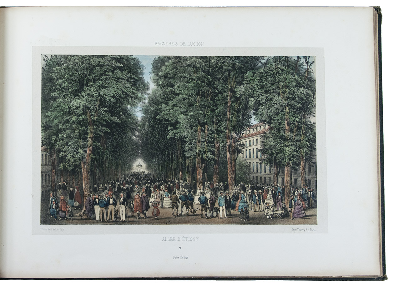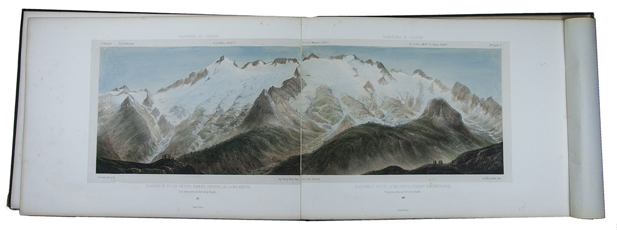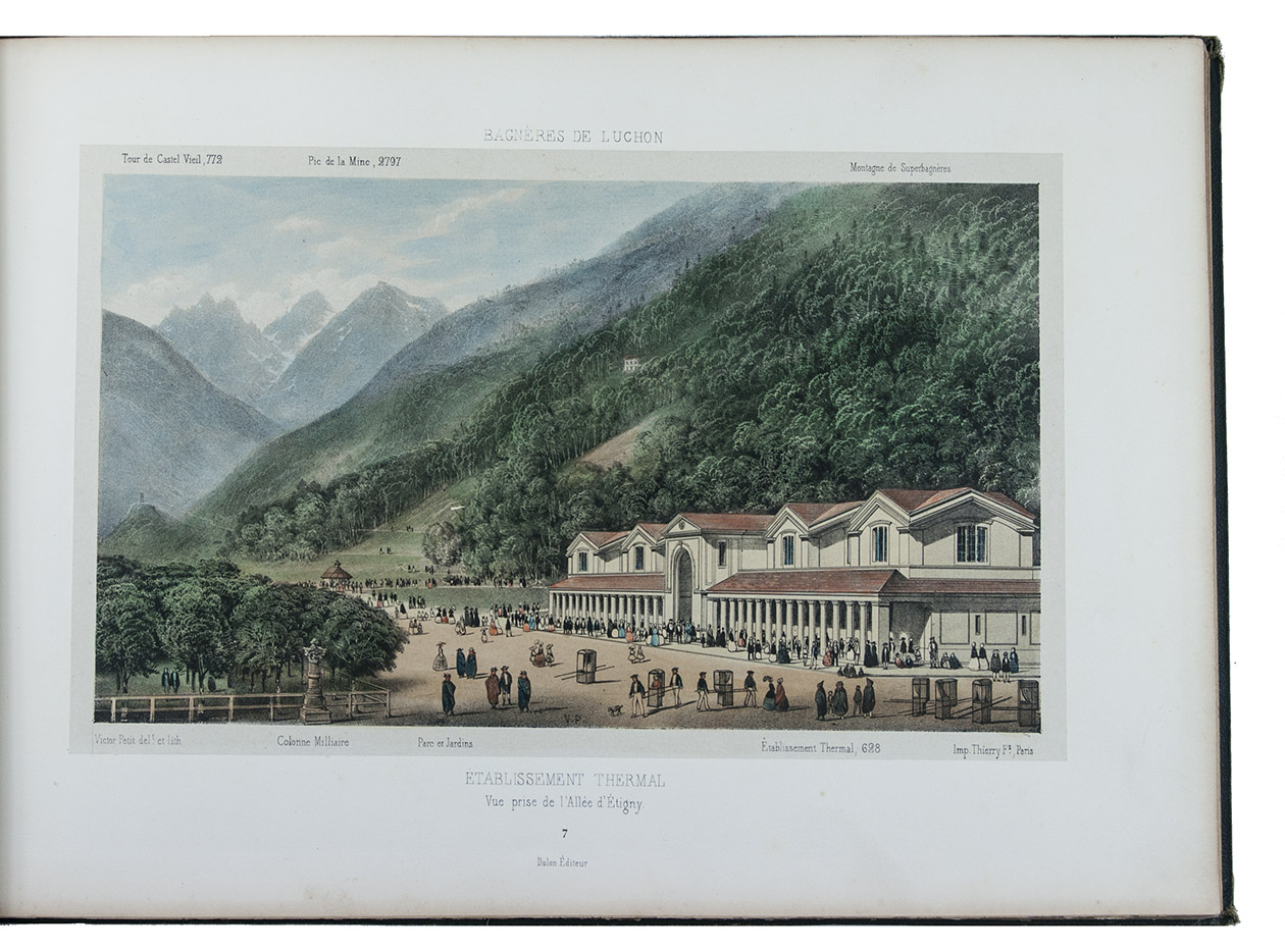 Attractive colour-plate book depicting the spa towns of Bagnères-de-Luchon, an area in the Pyrenees of southern France, adjacent to Spain. The illustrations show waterfalls, lakes, mountains, valleys, glaciers and some villages, each with a caption below the image and sometimes mentioning in the margins the names and heights of the mountains depicted. The plates are drawn and lithographed by the French artist Victor Petit (ca. 1817-1871) and printed by the Thierry brothers in Paris. Some of the plates were also inlcuded in Petit's Souvenirs des Pyrénées (1850).