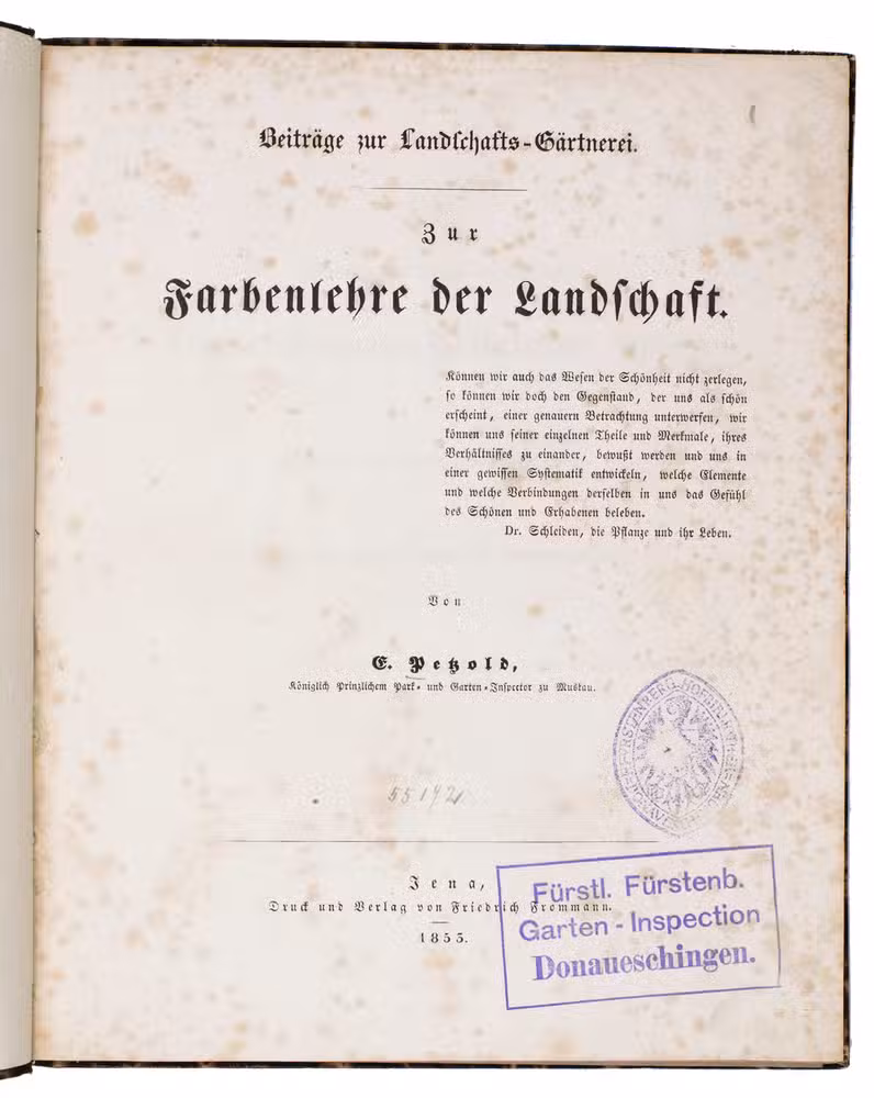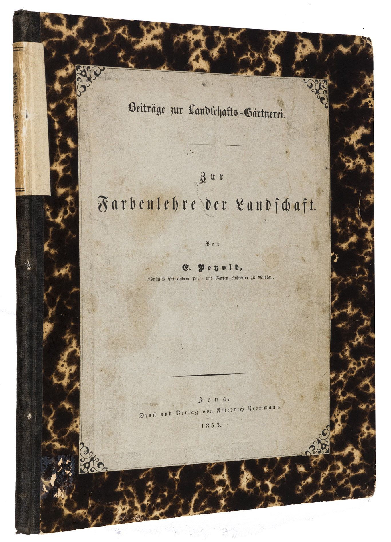 First edition of a thorough research into the science of colours and perspective, especially in relation to the designing and planning of gardens. Carl Eduard Adolph Petzold (1815-1891) worked as the park and garden inspector of Prince Pückler at Muskau, the Great Duke at Weimar, and Prince Frederik of the Netherlands respectively. Convinced that colour and perspective worked quite differently in a garden than on a painting, the author devoted a lifelong study to this subject, resulting in the present work.