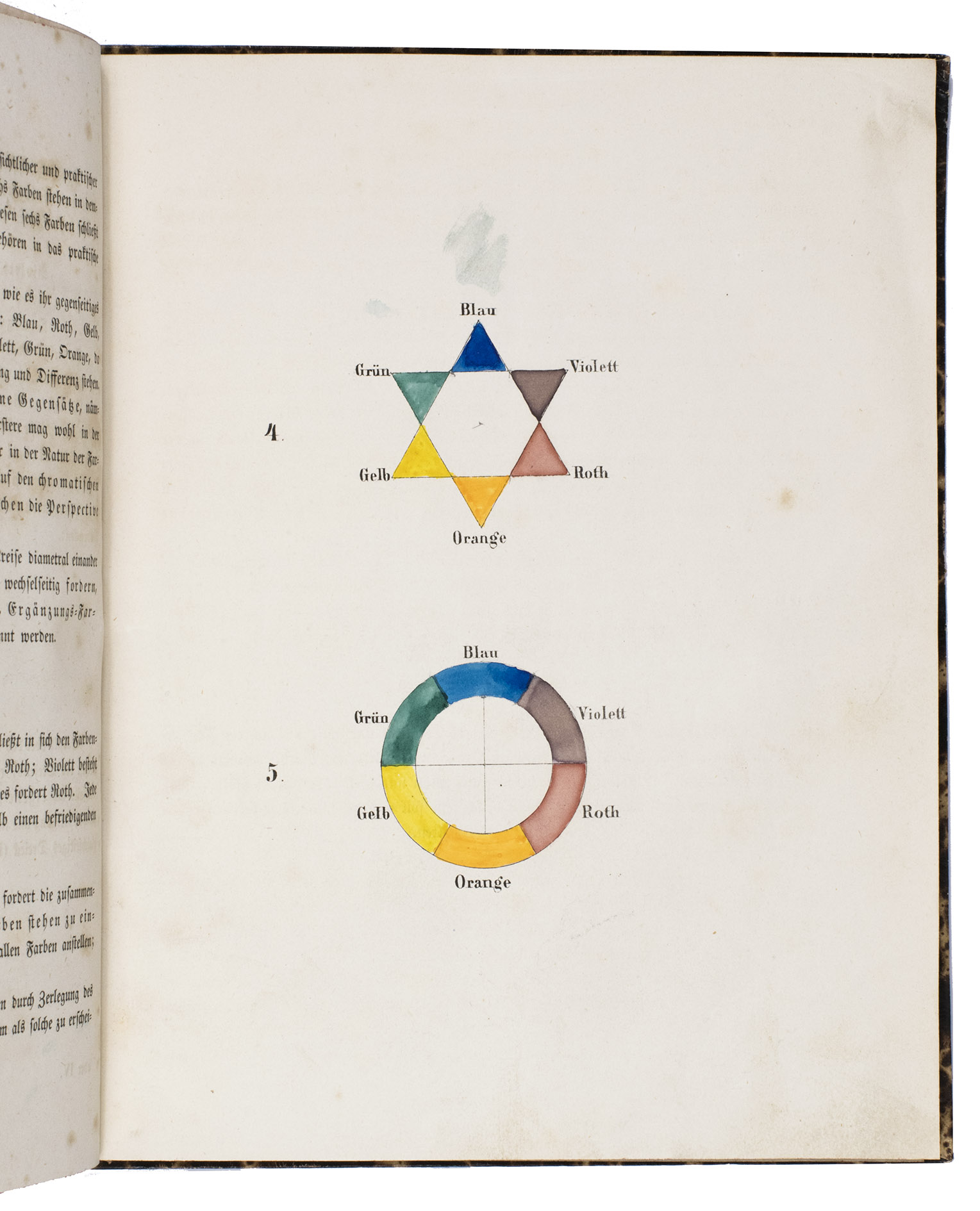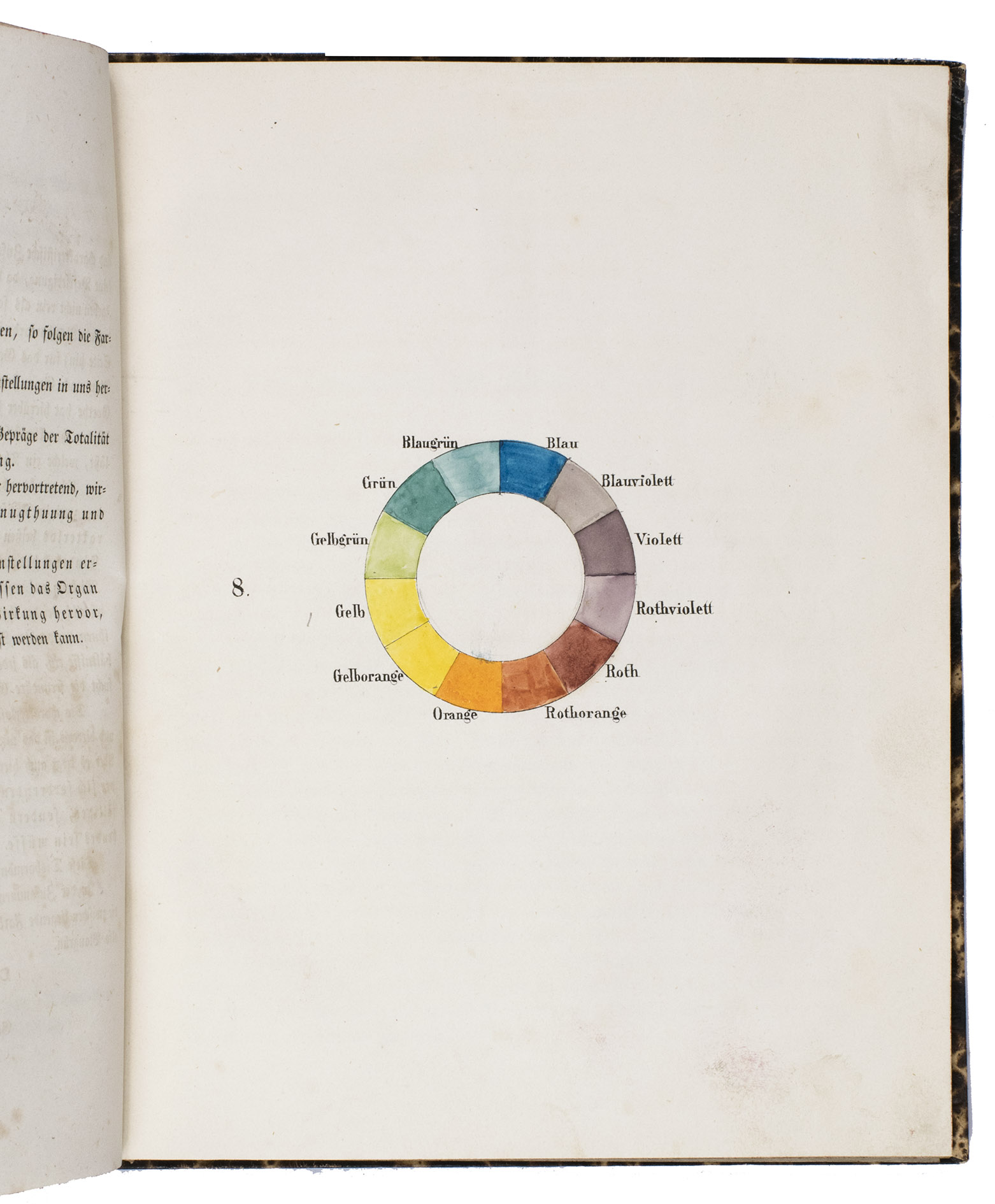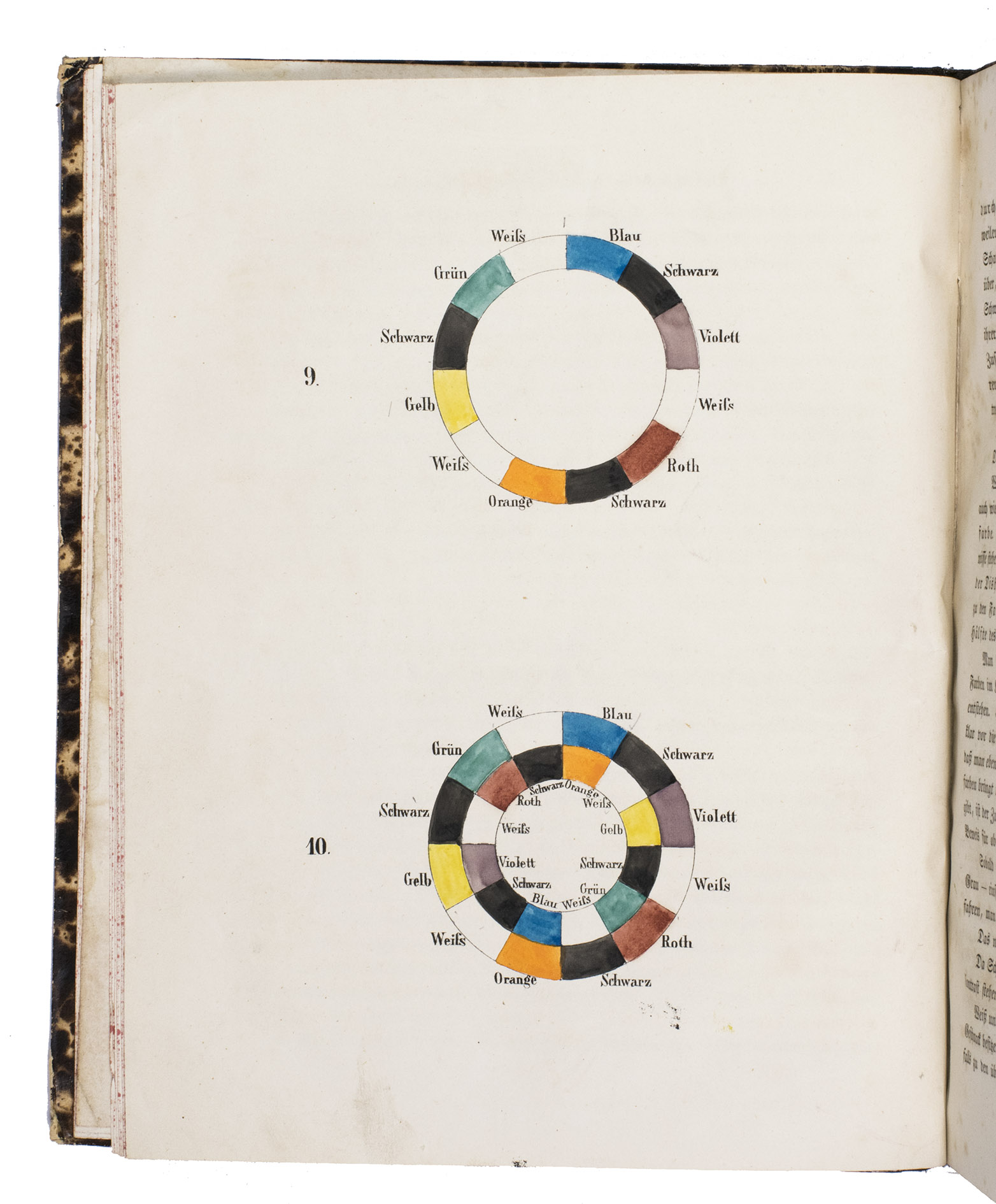 Jena, Friedrich Frommann, 1853. Small 4to (ca. 23 x 18.5 cm). With 7 variant diagrams of the colour spectrum printed on 4 full-page plates, all richly coloured by hand. Contemporary quarter black cloth. IX, [3], 68 pp.