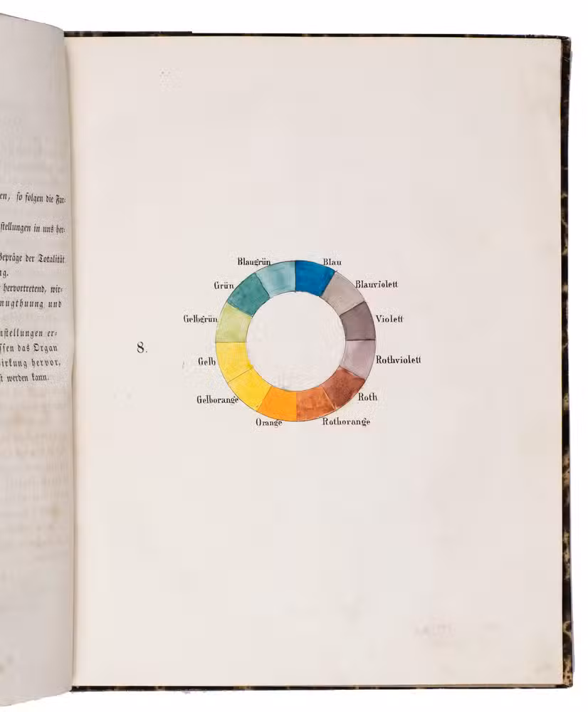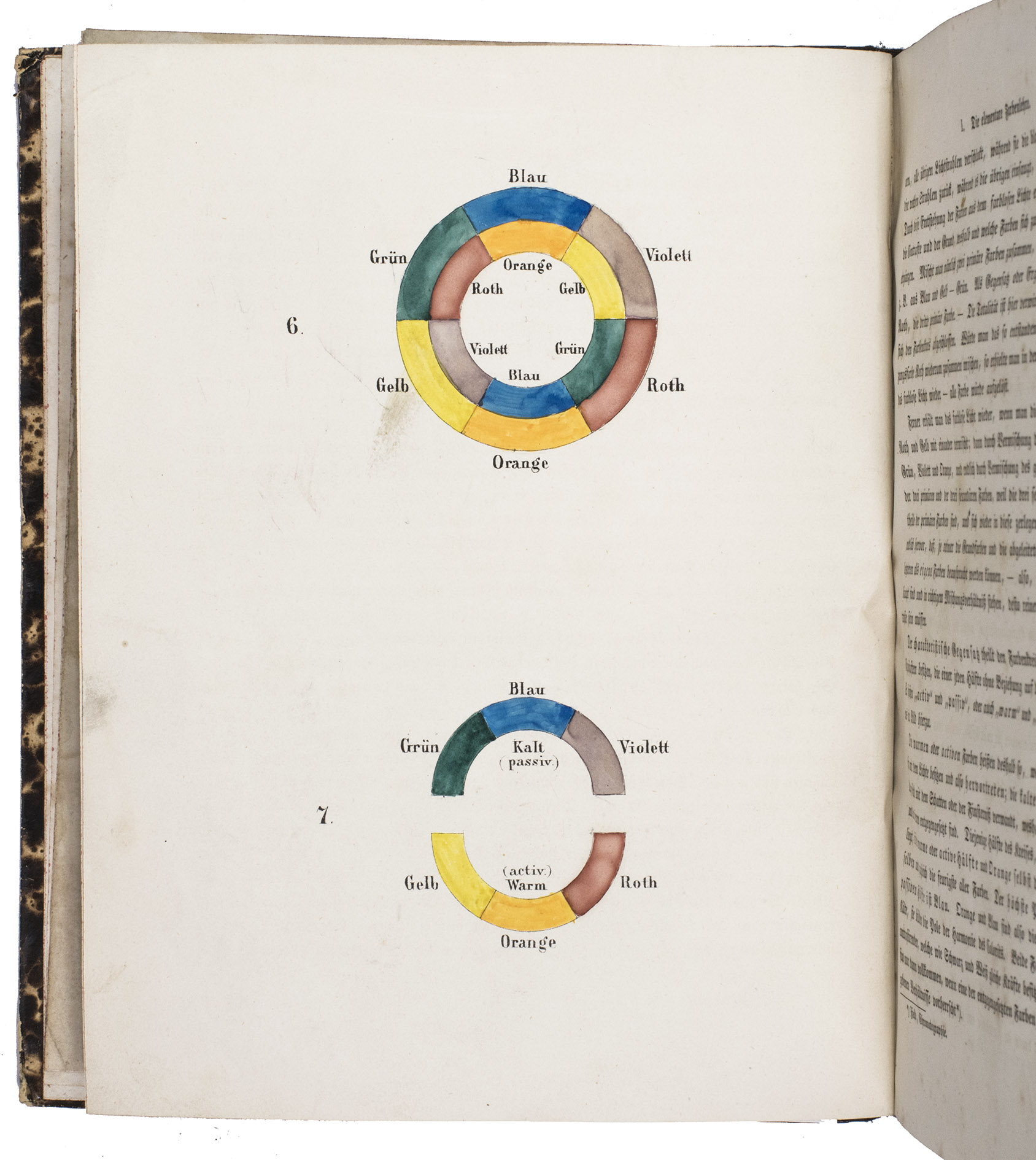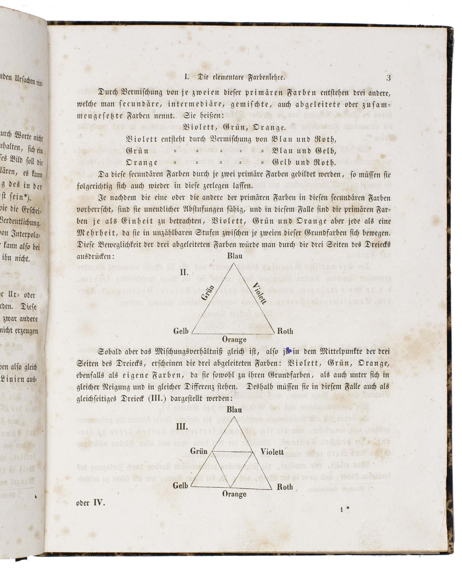 Jena, Friedrich Frommann, 1853. Small 4to (ca. 23 x 18.5 cm). With 7 variant diagrams of the colour spectrum printed on 4 full-page plates, all richly coloured by hand. Contemporary quarter black cloth. IX, [3], 68 pp.