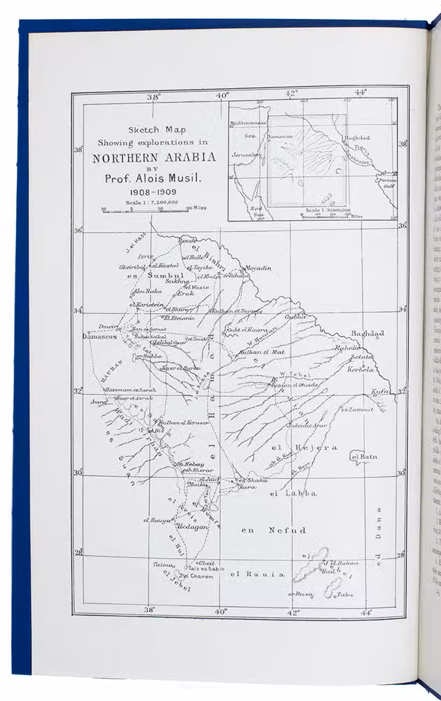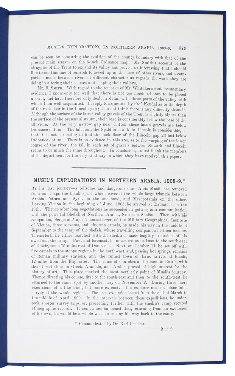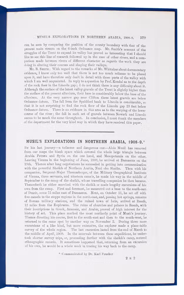 Abstract from The geographical journal, no. 5, vol. XXXV. Summary by Karl Peucker (1859-1940) of multiple journeys by famous explorer Alois Musil (1868-1944), illustrated with a "sketch map" of the area between Damascus and Baghdad.
