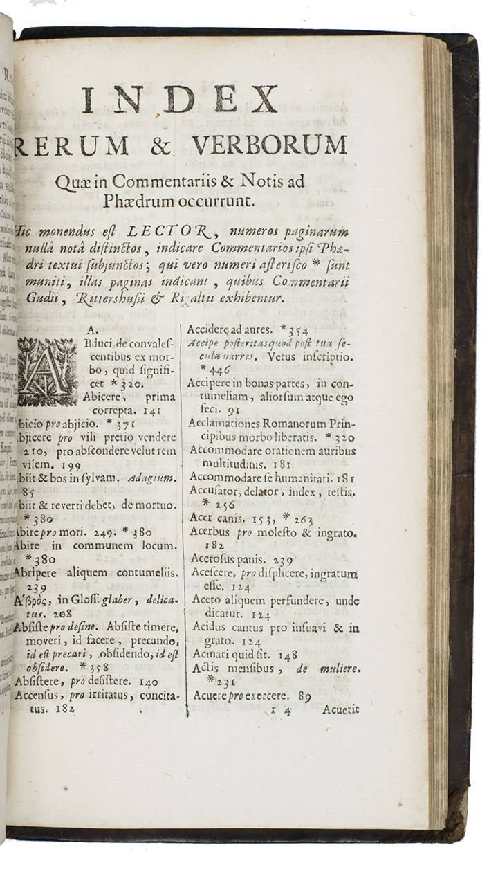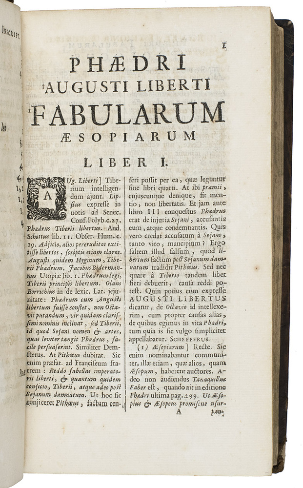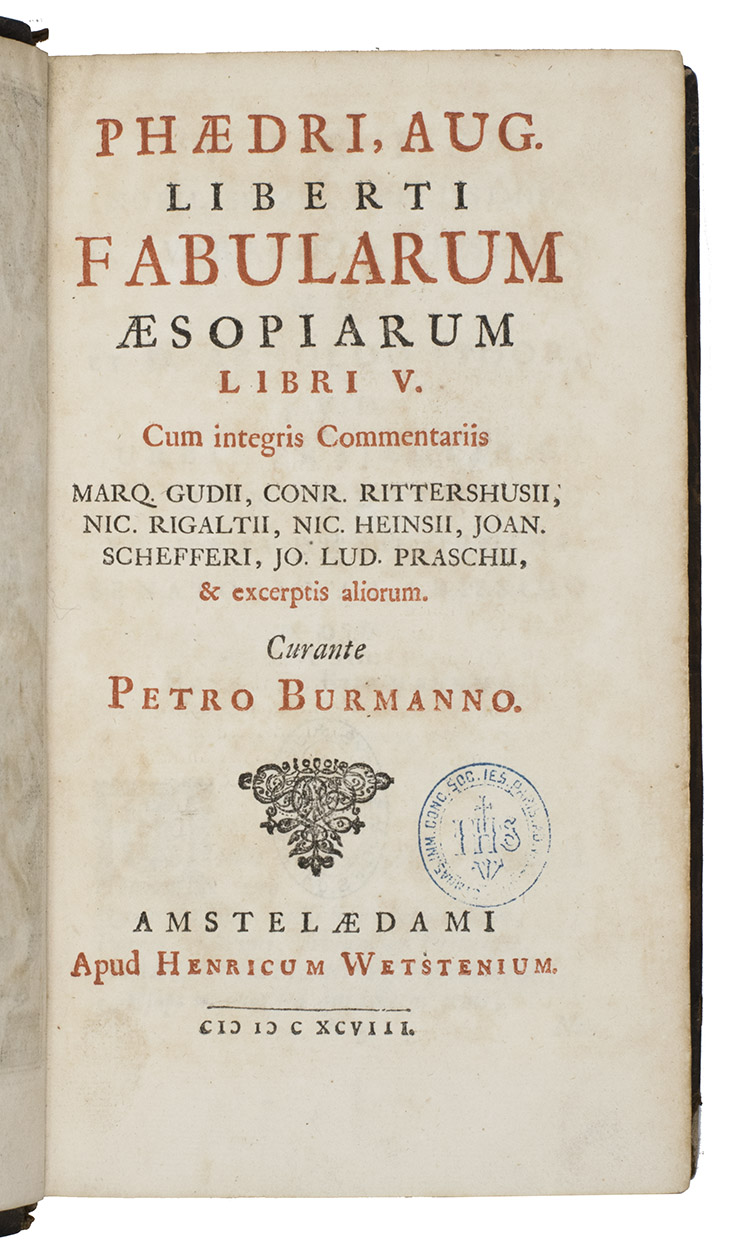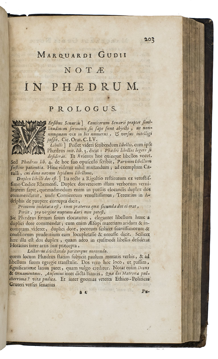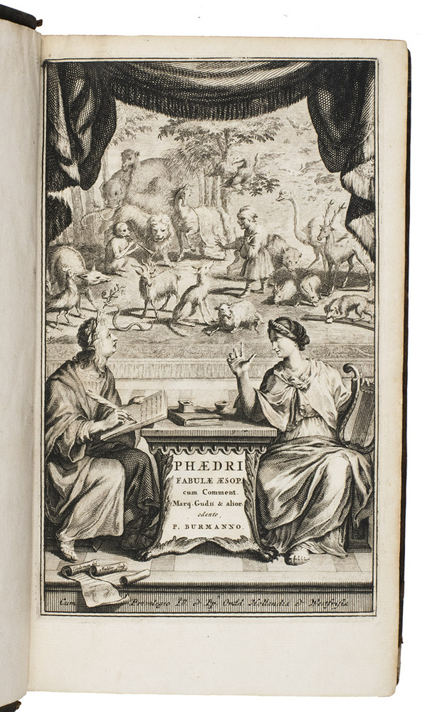 First edition of the important Burman redaction of Phaedruss Latin verse translation of Aesop, together with the important commentaries and notes by (1) Marquatus Gudius (1635-1686), with four new fables discovered by him, published here for the first time. His correspondence (edited by Burman, 1697) is the most important authority for the events of Gude's life, besides containing valuable information on the learning of the times; (2) Conradus Ritterhusius (1560-1613), Professor of Law at Altdorf and editor of classical texts; (3) Nic. Rigaltius (1577-1654, a French classical scholar who prepared annotated editions of Martial, Juvenal and others, in addition to Phaedrus. He was librarian to Louis XIII; (4) The famous Dutch classical scholar Nicolaus Heinsius (1620-1681), son of Daniël Heinsius and one of the purest and most elegant of Latinists of the Dutch golden age; (5) Joannes Scheffer (1621-1679), one of Swedens most important philologists; and (6) Johannes Ludivicus Praschius (1637-1690), a magistrate at Regensburg who had published his notes on Phaedrus in 1660. Burman was more compiler than critic, but his commentaries show immense learning and accuracy.