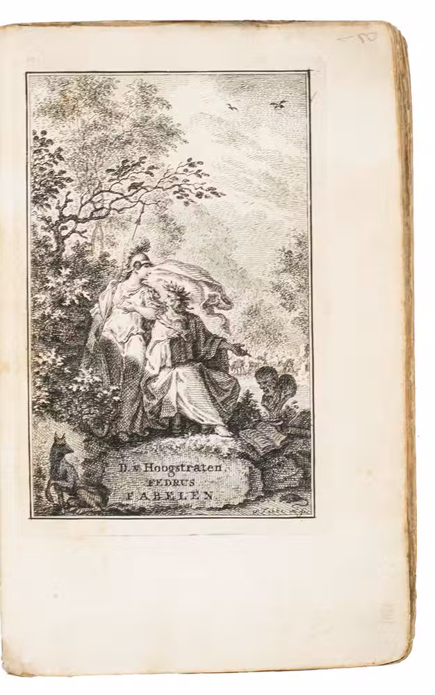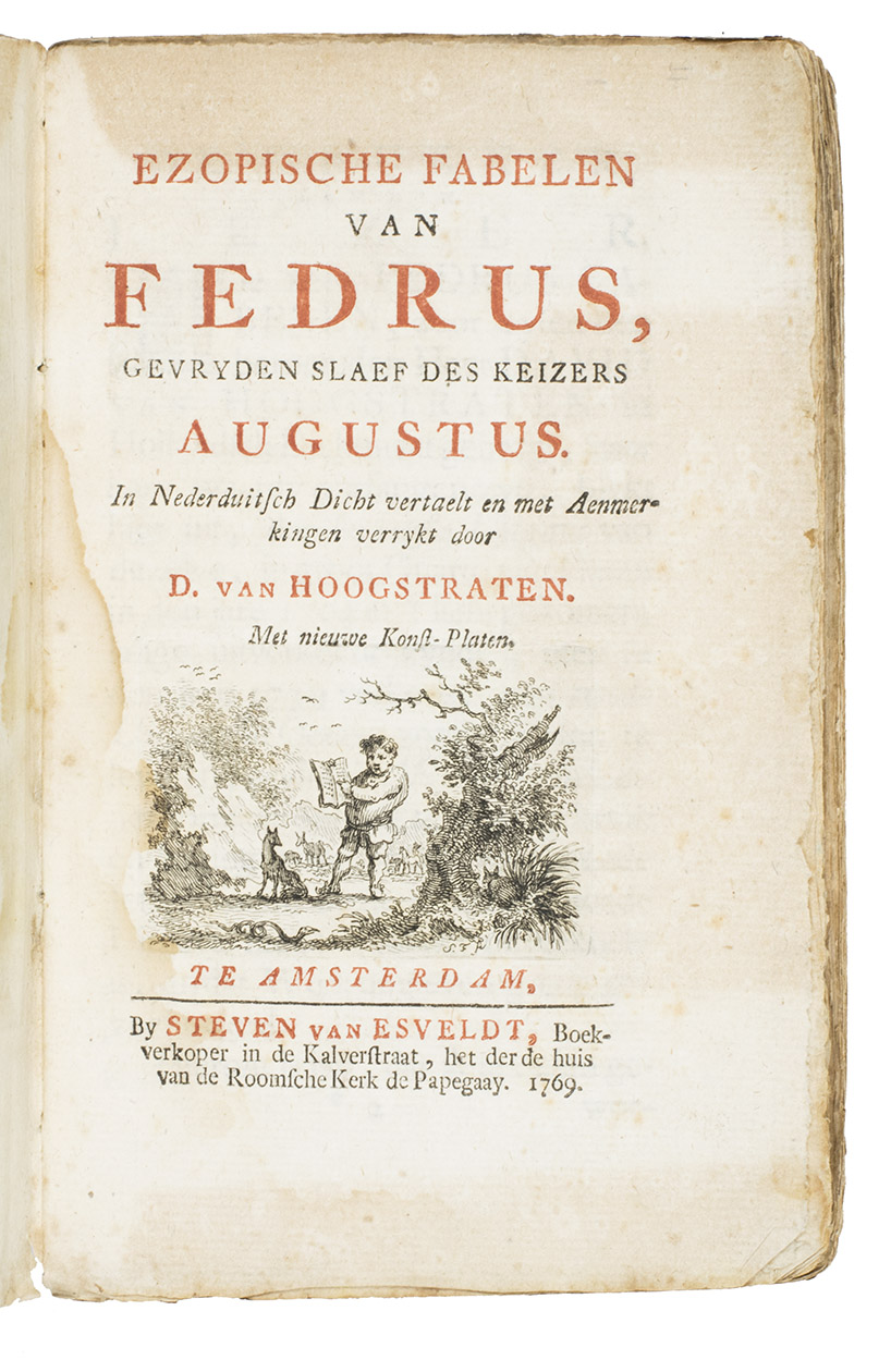 Third(?) edition of David van Hoogstraten Dutch verse translation of Phaedruss fables. Van Hoogstraten (1658-1724), prorector of the Amsterdam Latin School and prolific Dutch and Neo-Latin poet, was an esteemed linguist and philologist who edited the works of a number of classical authors. His annotated Latin Phaedrus edition of 1701 is considered his masterpiece. The first edition of the elegant translation was published in 1703 (reissue 1704); the second in 1739 (reissued 1753). A 1716 Dutch edition doesnt mention Van Hoogstraten and may be a different translation or a piracy (a 1766 edition appears to follow it).
