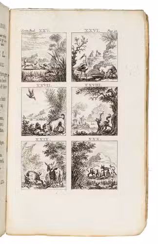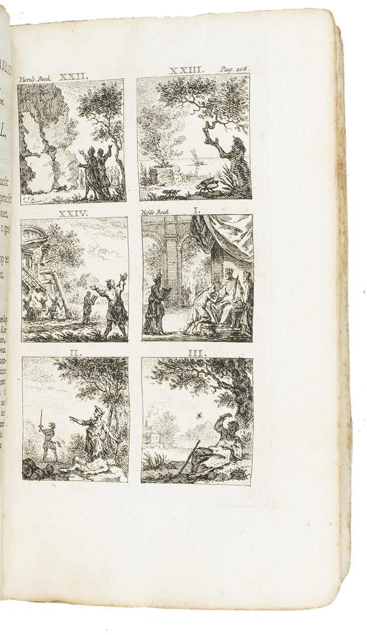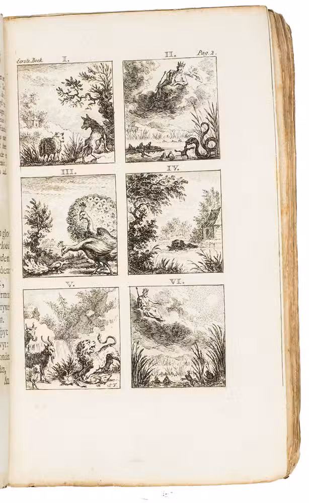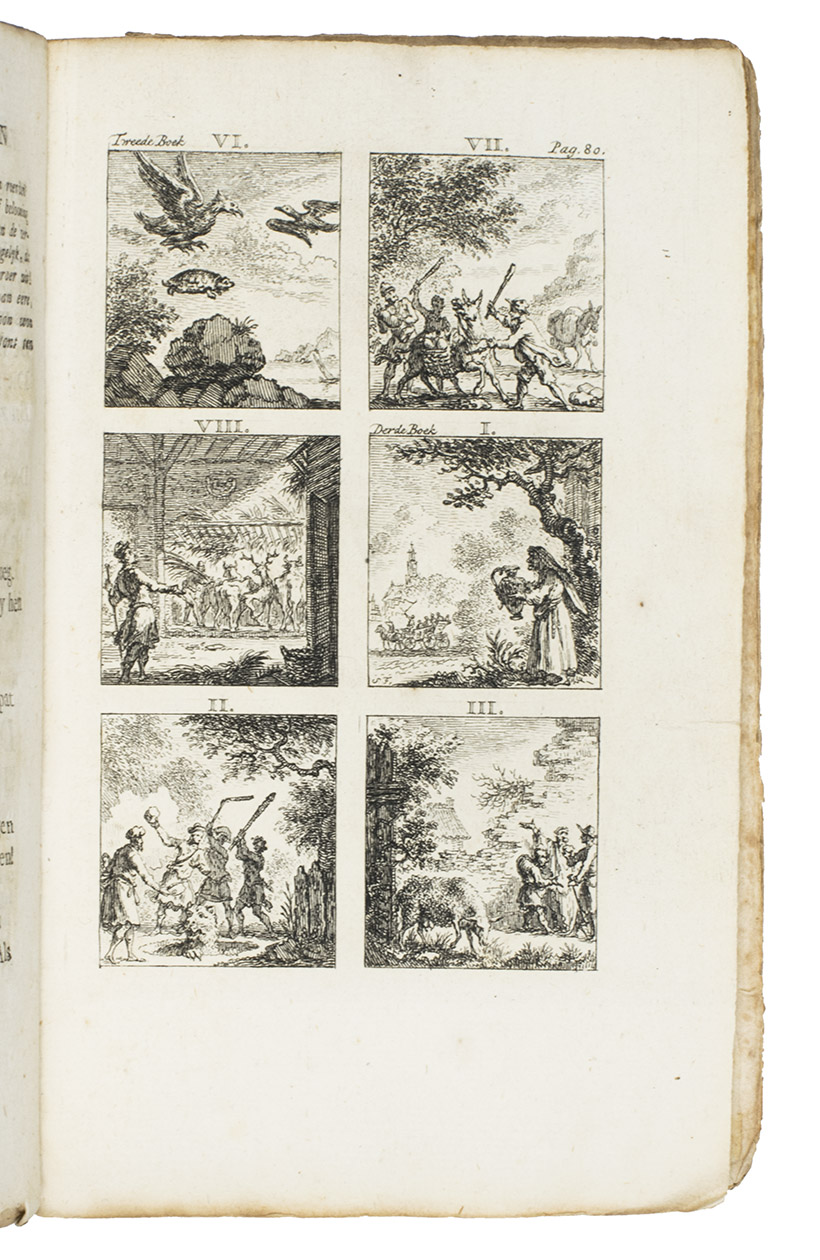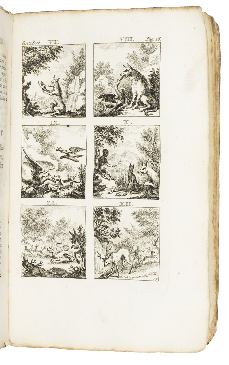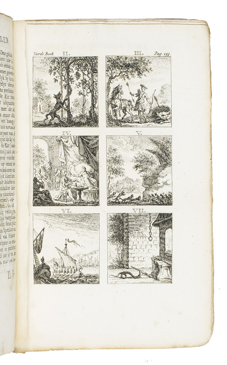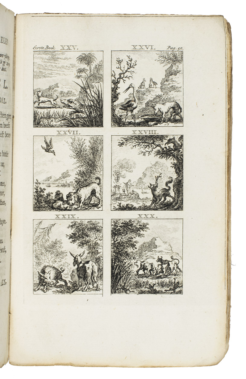Amsterdam, Steven van Esveldt, 1769. 8vo. Title-page in red and black, with an engraved frontispiece by Simon Fokke and a vignette on title-page, and 16 engraved plates with 6 fable illustrations each, also by Fokke, mostly after the illustrations for the first Latin Hoogstraten edition (1701) by Jan van Vianen. Contemporary boards covered with sprinkled paper, manuscript spine label. [50], 259, [1 blank], [28] pp.