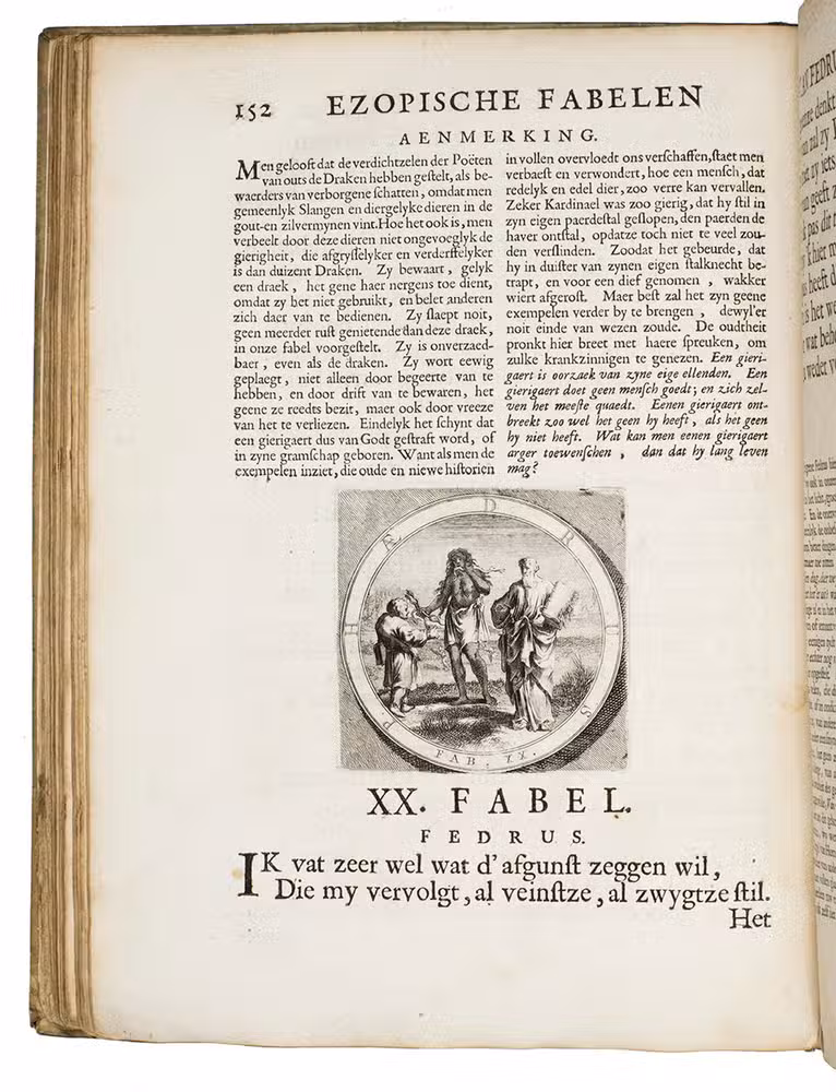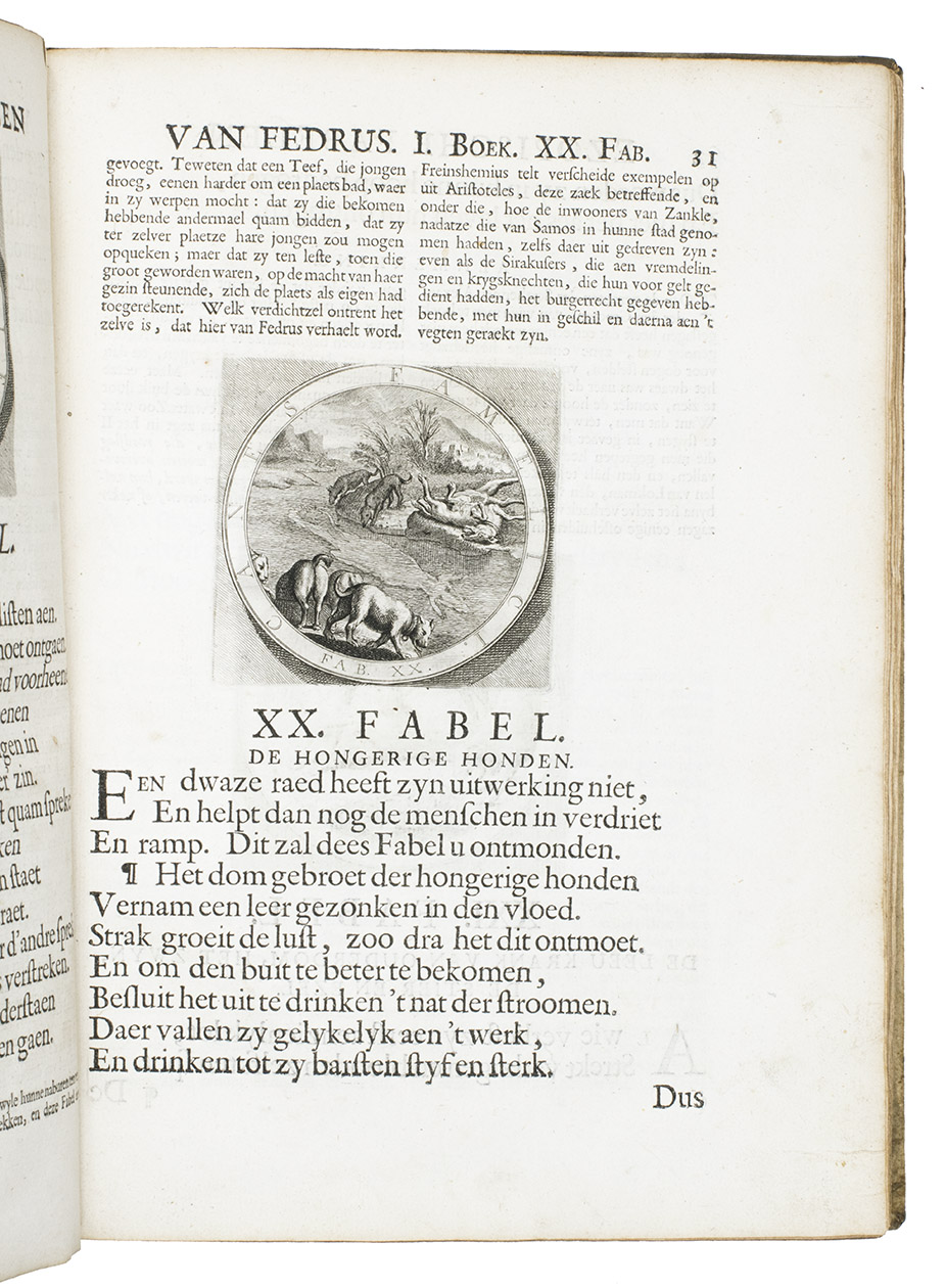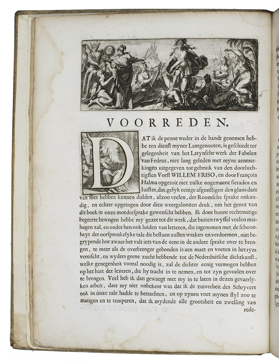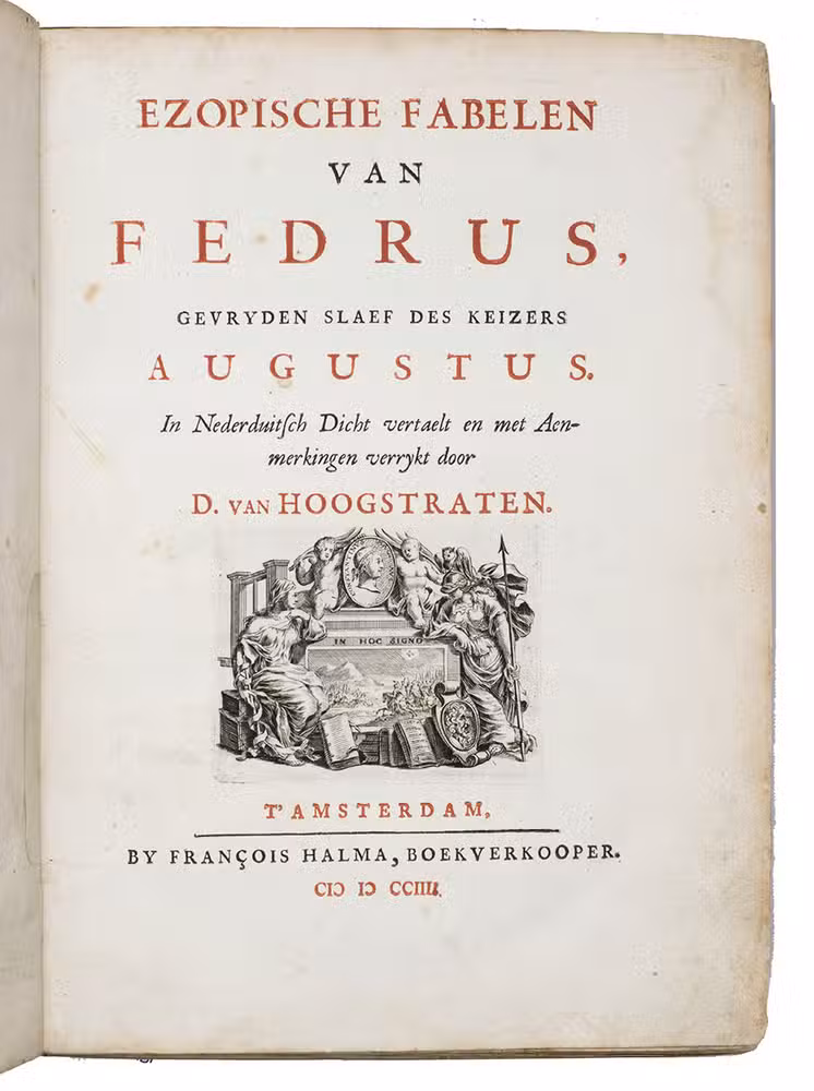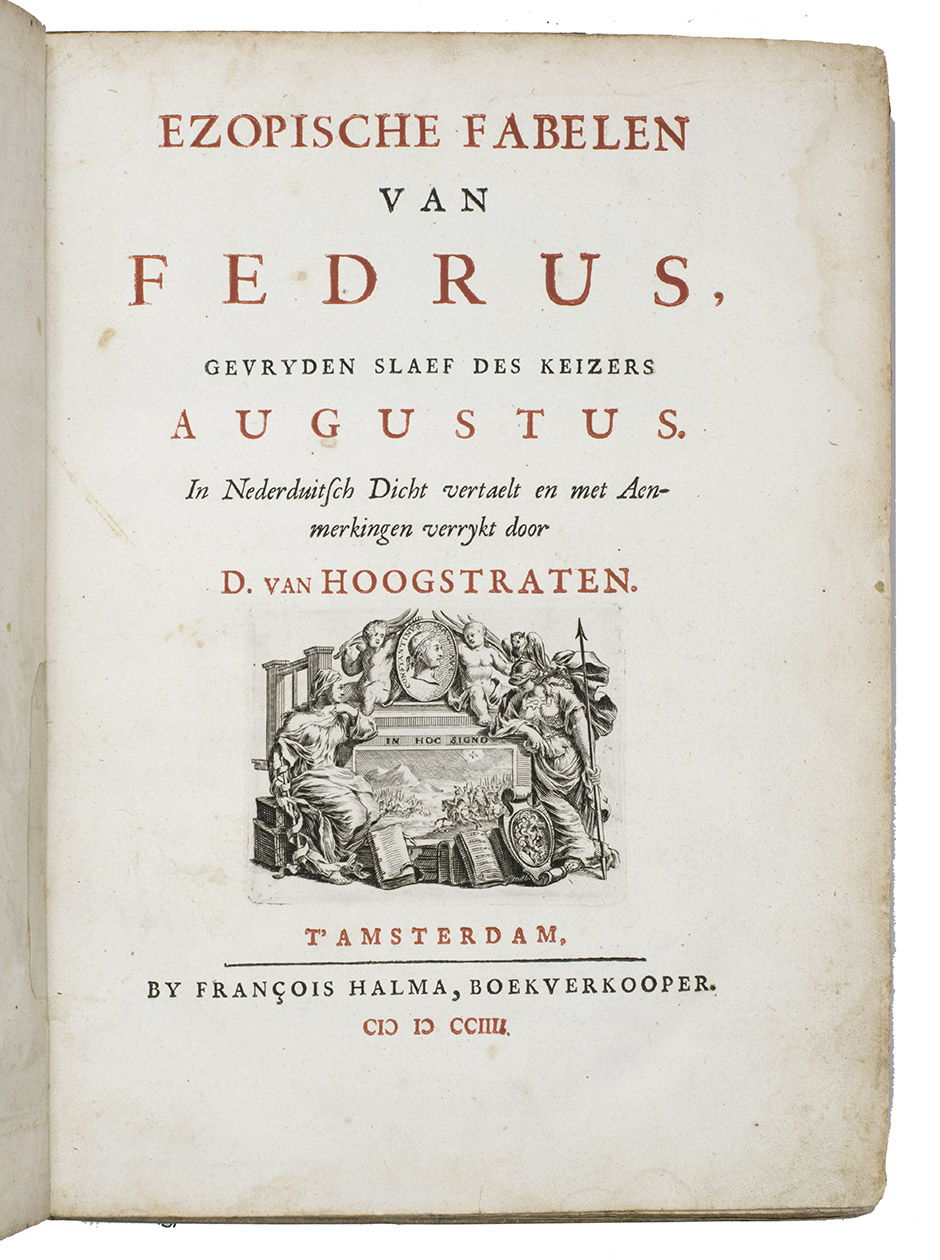 Beautiful first edition of the translation into Dutch by the editor David van Hoogstraten of the 94 Aesop fables with the 5 additional fables found by the German philologist and classical scholar Marquart Gudius, together with his moral commentaries (instead of his scholarly notes and annotations for the Latin edition of 1701, printed in two columns underneath each fable. David van Hoogstraten (1658-1724) was the conrector of the Latin School of Amsterdam (1694-1722). Apart from being a prolific Dutch and neo-Latin poet, he was an esteemed linguist and philologist who edited a number of classical authors. His Phaedrus edition of 1701 is considered his masterpiece.