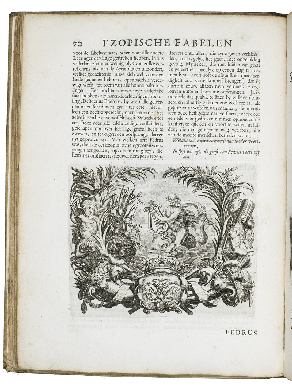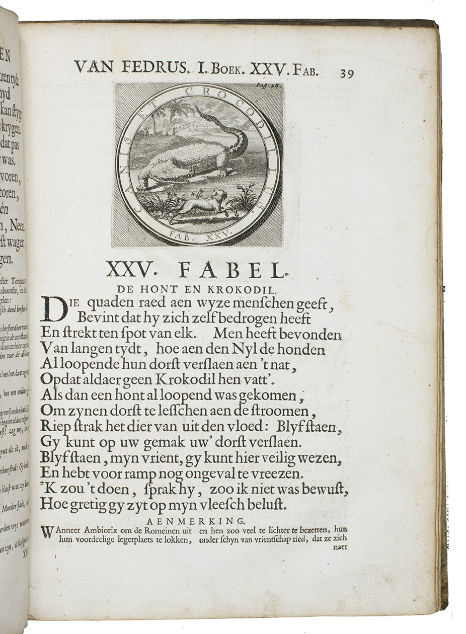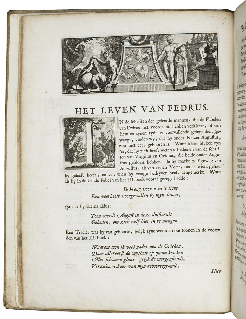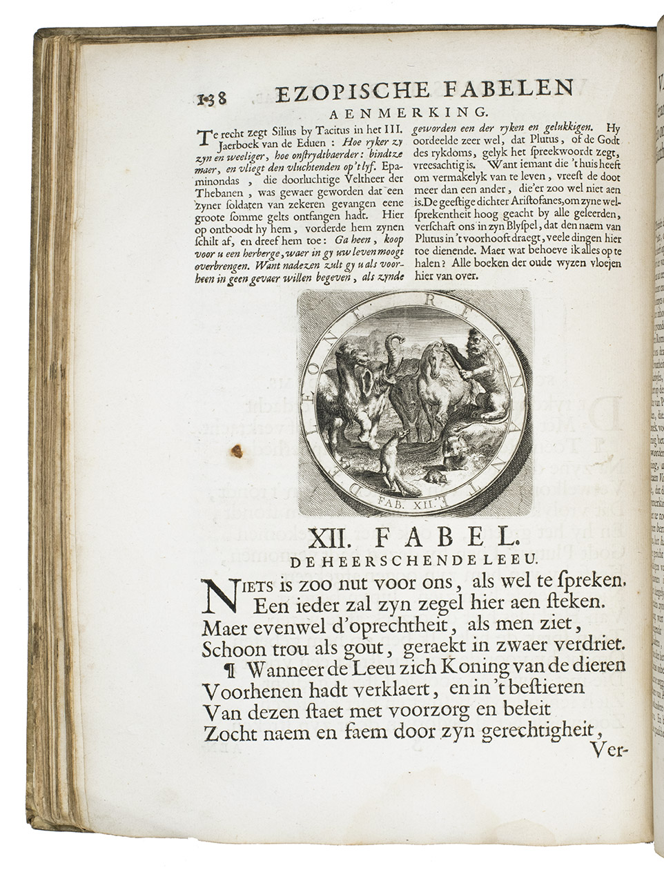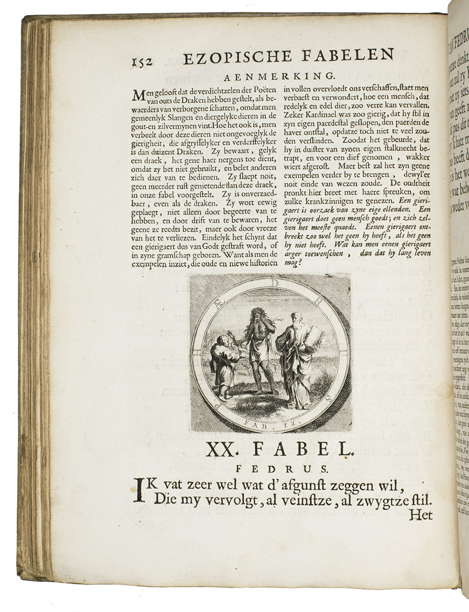 Beautiful first edition of the translation into Dutch by the editor David van Hoogstraten of the 94 Aesop fables with the 5 additional fables found by the German philologist and classical scholar Marquart Gudius, together with his moral commentaries (instead of his scholarly notes and annotations for the Latin edition of 1701, printed in two columns underneath each fable. David van Hoogstraten (1658-1724) was the conrector of the Latin School of Amsterdam (1694-1722). Apart from being a prolific Dutch and neo-Latin poet, he was an esteemed linguist and philologist who edited a number of classical authors. His Phaedrus edition of 1701 is considered his masterpiece.