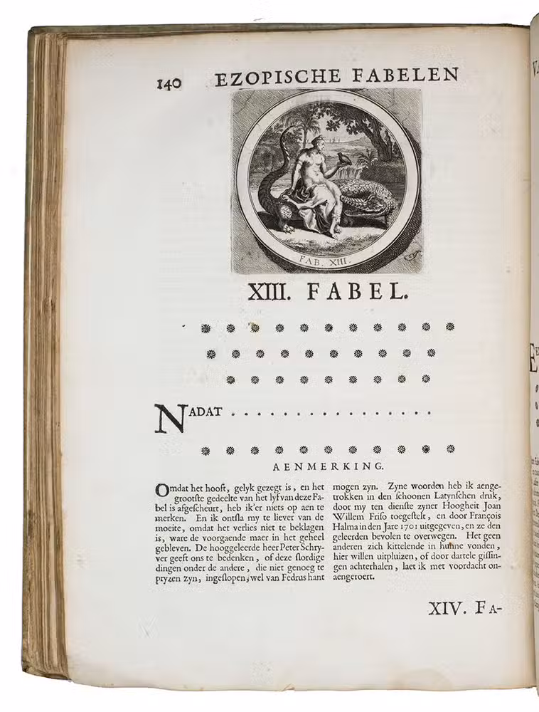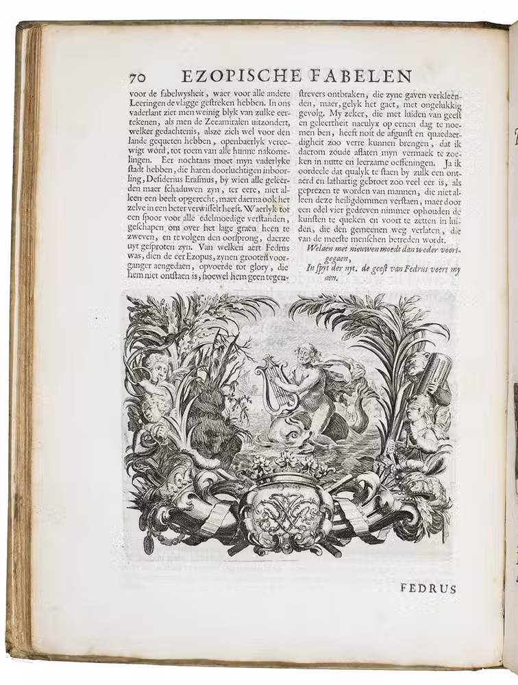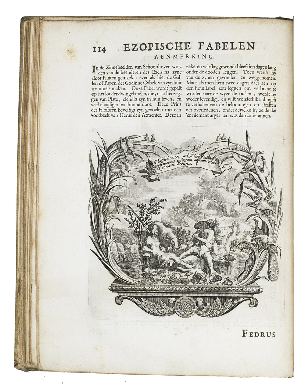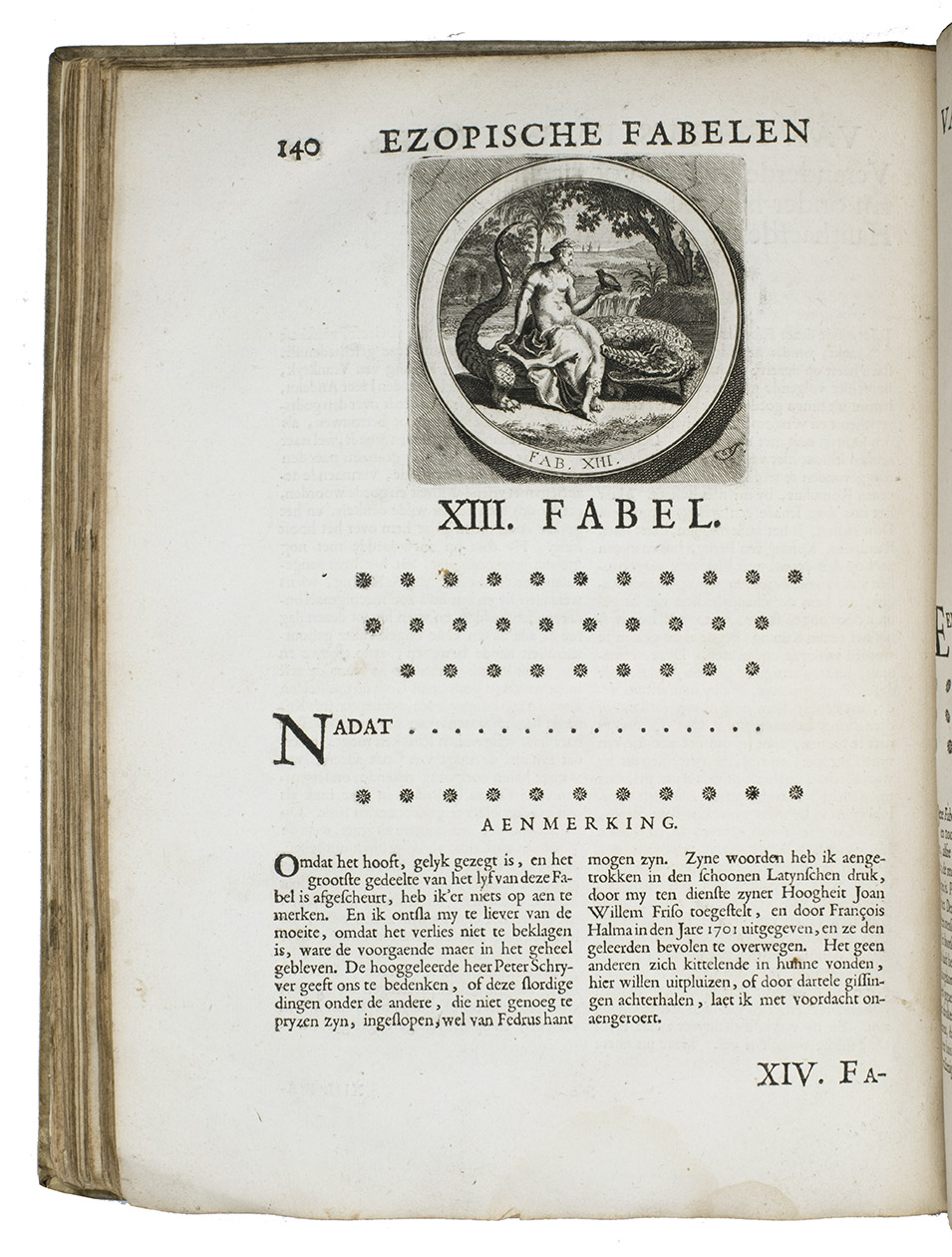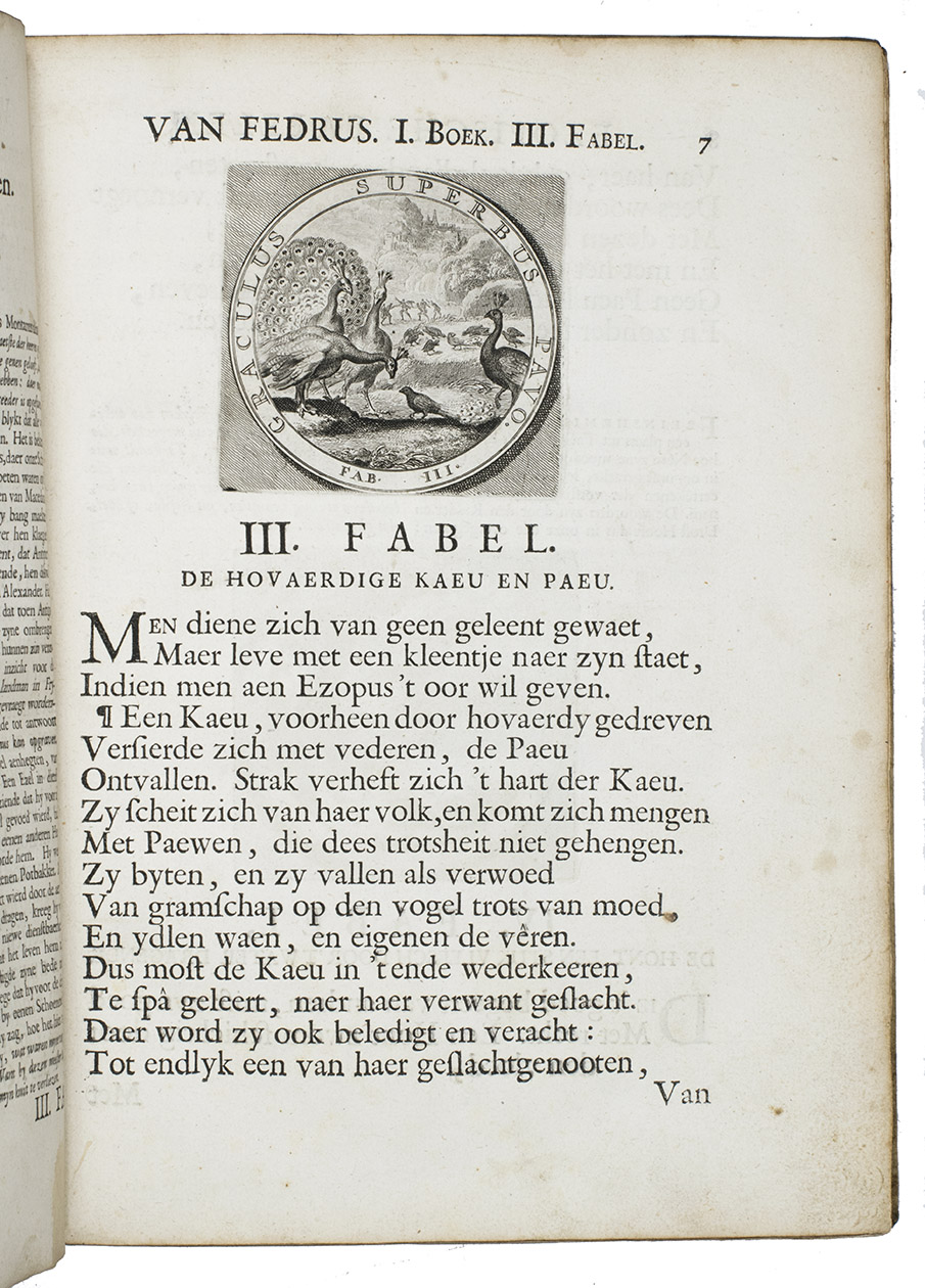 Beautiful first edition of the translation into Dutch by the editor David van Hoogstraten of the 94 Aesop fables with the 5 additional fables found by the German philologist and classical scholar Marquart Gudius, together with his moral commentaries (instead of his scholarly notes and annotations for the Latin edition of 1701, printed in two columns underneath each fable. David van Hoogstraten (1658-1724) was the conrector of the Latin School of Amsterdam (1694-1722). Apart from being a prolific Dutch and neo-Latin poet, he was an esteemed linguist and philologist who edited a number of classical authors. His Phaedrus edition of 1701 is considered his masterpiece.